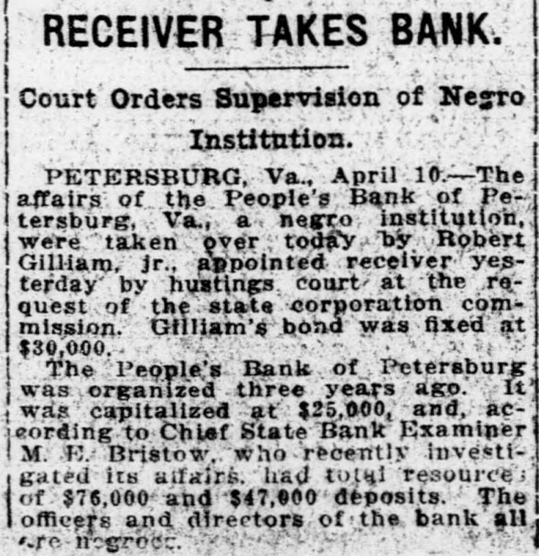 RECEIVER TAKES BANK. Court Orders Supervision of Negro Institution. PETERSBURG, Va., April 10.-The affairs of the People's Bank of Petersburg, Va., a negro institution, were taken over today by Robert Gilliam, jr., appointed receiver yesterday by hustings court at the request of the state corporation commission. Gfiliam's bond was fixed at $30,000. The People's Bank of Petersburg was organized three years ago. It was capitalized at $25,000, and, according to Chief State Bank Examiner M. E. Bristow. who recently investigated its affairs. had total resource of $76,000 and $47,000 deposits. The officers and directors of the bank all are nogreec.