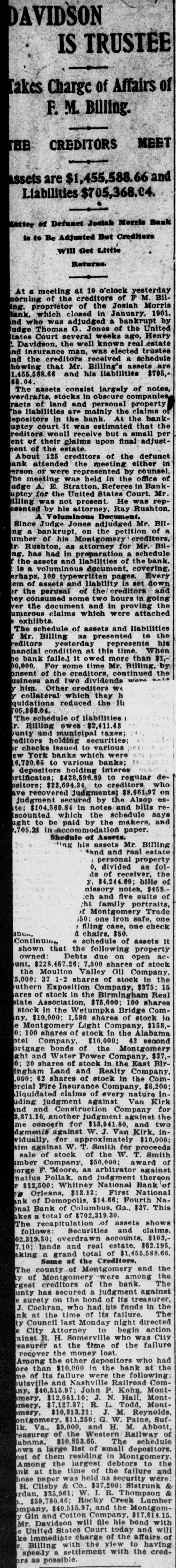 TRUSTEE SI Takes Charge of Affairs of Billion W it MEET CREDITORS EHE assets are $1,455,588.66 and Liabilities $705,368.04. Matter of Defunct Josish Morris Bank is to Be Adjusted But Creditors surit 100 IIIM Returns. At a meeting at 10 o'clock yesterday -118 W J 10 creditors the JO ing. proprietor of the Josiah Morris Bank. which closed in January, 1901, kq bankrupt B persphipe SBM оцм put Pettun eur JO seuor 'D Thomas expn tates Court several weeks ago, Henry Davidson, the well known real estate and insurance man, was elected trustee nd the creditors received a schedule howing that Mr. Billing's assets are 1,455,588.66 and his liabilities $705.04. 89 The assets consist largely of notes, verdrafts. stocks in obscure companies racts of land and personal property 10 clalms the mainthy 0.18 eq, epositors in the bank. At the bankuptcy court it was estimated that the reditors woull receive but a small per ent of their claims upon final adjustnent of the estate. About 125 creditors of the defunct ank attended the meeting either in erson or were represented by counsel. JO oTee the up held SEM meeting eu, Bank up Referee Stratton a V e2pn uptcy for the United States Court. Mr. filling was not present. He was repesented by his attorney. Ray Rushton. A Voluminous Document. Since Judge Jones adjudged Mr. BilB JO petition the uo bankrupt B zu umber of his Montgomery creditors, Ir. Rushton, as attorney for Mr. Bilschedule B up pey has 'Su bank the JO 1 pus assets the is a voluminous document, covering. erhaps, 100 typewritten pages. Every имор 108 8] 11 pue assets JO we pue creditors the 10 [usnued the 10 Sujos u; house OM1 emos peursuco Aeu ver the document and in proving the umerous claims which were attached S oxhibite The schedule of assets and liabilities Mr. Billing as presented to the reditors yesterday represents his nancial condition at this time When -'IS than толе peMo 41 Failer Hueq eu 00,000. For some time Mr. Billing, by onsent of the creditors, continued the FIVE OM1 pue y him. Other creditors We y collateral which they h " ene Peonded The schedule of liabilities Ir. Billing owes $2,411.43 :sexe) pus Ajuno reditors holding securities: or checks issued to various ew York banks which were 16,730.65 to various banks; you depositors holding interes ertificates: $428,596.89 to regular deoum creditors 07 $22696484 uo recoverd a -se Allope our 4q services -es pus notes up 1011 Iscounted which the schedule says pus malkers the sq pied eq 07 1480 0,705.21 in accommodation paper. Shedule of Assets. "ing his assets Mr. Billing extate Tax pus puu, personal property -101 se POPLAID '0 the receber JO sp JO "1119 's nissory notes, $458.ch and five suits of :ht family portraits, of Montgomery Trade euo safe, uos, euo :09 check euo case, Sujjy "oun 095 challs P # steese 10 schedule e Continuing shown that the following property owned: Debts due on open acunt, $228, 457.26; 7,500 shares of stock the Moulton Valley on Company, the up stools 10 shares 1-1 28 :000's outhern Exposition Company, $375; 15 ares of stock in the Birmingham Real state Association, $75,000: 100 shares stock in the Wetumpka Bridge Comup stock 10 shares 089'T :000'0T$ 'Au e Montgomery Light Company, $158,Alabama the us Moors JO shares 001 :0 puobes 24 :000'0T$ Company, 1010 ortgage bonds of the Montgomery ght and Water Power Company, $37.0; 20 shares of stock In the East BirIngham Land and Realty Company, Com- the up stock JO shares 29 :000' ercial Fire Insurance Company, $6,200: liquidated claims of every nature Inuding judgment against Van Kirk and and Construction Company for 3,371.10. another judgment against the me concern for $13,941.80 and two -up MIN UBA T 'M isujese vidually, for approximately $10,000; aim against W. T. Smith for proceeds Shitth L 'M the 10 stock jo sale imber Company, $50,000; award of eorge F Moore, as arbitrator against natius Pollak, and judgment thereon r $12,500: Whitney National Bank of . Orleans, $13.13; First National -UN Month $14.66 JO Hut onal Bank of Columbus, Ga., $27. This 10 18201 B ales The recapitulation of assets shows follows: Securities and claims. $ 8018 accounts 0281980 7.10; lands and real estate, $62.195. aking a grand total of $1,455,588.66. the 10 emos The county of Montgomery and the ty of Montgomery were among the rgest creditors of the bank. The unty has secured a judgment against treasurer 811 10 puoq the uo Aleans a #41 up spunj 411 рец oum Cochran T The Tallure sap 10 thin the 18 Mu ty Council last Monday night directed e City Attorney to begin action rainst R H. Somerville who was City easurer at the time of the failure recover the money lost. Among the other depositors who had the 18 bank the up 000'01$ than ejo the Grea Januare JO me buisville and Nashville Railroad Comny, $40,515.97 John P. Kohn, Montmery. $12,061.10 J. N. Hall, Montmery, $7,127.87; R. L. Todd, Mont mery, $10,313.21: J. M. Reynolds, ontgomery, $11,250 G. W. Paine, Suf. Abbbtr W H pus 000'6$ "BA "MI reasurer of the Western Railway of labama, $10,853.65 The schedule ows a large list of small depositors. ost of them residing in Montgomery. Among the iargest debtors to the pue Jallure the JO thing the 18 Mut hose paper was held as security were H. Clisby & Co., $37,200: Sistrunk &