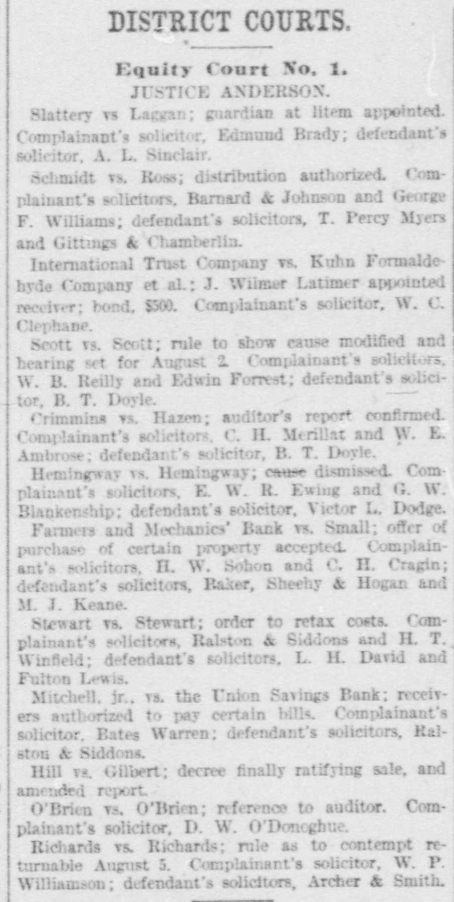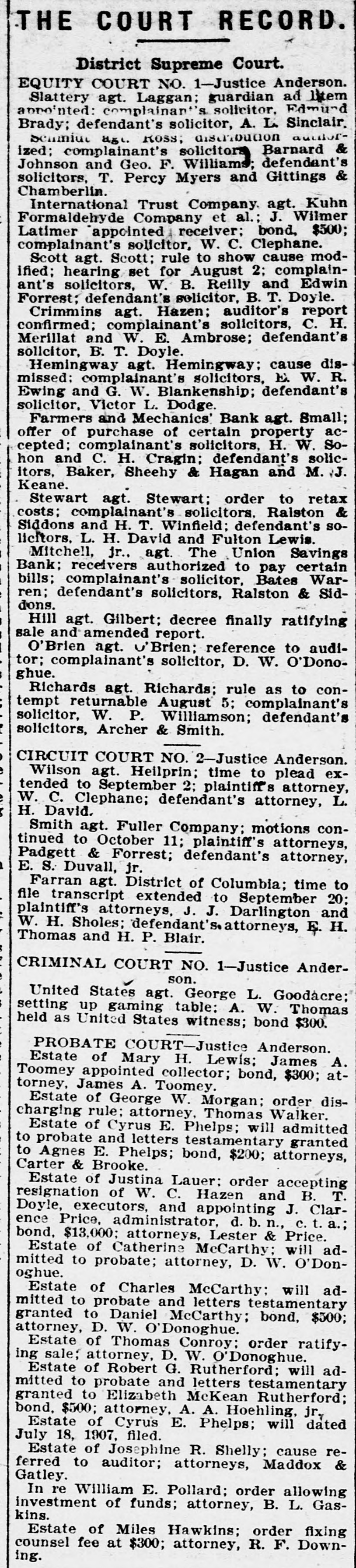 THE COURT RECORD. District Supreme Court. EQUITY COURT NO. 1-Justice Anderson. Slattery agt. Laggan; guardian ad litem appointed: complainant's solicitor, Edmund Brady; defendant's solicitor, A. L. Sinclair. Scumidt agt. Ross; distribution author- ized; complainant's solicitors Barnard & Johnson and Geo. F. Williams; defendant's solicitors, T. Percy Myers and Gittings & Chamberlin. International Trust Company, agt. Kuhn - Formaldehyde Company et al.; J. Wilmer Latimer appointed receiver; bond, $500; complainant's solicitor, W. C. Clephane. Scott agt. Scott; rule to show cause mod- ified; hearing set for August 2; complain- ant's solicitors, W. B. Reilly and Edwin Forrest; defendant's solicitor, B. T. Doyle. Crimmins agt. Hazen; auditor's report confirmed; complainant's solicitors, C. H. Merillat and W. E. Ambrose; defendant's solicitor, B. T. Doyle. Hemingway agt. Hemingway; cause dis- missed; complainant's solicitors, E. W. R. Ewing and G. W. Blankenship; defendant's solicitor, Victor L. Dodge. Farmers and Mechanics' Bank agt. Small; offer of purchase of certain property ac- cepted; complainant's solicitors, H. W. So- hon and C. H. Cragin; defendant's solic- itors, Baker, Sheehy & Hagan and M. J. Keane. Stewart agt. Stewart; order to retax costs; complainant's solicitors, Ralston & Siddons and H. T. Winfield; defendant's so- licitors, L. H. David and Fulton Lewis. Mitchell, jr., agt. The Union Savings Bank; receivers authorized to pay certain bills; complainant's solicitor, Bates War- ren; defendant's solicitors, Ralston & Sid- dons. Hill agt. Gilbert; decree finally ratifying sale and amended report. O'Brien agt. O'Brien; reference to audi- tor; complainant's solicitor, D. W. O'Dono- ghue. Richards agt. Richards; rule as to con- tempt returnable August 5; complainant's solicitor, W. P. Williamson; defendant's solicitors, Archer & Smith. CIRCUIT COURT NO. 2-Justice Anderson. Wilson agt. Heilprin; time to plead ex- tended to September 2; plaintiffs attorney, W. C. Clephane; defendant's attorney, L. H. David. Smith agt. Fuller Company; motions con- tinued to October 11; plaintiff's attorneys, Padgett & Forrest; defendant's attorney, E. S. Duvall, jr. Farran agt. District of Columbia; time to file transcript extended to September 20; plaintiff's attorneys, J. J. Darlington and W. H. Sholes; defendant's attorneys, E. H. Thomas and H. P. Blair. CRIMINAL COURT NO. 1-Justice Ander- son. United States agt. George L. Goodacre; setting up gaming table: A. W. Thomas held as United States witness; bond $300. PROBATE COURT-Justice Anderson. Estate of Mary H. Lewis; James A. Toomey appointed collector; bond, $300; at- torney, James A. Toomey. Estate of George W. Morgan; order dis- charging rule; attorney, Thomas Walker. Estate of Cyrus E. Phelps; will admitted to probate and letters testamentary granted to Agnes E. Phelps; bond, $200; attorneys, Carter & Brooke. Estate of Justina Lauer; order accepting resignation of W. C. Hazen and B. T. Doyle, executors, and appointing J. Clar- ence Price, administrator, d. b. n., c. t. a.; bond, $13,000; attorneys, Lester & Price. Estate of Catherine McCarthy; will ad- mitted to probate; attorney, D. W. O'Don- oghue. Estate of Charles McCarthy; will ad- mitted to probate and letters testamentary granted to Daniel McCarthy; bond, $500; attorney, D. W. O'Donoghue. Estate of Thomas Conroy; order ratify- ing sale; attorney, D. W. O'Donoghue. Estate of Robert G. Rutherford; will ad- mitted to probate and letters testamentary granted to Elizabeth McKean Rutherford; bond, $500; attorney, A. A. Hoehling, jr., Estate of Cyrus E. Phelps; will dated July 18, 1907, filed. Estate of Josephine R. Shelly; cause re- ferred to auditor; attorneys, Maddox & Gatley. In re William E. Pollard; order allowing investment of funds; attorney, B. L. Gas- kins. Estate of Miles Hawkins; order fixing counsel fee at $300; attorney, R. F. Down- ing.