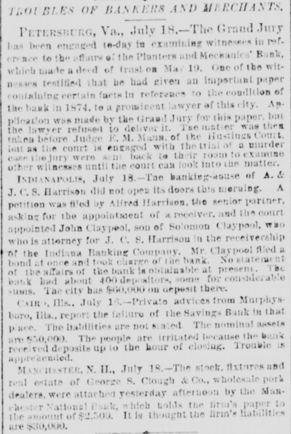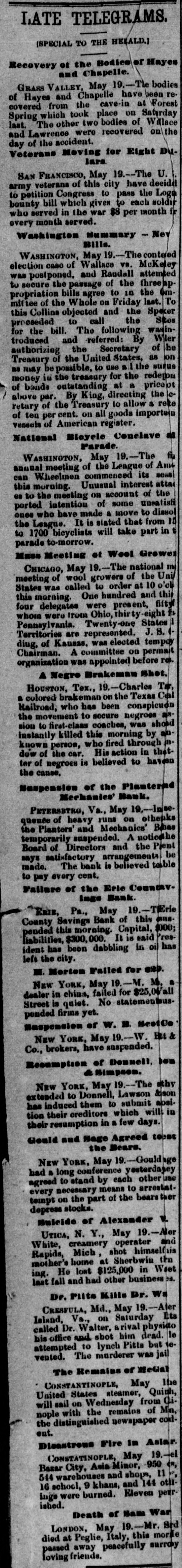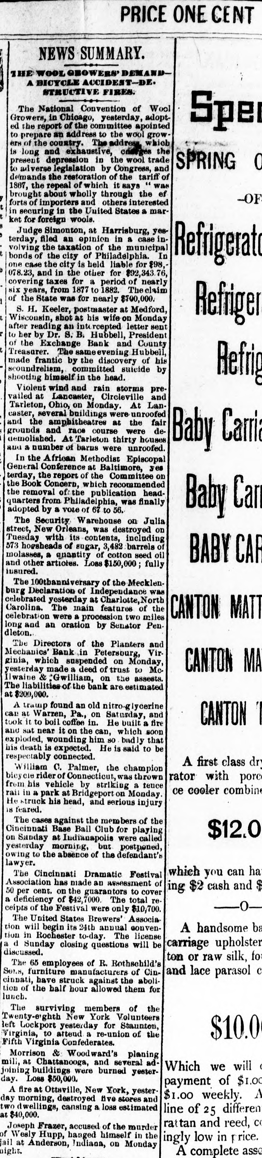 PRICE ONE CENT NEWS SUMMARY. THE WOOL GROWERS' DEMANDA BICYCLE ACCIDENT-DE. STRUCTIVE FIRES. The National Convention of Wool Growers, in Chicago, yesterday, adopted the report of the committee apointed Spe to prepare an address to the wool growera of the country. The address which is long and exhaustive, charges the present depression in the wool trade SPRING 0 to adverse legislation by Congress, and demands the restoration of the tariff of 1867, the repeal of which it says was brought about wholly through the ef y -OF forts of importers and others interested t in securing in the United States a market for foreign wools. Judge Simonton, at Harrisburg, yesb terday, filed an opinion in a case involving the taxation of the municipal bonds of the city of Philadelphia. In Refrigerato one case the city is held liable for $98, e 078.23, and in the other for $92,343.76, covering taxes for a period of nearly six years, from 1877 to 1882. The claim of the State was for nearly $700,000. I S. H. Keeler, postmaster at Medford, t Wisconsin, shot at his wife on Monday Refrige after reading an into rcepted letter sent to her by Dr. S. B. Hubbell, President of the Exchange Bank and County t Treasurer. The same evening Hubbeii, made frantic by the discovery of his scoundrelism, committed suicide by shooting himself in the head. Refrig Violent wind and rain storms prevailed at Lancaster, Circleville and Tarleton, Ohio, on Monday. At Lan. easter, several buildings were unroofed and the amphitheatres at the fair grounds and race course were dedemolished. At Tarleton thirty houses and a number of barns were unroofed. Baby Carria In the African Methodist Episcopal General Conference at Baltimore, yes terday, the report of the Committee on the Book Concern, which recommended the removal of the publication headquarters from Philadelphia, was finally adopted by a vote of 67 to 56. Baby Can The Security Warehouse on Julia street, New Orleans, was destroyed on Tuesday with its contents, including 573 hogsheads of sugar, 3,482 barrels of molasses, a quantity of cotton seed oil BABY CAR and other articles. Loss $150,000 fully insured. The 100tbanniversary of the Mecklenburg Declaration of Independance was celebrated yesterday at Charlotte, North Carolina. The main features of the MATT CANTON celebration were a procession two miles long and an oration by Senator Pen dleton. The Directors of the Planters and Mechanics' Bank in Petersburg, Vir ginia, which suspended on Monday, MA CANTON yesterday made a deed of trust to McIlwaine & :Gwilliam, on the assests. The liabilities of the bank are estimated at $200,000. A tramp found an old hitro-glycerine can at Warren, Pa., on Saturday, and CANTON took it to boil coffee in. He built a fire and sat near it on the can, which soon exploded, wounding him so bid that his death is expected. He is said to be respectably connected. A first class dr William C. Palmer, the champion bicycle rider of Connecticut, was thrown rator with porc from his vehicle by striking a tence ce cooler combine rail in a park at Bridgeport on Monday He struck his head, and serious injury 18 feared. The cases against the members of the Cincinnati Base Ball Club for playing $12.0 on Sunday at Indianapolis were called yesterday morning, but postponed, owing to the absence of the defendant's lawyer. The Cincinnati Dramatic Festival which you can ha Association has made an assessment of ing $2 cash and $ 50 per cent. on the guarantors to cover a deficiency of $42,7000 The total re -0 ceipts of the Festival were only $10,700. The United States Brewers' Associa tion will begin its 24th annual convenA handsome ba tion in Rochester to-day. The license a d Sunday closing questions will be carriage upholster discussed. ton or raw silk, fo The 65 employees of R. Rothschild's Sens, furniture manufacturers of Cinand lace parasol c cinnati, have struck against the abolition of the half hour allowed them for lunch. The surviving members of the Twenty-eighth New York Volunteers left Lockport yesterday for Staunton, Virginia, to attend a re-union of the $10.0 Fifth Virginia Confederates. Morrison & Wood ward's planing mill, at Chattanooga, and several ad Which we will ( joining buildings were burned yesterday. Loss $50,000. payment of $1.00 A fire at Ottsville, New York, yester $1.00 weekly. A day morning, destroyed five stores and two dwellings, cansing a loss estimated line of 25 differen at $40,000. rattan and reed, C Joseph Frazer, accused of the murder of Wesly Hupp, hanged himself in the ingly low in price. jail at Anderson, Indiana, on Monday night. A complete asse