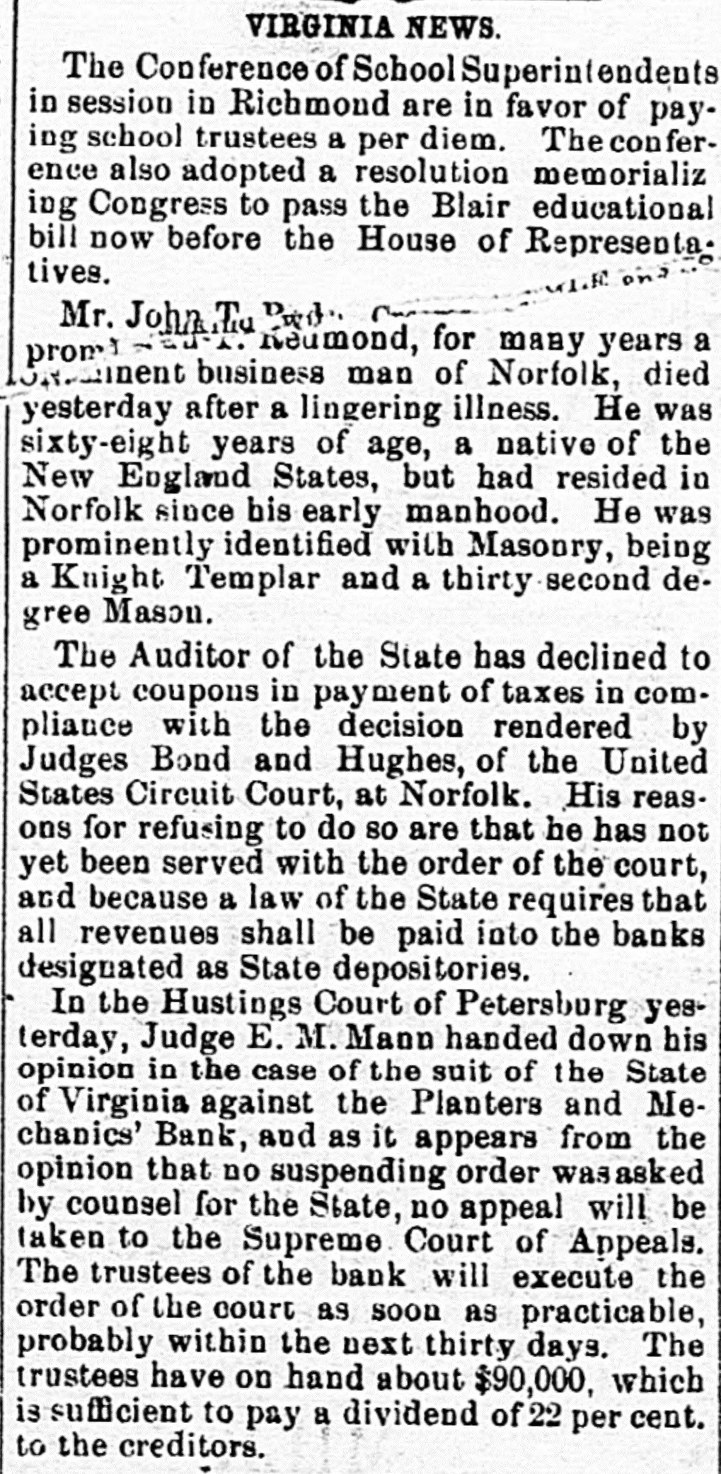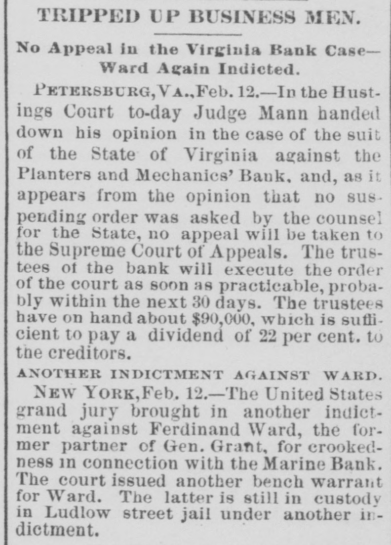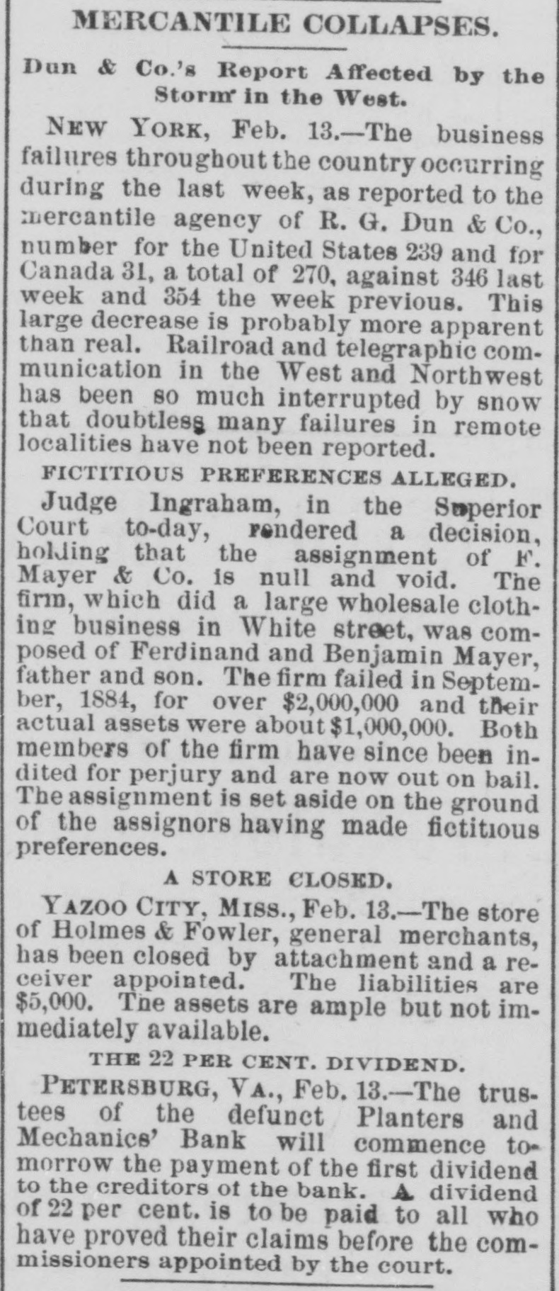 PRICE ONE CENT NEWS SUMMARY. THE WOOL GROWERS' DEMANDA BICYCLE ACCIDENT-DE. STRUCTIVE FIRES. The National Convention of Wool Growers, in Chicago, yesterday, adopted the report of the committee apointed Spe to prepare an address to the wool growera of the country. The address which is long and exhaustive, charges the present depression in the wool trade SPRING 0 to adverse legislation by Congress, and demands the restoration of the tariff of 1867, the repeal of which it says was brought about wholly through the ef y -OF forts of importers and others interested t in securing in the United States a market for foreign wools. Judge Simonton, at Harrisburg, yesb terday, filed an opinion in a case involving the taxation of the municipal bonds of the city of Philadelphia. In Refrigerato one case the city is held liable for $98, e 078.23, and in the other for $92,343.76, covering taxes for a period of nearly six years, from 1877 to 1882. The claim of the State was for nearly $700,000. I S. H. Keeler, postmaster at Medford, t Wisconsin, shot at his wife on Monday Refrige after reading an into rcepted letter sent to her by Dr. S. B. Hubbell, President of the Exchange Bank and County t Treasurer. The same evening Hubbeii, made frantic by the discovery of his scoundrelism, committed suicide by shooting himself in the head. Refrig Violent wind and rain storms prevailed at Lancaster, Circleville and Tarleton, Ohio, on Monday. At Lan. easter, several buildings were unroofed and the amphitheatres at the fair grounds and race course were dedemolished. At Tarleton thirty houses and a number of barns were unroofed. Baby Carria In the African Methodist Episcopal General Conference at Baltimore, yes terday, the report of the Committee on the Book Concern, which recommended the removal of the publication headquarters from Philadelphia, was finally adopted by a vote of 67 to 56. Baby Can The Security Warehouse on Julia street, New Orleans, was destroyed on Tuesday with its contents, including 573 hogsheads of sugar, 3,482 barrels of molasses, a quantity of cotton seed oil BABY CAR and other articles. Loss $150,000 fully insured. The 100tbanniversary of the Mecklenburg Declaration of Independance was celebrated yesterday at Charlotte, North Carolina. The main features of the MATT CANTON celebration were a procession two miles long and an oration by Senator Pen dleton. The Directors of the Planters and Mechanics' Bank in Petersburg, Vir ginia, which suspended on Monday, MA CANTON yesterday made a deed of trust to McIlwaine & :Gwilliam, on the assests. The liabilities of the bank are estimated at $200,000. A tramp found an old hitro-glycerine can at Warren, Pa., on Saturday, and CANTON took it to boil coffee in. He built a fire and sat near it on the can, which soon exploded, wounding him so bid that his death is expected. He is said to be respectably connected. A first class dr William C. Palmer, the champion bicycle rider of Connecticut, was thrown rator with porc from his vehicle by striking a tence ce cooler combine rail in a park at Bridgeport on Monday He struck his head, and serious injury 18 feared. The cases against the members of the Cincinnati Base Ball Club for playing $12.0 on Sunday at Indianapolis were called yesterday morning, but postponed, owing to the absence of the defendant's lawyer. The Cincinnati Dramatic Festival which you can ha Association has made an assessment of ing $2 cash and $ 50 per cent. on the guarantors to cover a deficiency of $42,7000 The total re -0 ceipts of the Festival were only $10,700. The United States Brewers' Associa tion will begin its 24th annual convenA handsome ba tion in Rochester to-day. The license a d Sunday closing questions will be carriage upholster discussed. ton or raw silk, fo The 65 employees of R. Rothschild's Sens, furniture manufacturers of Cinand lace parasol c cinnati, have struck against the abolition of the half hour allowed them for lunch. The surviving members of the Twenty-eighth New York Volunteers left Lockport yesterday for Staunton, Virginia, to attend a re-union of the $10.0 Fifth Virginia Confederates. Morrison & Wood ward's planing mill, at Chattanooga, and several ad Which we will ( joining buildings were burned yesterday. Loss $50,000. payment of $1.00 A fire at Ottsville, New York, yester $1.00 weekly. A day morning, destroyed five stores and two dwellings, cansing a loss estimated line of 25 differen at $40,000. rattan and reed, C Joseph Frazer, accused of the murder of Wesly Hupp, hanged himself in the ingly low in price. jail at Anderson, Indiana, on Monday night. A complete asse