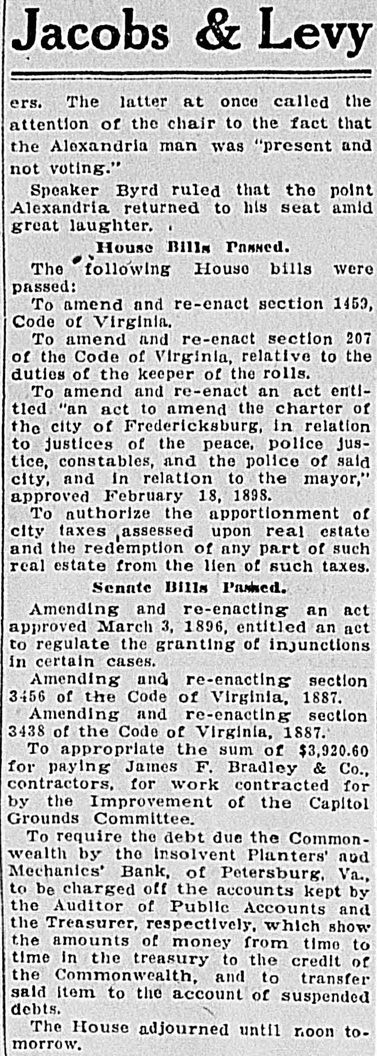 Jacobs & Levy ers. The latter at once called the attention of the chair to the fact that the Alexandria man was "present and not voting." Speaker Byrd ruled that the point Alexandria returned to his seat amid great laughter. House Bills Passed. The following House bills were passed: To amend and re-enact section 1459, Code of Virginia. To amend and re-enact section 207 of the Code of Virginia, relative to the duties of the keeper of the rolls. To amend and re-enact an act entitled "an act to amend the charter of the city of Fredericksburg, in relation to justices of the peace, police justice, constables, and the police of said city, and in relation to the mayor," approved February 18, 1898. To authorize the apportionment of city taxes assessed upon real estate and the redemption of any part of such real estate from the lien of such taxes. Senate Bills Passed. Amending and re-enacting an act approved March 3, 1896, entitled an act to regulate the granting of injunctions in certain cases. Amending and re-enacting section 3456 of the Code of Virginia, 1887. Amending and re-enacting section 3438 of the Code of Virginia, 1887. To appropriate the sum of $3,920.60 for paying James F. Bradley & Co., contractors, for work contracted for by the Improvement of the Capitol Grounds Committee. To require the debt due the Commonwealth by the insolvent Planters' and Mechanics' Bank, of Petersburg, Va., to be charged off the accounts kept by the Auditor of Public Accounts and the Treasurer, respectively, which show the amounts of money from time to time in the treasury to the credit of the Commonwealth, and to transfer said Item to the account of suspended debts. The House adjourned until noon tomorrow.