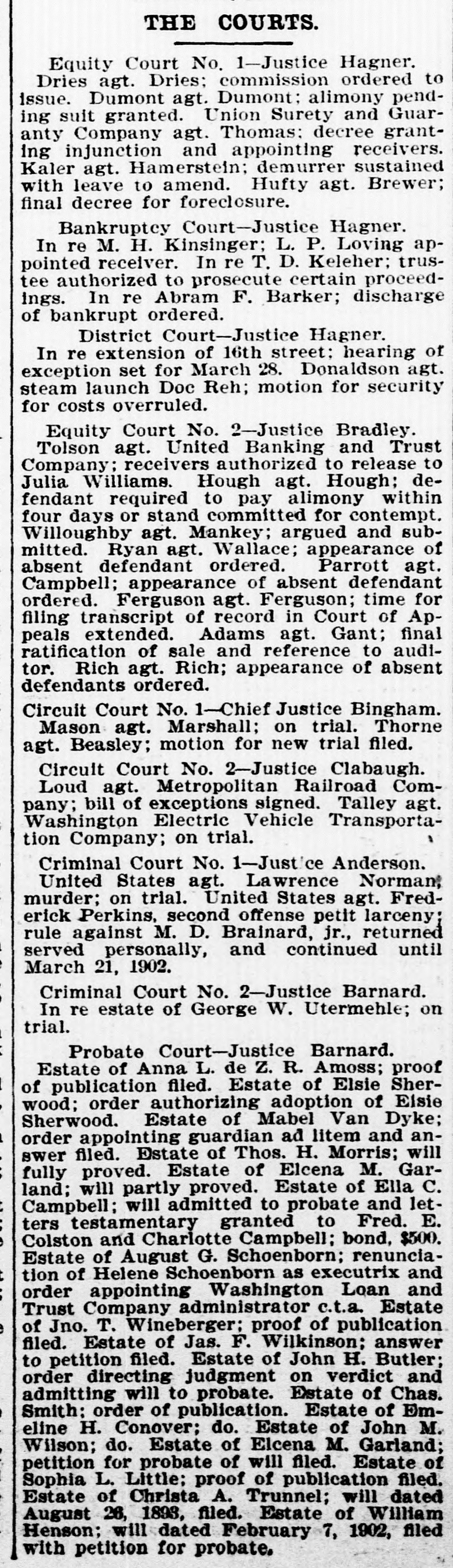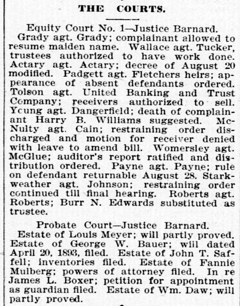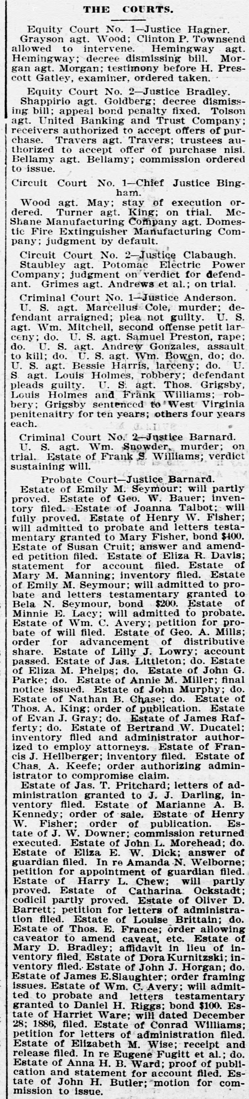 Estate of Emily M. Seymour; will partly proved. Estate of Geo. W. Bauer; inventory filed. Estate of Joanna Talbot; will fully proved. Estate of Henry W. Fisher; will admitted to probate and letters testamentary granted to Mary Fisher, bond $400. Estate of Susan Cruit; answer and amended petition filed. Estate of Eliza R. Davls; statement for account filed. Estate of Mary M. Manning; inventory filed. Estate of Emily M. Seymour; will admitted to probate and letters testamentary granted to Bela N. Seymour, bond $200. Estate of Minnie E. Lacy; will admitted to probate. Estate of Wm. C. Avery; petition for probate of will filed. Estate of Geo. A. Mills; order for advancement of distributive share. Estate of Lilly J. Lowry; account passed. Estate of Jas. Littleton; do. Estate of Eliza M. Phelps; do. Estate of John G. Parke; do. Estate of Annie M. Miller; final notice issued. Estate of John Murphy; do. Estate of Nathan B. Chase; do. Estate of Thos. A. King; order of publication. Estate of Evan J. Gray; do. Estate of James Rafferty; do. Estate of Bertrand W. Ducatel; inventory filed and administrator authorized to employ attorneys. Estate of Francis J. Hellberger; inventory filed. Estate of Chas. A. Keefe; order authorizing administrator to compromise claim.