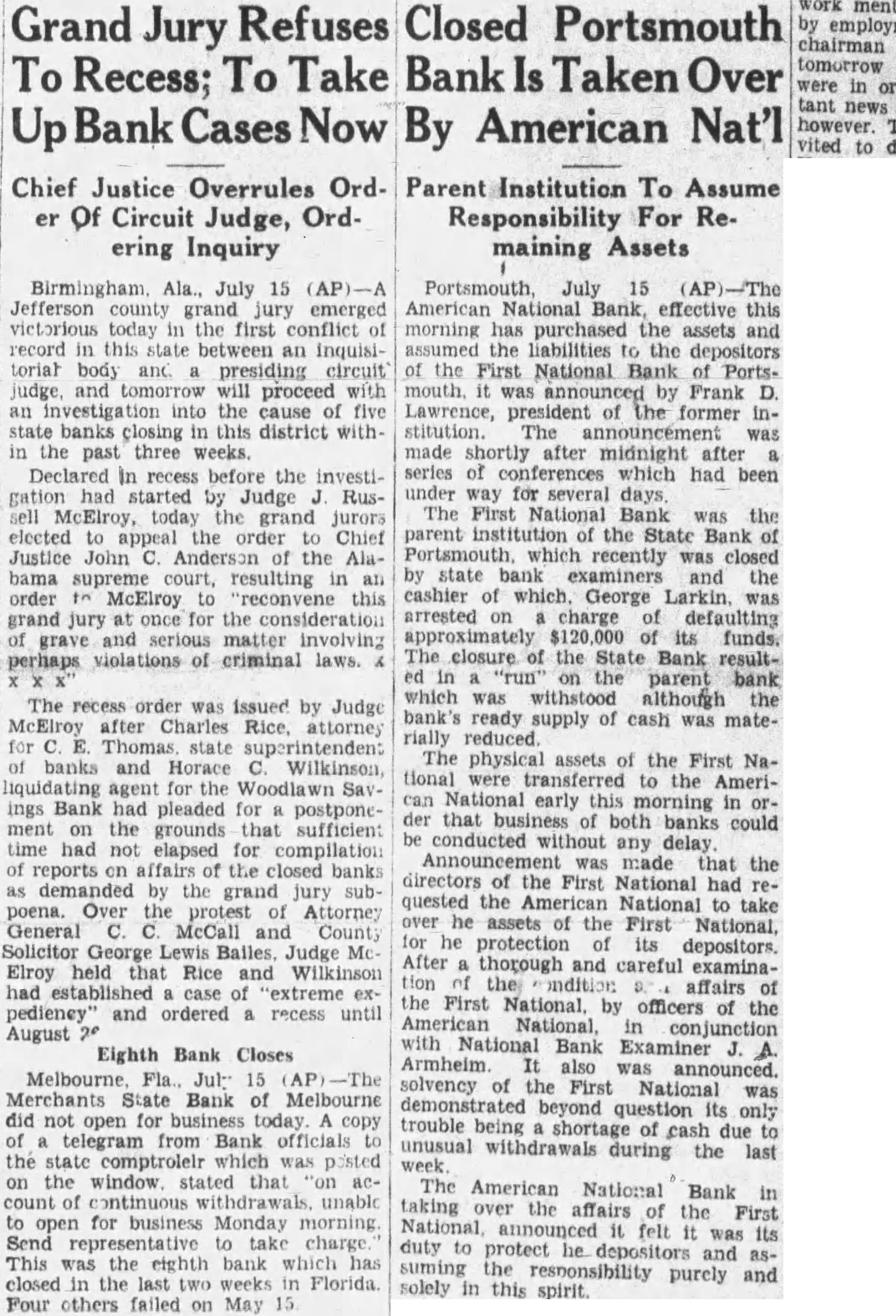 Portsmouth, July 15 American National Bank, effective this morning has purchased the assets and assumed liabilities the the First National Bank PortsFrank Lawrence, the former was shortly midnight which had been under several The Bank the the State Bank which recently was closed state examiners and the cashier which. George was arrested charge defaulting its funds. The closure the State Bank resultparent bank which was although the bank's ready supply cash was materially reduced. The physical assets of the First National the can National early this der that business of both banks could conducted without any delay made that the directors of the First National had quested over he the First protection depositors. thorough and careful examination affairs by officers of the American National. National Bank Armheim. solvency of the First National was demonstrated beyond question only trouble being shortage cash unusual withdrawals during the last American National Bank taking the affairs the First felt was duty protect he and solely purely and this spirit.