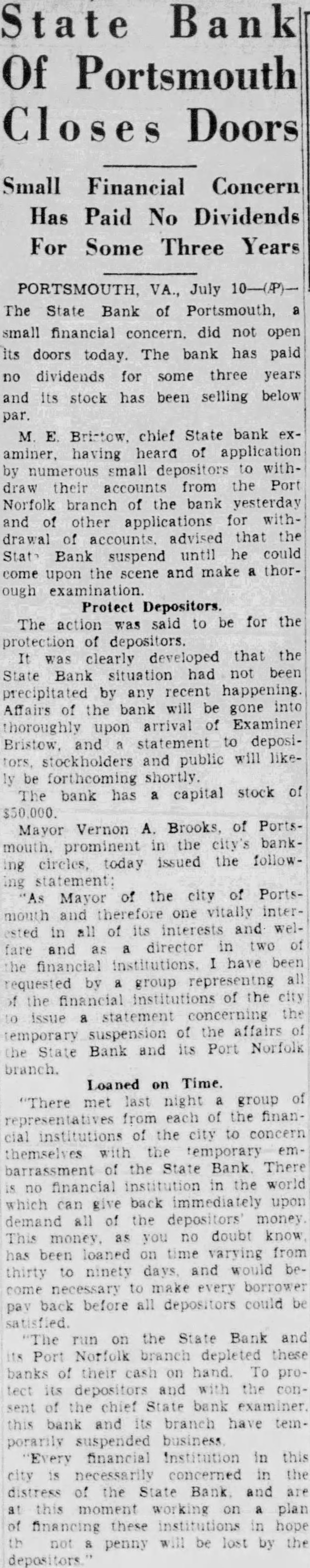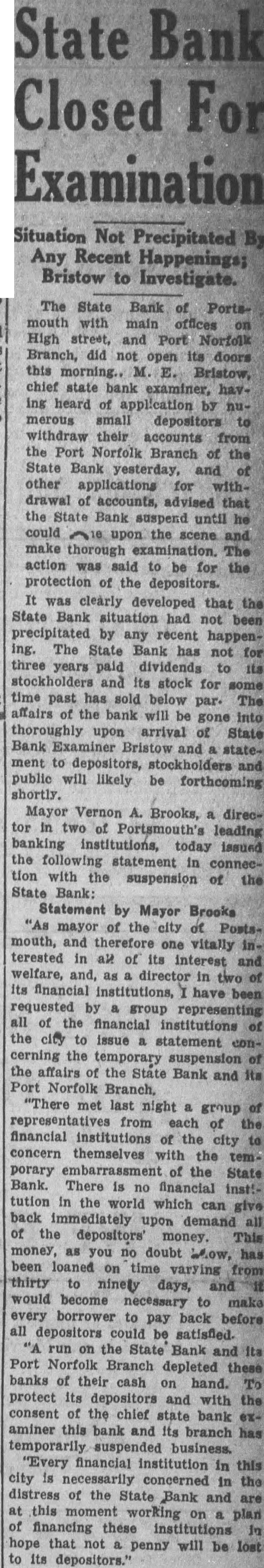 The State Bank of Portsmouth, one of the smaller financial institutions of Portsmouth, with capital of $75,000. and having its main office at 336 High street and branch at 400 Broad street, Port Norfolk, did not open for business yesterday morning. M. E. Bristow, deputy commissioner of the State Bureau of Insurance and Banking, consented late Tuesday to suggestion that the bank and its branch suspend business until he could arrive here and make an examination. This action was determined upon in the interest of the depositors after large number of withdrawals deposits had been made fro mthe Port Norfolk branch Tuesday and unusually heavy withdrawals had been made at the main bank. Mr. Bristow was sent to Portsmouth to take charge of the bank's affairs pending the appointment of receiver, which was ordered by the State Corporation Commission Mr. Bristow is expected to issue a statement to depositors, and the public as soon as his examination of the bank has been completed. Mayor Brooks, in statement issued after conference of group all the financial institutions in the city, confidence that in the bank would not lose penny. The mayor's follows "As mayor of the city of Portsmouth, and therefore vitally interested in all of its interests and welfare. and, as director in two its financial institutions, have been requested by group representing all of the financial institutions of the city to issue statement the suspension the aiffairs the State Bank and its Port Norfolk branch. "There met last night a group of representatives from each of the financial institutions of the city to concern themselves with the temporary of the State Bank. There is no institution in the world which can give back immediately upon all of the depositors' money. This money, as you no doubt know, has been loaned on time varying from thirty to ninety days, and it would become necessary before to make every borrower to pay back all be satisfied. run on the State Bank and its Port Norfolk branch depleted these banks of their cash on hand. To protect its depositors and with the consent of the chief State bank examiner this bank and its branch has temporarily suspended business. "Every financial institution in this city is concerned in the distress of the State Bank and are at this working on plan financing these institutions in hope that not penny will be lost to its depositors.'