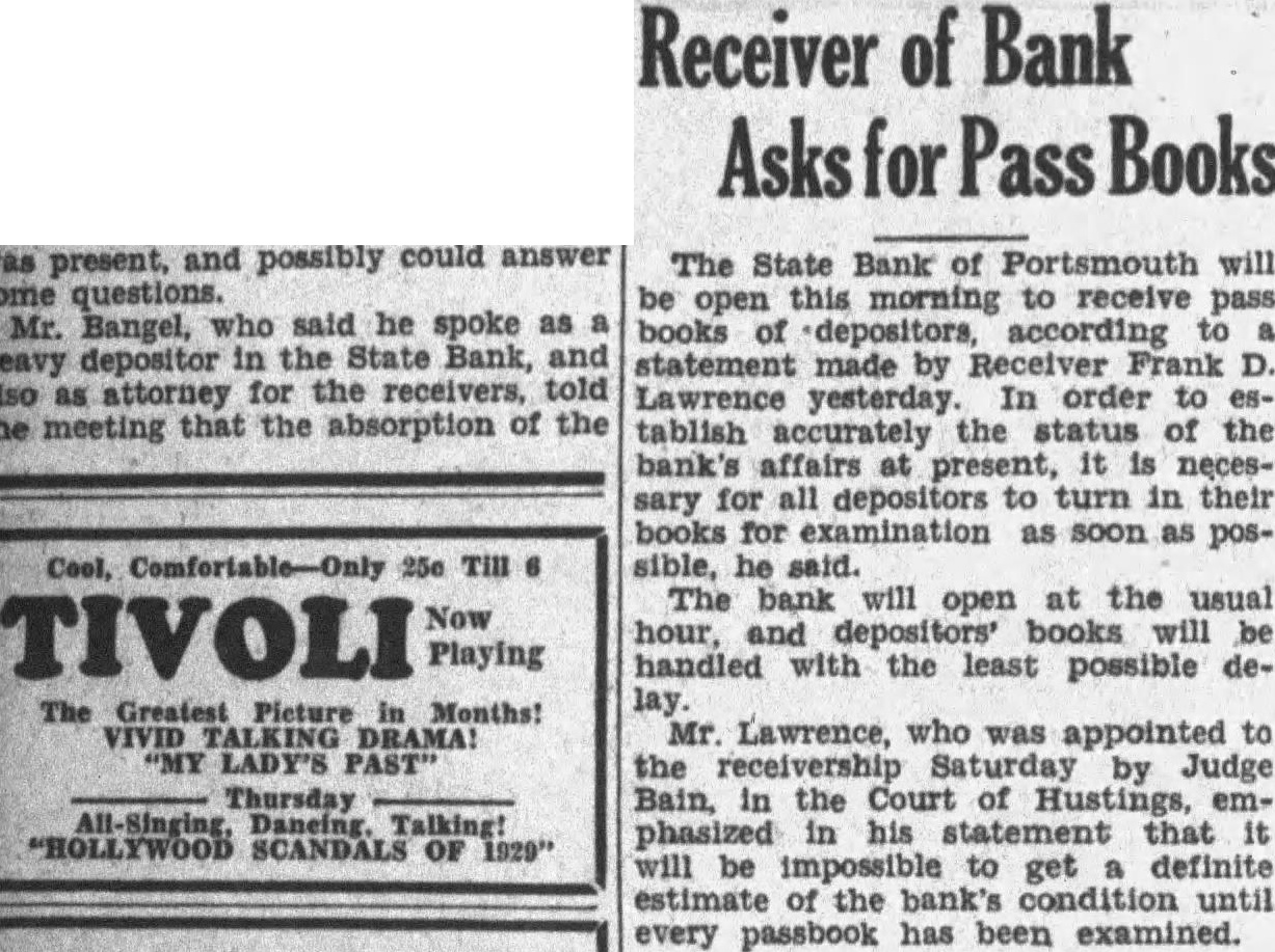 The State Bank of Portsmouth will be open this morning to receive pass books of depositors, according to statement made by Receiver Frank D. Lawrence yesterday. In order to tablish accurately the status of the bank's affairs at it is necessary for all depositors to turn in their books for examination as soon as possible, he said. The bank will open at the usual Now TIVOLI hour, and depositors' books will be Playing handled with the least possible delay. The Greatest Picture Months: VIVID Mr. Lawrence, who was appointed to "MY LADY'S DRAMA! the receivership by Judge Thursday Bain, in the Court of Hustings, emDaneing, SCANDALS Talking! OF 1929" phasized in his statement that it will be impossible to get definite estimate of the bank's condition every passbook has been examined.