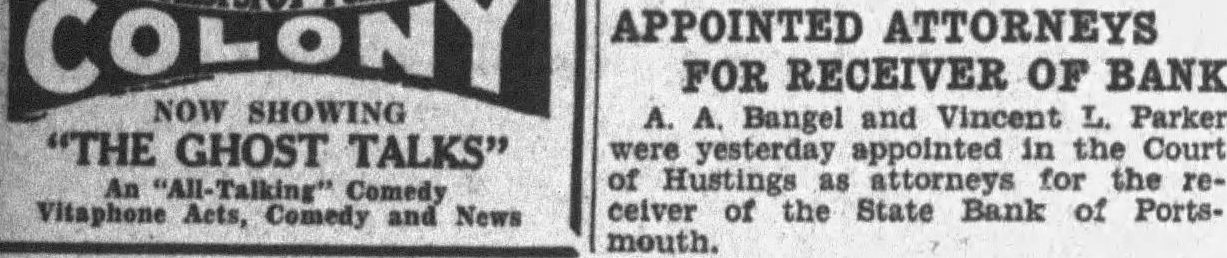 APPOINTED ATTORNEYS COLONY NOW SHOWING FOR RECEIVER OF BANK A. A. Bangel and Vincent L. Parker "THE GHOST TALKS" were yesterday appointed in the Court of Hustings as attorneys for the reAn Comedy Vitaphone Acts, Comedy and News ceiver of the State Bank of Portsmouth.