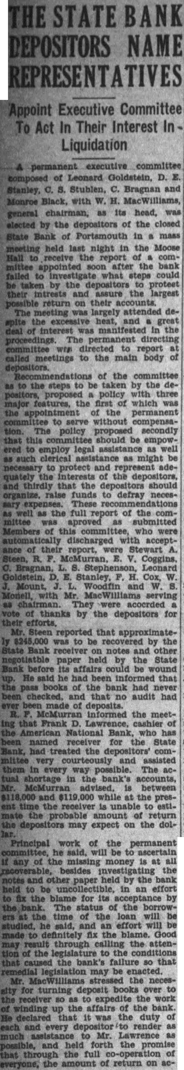 Appoint Executive Committee To Act In Their Interest In Liquidation executive committee composed of Leonard Goldstein, D. Stanley, C. S. Stublen, C. Bragnan and Monroe Black, with W. H. MacWilliams, general chairman, as its head, was elected by the depositors of the closed State Bank of Portsmouth in a mass meeting held last night in the Moose Hall to receive the report of committee appointed soon after the bank failed to Investigate what steps could be taken by the to protect their intrests and assure the largest return on their accounts. The meeting was largely attended despite the excessive heat, and great deal of interest was manifested in the proceedings The permanent directing committee directed to report called meetings to the main body of of the committee as to the steps to be taken by the depositors, proposed policy with three major features. the first of which was the appointment of the permanent to serve without compensation. The policy proposed secondly that this should be empowered to employ legal as well as such clerical assistance as might be necessary to protect and represent adequately the Interests of the depositors, and thirdly that the depositors should organize. raise funds to defray necesmary These as well as the full report of the committee was aproved as submitted Members of this committee, who were automatically discharged with acceptance of their report, Stewart A. Steen, R. McMurran, E. V. Coggins, Goldstein, D. E. Stanley, H. Cox, W. Mount, Woodfin and W. Monell, with Mr MacWilliams serving as chairman. They were vote of thanks by the depositors for their Mr. Steen reported that approximately $245,000 was to be recovered by the State Bank receiver on notes and other negotiatble paper held by the State Bank before its affairs be wound up. He said he had been informed that the pass books of the bank had never been checked. and that no audit had ever made of deposits. McMurran informed the meeting that Frank D. Lawrence, of the American National Bank, who has been named receiver for the State Bank, had treated the committee very courteously and assisted them in every way possible. The actual shortage in the bank's accounts, Mr. McMurran advised, is between $118,000 and $119,000 while at the pres. ent time the receiver is to estimate the probable of return the depositors may expect on the dol-