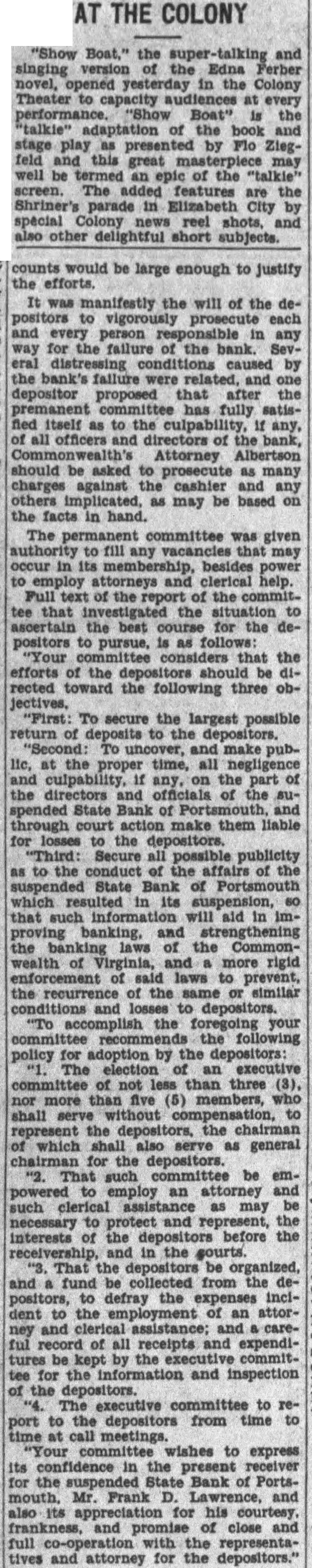 "Show Boat," the and singing version of the Edna Ferber novel, yesterday in the Colony Theater to capacity at every performance. "Show Boat" is the "talkie" adaptation of the book and stage play as presented by Flo Ziegfeld and this great may well be an of the "talkie" screen. The added features are the Shriner's parade in Elizabeth City by special Colony news reel shots, and also other delightful short subjects. counts would be large enough to justify the efforts. It was manifestly the will of the depositors to vigorously prosecute each and every person responsible in any way for the failure of the bank. Several caused by the bank's failure were and one depositor proposed that after the premanent committee has fully satisfied itself as to the culpability, any, of all officers and directors of the bank, Commonwe Attorney Albertson should be asked to prosecute as many charges against the cashier and any others implicated, as may be based on the facts in hand. The committee was given to fill any vacancies that may occur in its membership, besides power to employ attorneys and clerical help. Full text of the report of the committee that investigated the situation to ascertain the best for the depositors to pursue, is as "Your that the efforts of the depositors be directed toward the following three ob"First: To secure the largest possible return of deposits to the depositors. "Second: To and make public, at the proper time, all negligence and culpability, any, on the part of the directors and officials of the suspended State Bank of Portsmouth, and through court action make them liable for losses to the depositors. "Third: Secure all possible publicity as to the conduct of the affairs of the suspended State Bank of Portsmouth which in its suspension, 60 that information will aid in imbanking, and strengthening the the Commonwealth of Virginia, and more rigid enforcement of said laws to prevent, the recurrence of the same or similar and losses to depositors. "To accomplish the foregoing your recomme the policy for adoption by the depositors: The election of an executive committee of not less than three (3), nor more than five (5) members, who shall serve without compensation, to represent the depositors, the chairman of which shall also as general chairman for the depositors. That committee be empowered to employ an attorney and such clerical assistance as may necessary to protect and represent, the interests of the depositors before the receivership, in the gourts "3, That the depositors be and fund be collected from the depositors, defray the incldent to the employment of an attorney and clerical assistance; and careful record of all receipts and expenditures be kept by the executive committee for the information and inspection of the depositors. "4. The executive committee to report to the depositors from time to time at call meetings. "Your committee wishes to express its confidence in the present receiver for the suspended State Bank of Portsmouth. Mr. Frank D. Lawrence, and also its appreciation for his courtesy. frankness, and of close and full with the representatives and attorney for the depositors."