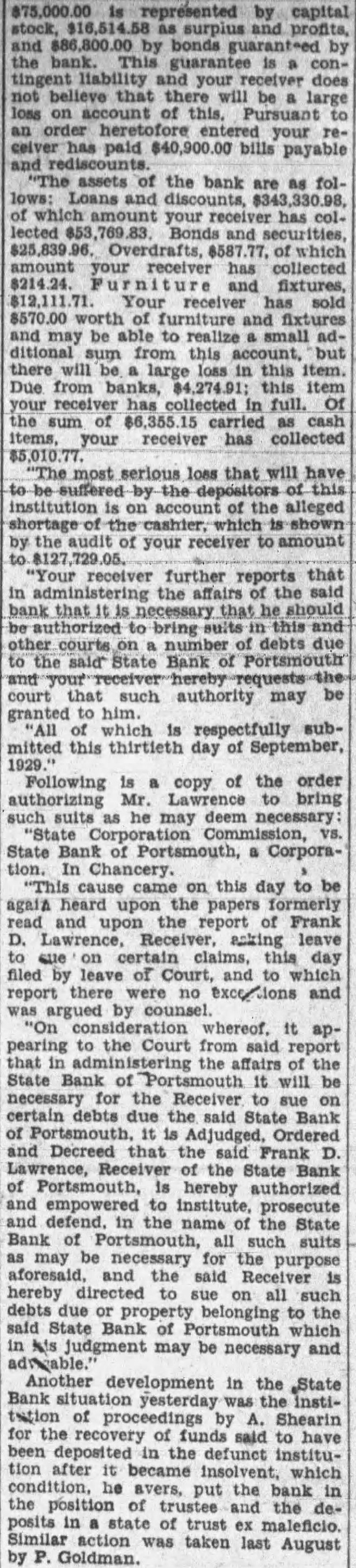 $75,000.00 represented by capital stock, surplus profits, by bonds guaranteed by the bank. This guarantee contingent liability and your does that will large loss on account your ceiver paid $40,900.00 bills payable and "The assets the bank as Loans of your has collected Overdrafts, which amount your receiver collected and fixtures, Your receiver worth furniture and fixtures and may be able to realize this item. Due this full. the sum your receiver collected $5,010.77. "The most serious loss that will have by the alleged the shown by receiver amount "Your receiver further reports that in administering the the said bank necessary should bring debts the State Bank of Portsmouth that such authority may be granted to which respectfully submitted this thirtieth day of September, Following copy of the order Mr. bring suits he may deem State Bank of Portsmouth, a Corpora"This cause came on this day to be again heard upon the papers formerly the report of Frank D. asking leave que on claims, this filed of and by whereof. it appearing to the Court said report that the affairs the State Bank of it will necessary for the Receiver to sue on certain debts due the said State Bank is and Decreed that the said Frank D. the of hereby empowered to institute, prosecute defend. the the State Bank of all such suits as may be necessary for the purpose the said Receiver hereby to sue all such property belonging to the said State of N/S judgment may be necessary Another development in the State Bank yesterday the tation of Shearin the of funds said have been deposited the defunct institution after became insolvent, which avers, put the bank in the and the deposits trust maleficio. Similar taken August by Goldman.