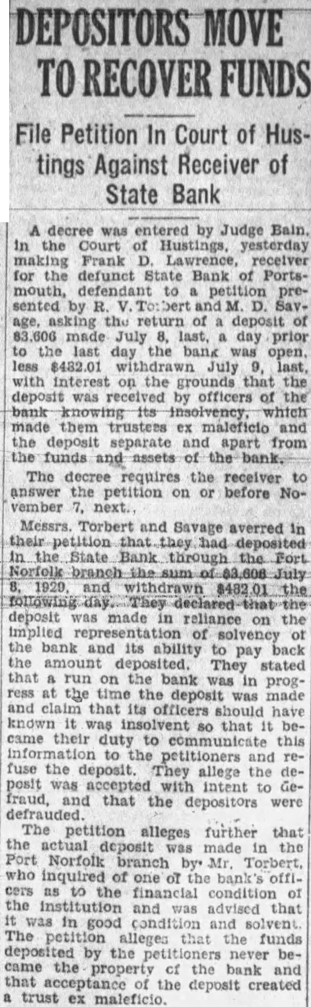 A decree was entered by Judge Bain. in the Court of Hustings, yesterday making Frank D. Lawrence, receiver for the defunct State Bank of Portsmouth, defendant to petition presented by R. and M. D. Savage, the return of deposit of 83,606 made July 8, last, day prior to the last day the bank was open. less $482.01 withdrawn July last, with interest on the grounds that the deposit was received by officers of the bank knowing its insolvency, which made them trustees ex maleficio and the deposit separate and apart from the funds and assets of the bank. The decree requires the receiver to answer the petition on or before November next. Messrs. Torbert and Savage averred in their petition that they had deposited in the State Bank through the Fort 8, 1920, and withdrawn $482.01 the They declared that the deposit was made in reliance on the implied of solvency of the bank and its ability to pay back the amount deposited. They stated that a run on the bank was in progress at the time the deposit was made and claim that its officers should have known was so that it became their duty to this information to the petitioners and refuse the deposit. They allege the deposit was accepted with intent to Gedefrauded fraud, and that the depositors were The petition alleges further that the actual deposit was made in the Port Norfolk branch by Mr. Torbert, who inquired of one of the bank's officers as to the financial condition of the institution and was advised that it was in good and solvent The alleges that the funds deposited by the never became the property cf the bank and that acceptance of the deposit created a trust ex maleficio.