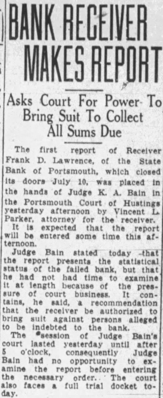 The first report of Receiver Frank D. Lawrence, of the State Bank of Portsmouth, which closed its doors July was placed in the hands of Judge K. Bain Court Hustings yesterday Vincent Parker. attorney for the receiver. expected that report entered some time this afJudge Bain stated today that the the failed bank, but he at length the prescourt contains, he said, the receiver be authorized bring against persons alleged indebted to The Judge Bain's lasted until after consequently Judge Bain had opportunity amine before entering the faces full trial docket to-