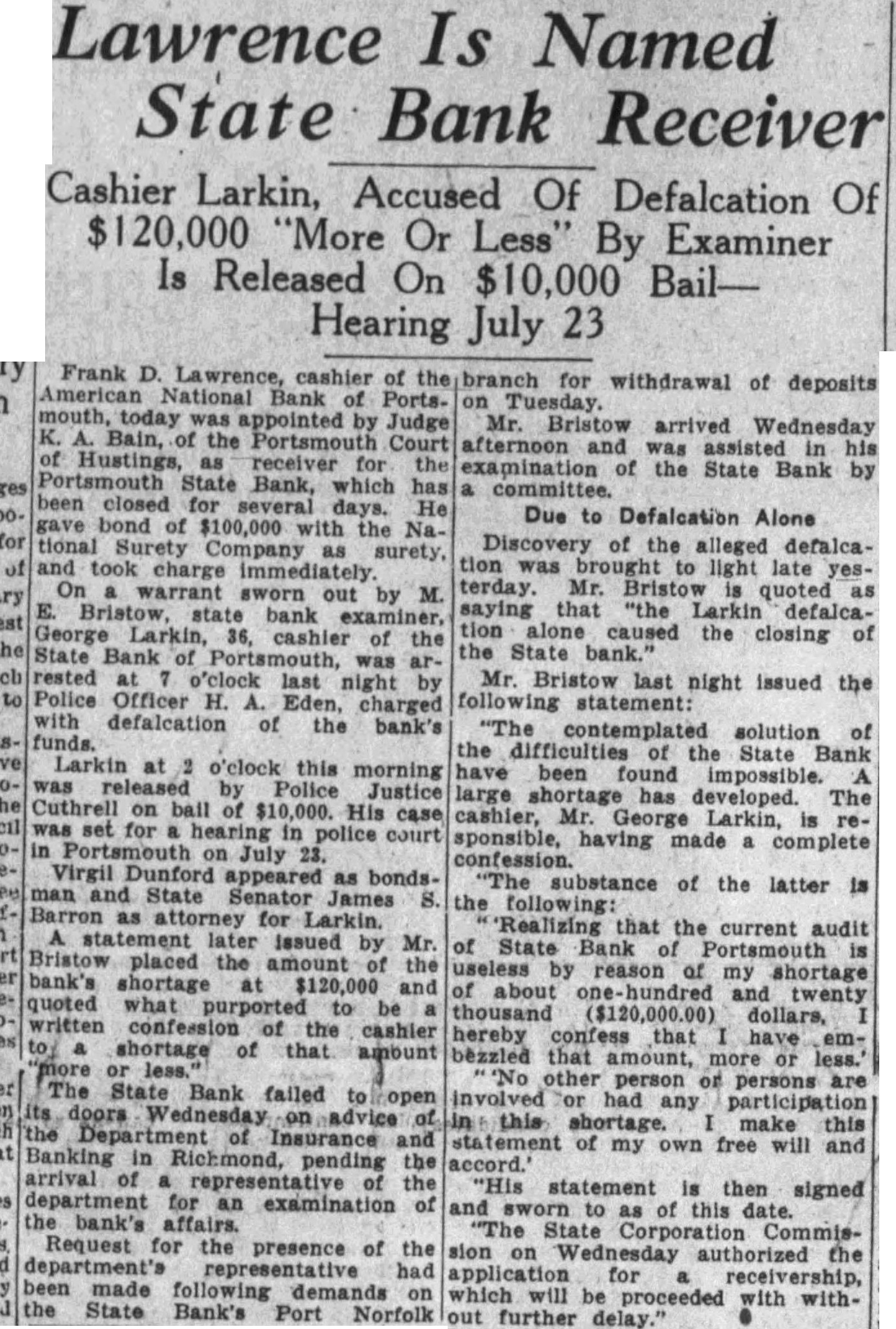 Frank D. Lawrence, cashier of Bank of Portsmouth, today appointed Judge Bain, of the Portsmouth Court of Hustings, receiver Portsmouth Bank, which has been closed several He gave of $100,000 with Na. tional Company surety, and took charge On warrant out by M. bank George Larkin, 36, cashier the of State Bank of was rested o'clock last night Police Officer charged defalcation of the bank's Larkin at o'clock this morning Justice Cuthrell on ball His case set in in Portsmouth on July Virgil Dunford appeared as bondsState Senator James Barron as for Larkin. Issued by Mr. placed amount bank's shortage $120,000 quoted what to written confession cashier shortage of that amount The State Bank failed doors Wednesday advice of Insurance Banking in Richmond, pending arrival department for an examination bank's Request the of the presence department's representative had been made following demands the State Bank's Port Norfolk branch for withdrawal of deposits Mr. Bristow arrived Wednesday afternoon assisted in his examination of State by committee. Due to Defalcation Alone