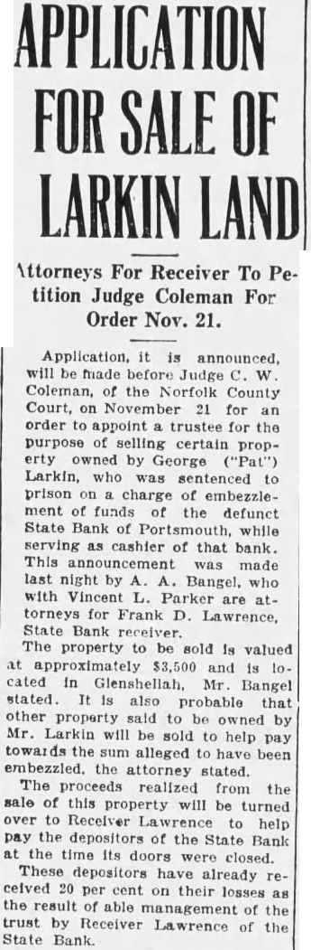Attorneys For Receiver To Petition Judge Coleman For Order Nov. 21. made Judge Coleman, the Norfolk County Court, for an order appoint trustee purpose selling certain owned by George ("Pat") Larkin, sentenced prison charge embezzlement funds the defunct State Bank Portsmouth, while cashier of that bank. This announcement was made last night by Bangel. who Vincent Parker torneys for Frank D. Lawrence, State Bank receiver property be sold is valued approximately $3,500 and cated Bangel stated. probable that other property said owned by Mr. Larkin will be sold to help pay the alleged been embezzled. the attorney stated. The realized from the sale of this property will be turned over Receiver help pay the the Bank time doors closed. These depositors already celved per cent their losses the result able of the trust Receiver Lawrence the Bank