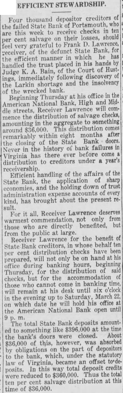 creditors Four thousand depositor Bank of Portsmouth, the failed State checks in ten week receive are this losses, should salvage on their cent per Frank Lawrence, feel grateful to very State Bank, for of the defunct receiver, which he has efficient manner in the in his hands handled the trust placed Court of HustBain, of the Judge K. following discovery ings, immediately and the insolvency the Larkin shortage the wrecked bank. of his office in the Thursday at Beginning Bank, High and American National Lawrence will comdle streets, Receiver of salvage checks, the distribution mence to something amounting in the aggregate This distribution comes around $36,000. months after remarkably within eight State Bank doors. the of the closing bank failures in in the history of Never has there ever before come Virginia to creditors under year's distribution receivership. of the affairs of the Efficient handling of sharp State Bank, the application down of trust economies, and the holding of every expense brought about the present kind, has sult. For it all, Receiver Lawrence deserves warmest not only from benefited, but those who are directly from the public at large. for the benefit Receiver Lawrence in whose behalf ten State Bank creditors, per cent distribution checks have been be hand at his prepared, will not only on banking hours, beginning during for the distribution Thursday, checks, but for the of those who cannot come in banking time, will remain at his desk until six o'clock to Saturday, March in the evening up he will hold his office which date on National Bank until the American open Bank deposits amountThe total State to something like at the time closed. About the bank's doors were of however, was absorbed $36,000 this, the part of depositors obligations on which, under the statutory to the bank, became an offset law of Virginia, total deposit credits In this way posits. $360,000. Thus the total reduced to were distribution at this ten cent salvage per time of $36,000.