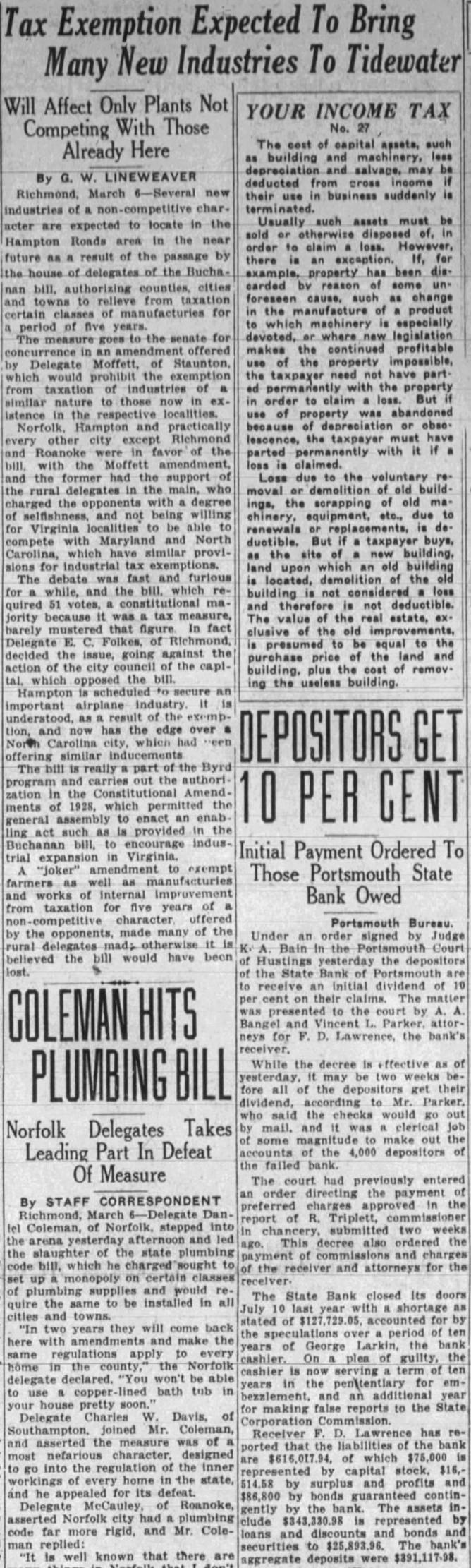 By G. LINEWEAVER deducted cross income March their suddenly use business industries of non-competitive char- terminated. the Usually such assets must expected to locate sold Hampton Roads area in the near order loss. future result of the passage by there If, house delegates of the Bucha- example, property has been discities carded authorizing from foreseen cause, such to for product certain machinery especially of the senate devoted, where legislation concurrence offered makes the continued profitable use the property impossible, Delegate would the exemption the taxpayer not have part prohibit of industries ed with the property taxation those order to claim similar nature istence respective localities. of property abandoned Hampton and practically because depreciation or every other lescence, the taxpayer favor the parted with the claimed. the the support Loss due the voluntary the the who moval build the degree the scrapping old ings, and being willing equipment, etc., due chinery, for Virginia able renewals with Maryland and North ductible. taxpayer Carolina, which similar provi- site industrial tax exemptions. which building The debate fast and furious demolition the located, while, and the building not considered loss quired 51 deductible. because tax the jority value estate, barely mustered that In fact clusive old Delegate Folkes, presumed be equal to decided the issue, going against the the and purchase price action of the city council the capi- of plus cost remov. which opposed the bill. ing the useless building Hampton scheduled important understood, the and has the edge over which similar The bill really part Byrd and carries out the authori zation AmendPER ments which permitted general to enact enab act such provided to indusInitial Payment Ordered To trial expansion "joker" exempt Those Portsmouth State farmers well works Internal Improvement Bank Owed taxation for five years of from character offered Portsmouth Bureau. the opponents, many of by Under an order signed Judge rural Bain the Portsmouth Court believed the would have Hustings yesterday the depositors lost. the State Bank receive Initial cent their The the by for D. Lawrence, the bank's While the decree is -ffective two all the get their Mr. Parker, who the checks would go Norfolk Delegates Takes and clerical some make out Leading Part In Defeat depositors the failed Of Measure The had previously entered order the By STAFF CORRESPONDENT preferred Richmond, March Danreport Triplett, Coleman, stepped into two weeks arena yesterday afternoon and led ago. This decree also ordered the the slaughter the state plumbing and charges which and for the the receiver attorneys monopoly certain plumbing and would The State Bank closed Its doors the same installed in towns. stated accounted for "In years will come back the over period with and the years of George Larkin, the bank apply to cashier. On plea guilty, Norfolk cashier now serving delegate declared. be able years the for emlined bath tub use year an pretty the for making false reports to Delegate Charles Davis, of joined Mr. Coleman, Receiver has asserted the measure of the nefarious designed $75,000 of the regulation the $16,by capital home in the state, surplus profits and he for its defeat. by continDelegate McCauley, of Roanoke, gently the assets asserted Norfolk had plumbing represented $343,330.98 code far more rigid, and Mr. Cole- bonds and discounts and replied: securities to $25,893.96. The "It known that there are were $391,117.98. deposits