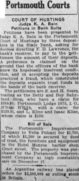 COURT OF HUSTINGS Judge Bain Petitions in Bank Suits Petitions have been presented to Judge Bain in the Portsmouth Court Hustings by three depositors the State Bank, asking for directing bank's receiver. to pay to the petithe the that the officers of the bank its hopelessly insolvent condition, and in accepting the deposits fraud, which the deposits separate trust funds in hands the The Sears, the Betty and Boy Babyclaim for $388.93 Portsmouth Lodge 1075, with claim $139.91, Kline and Isaac Kline, whose claim is $100.