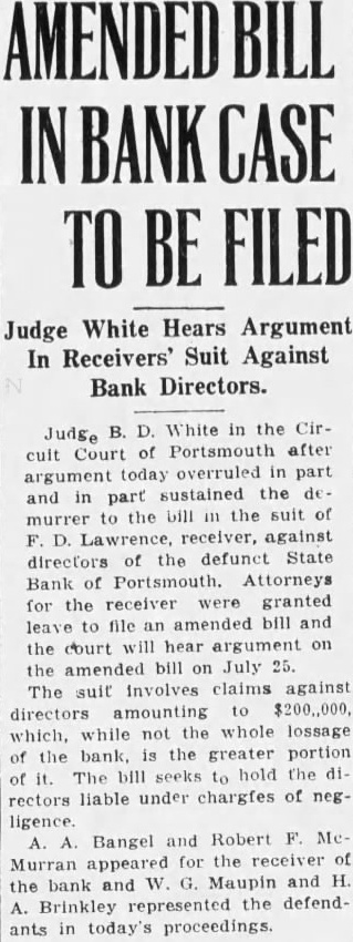 White in the Judge Portsmouth after Court argument today overruled part sustained the and part the suit of murrer Lawrence, receiver, against the defunct State directors Bank Portsmouth. Attorneys the receiver granted amended bill and hear argument amended suit claims against directors amounting not the whole the greater The hold the rectors liable under of negBangel Robert receiver Murran and Maupin and H. the Brinkley the defendants in today's proceedings.