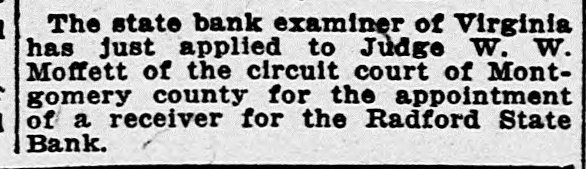 The state bank examiner of Virginia 1 has just applied to Judge W. W. Moffett of the circuit court of Montgomery county for the appointment of a receiver for the Radford State 1 Bank.