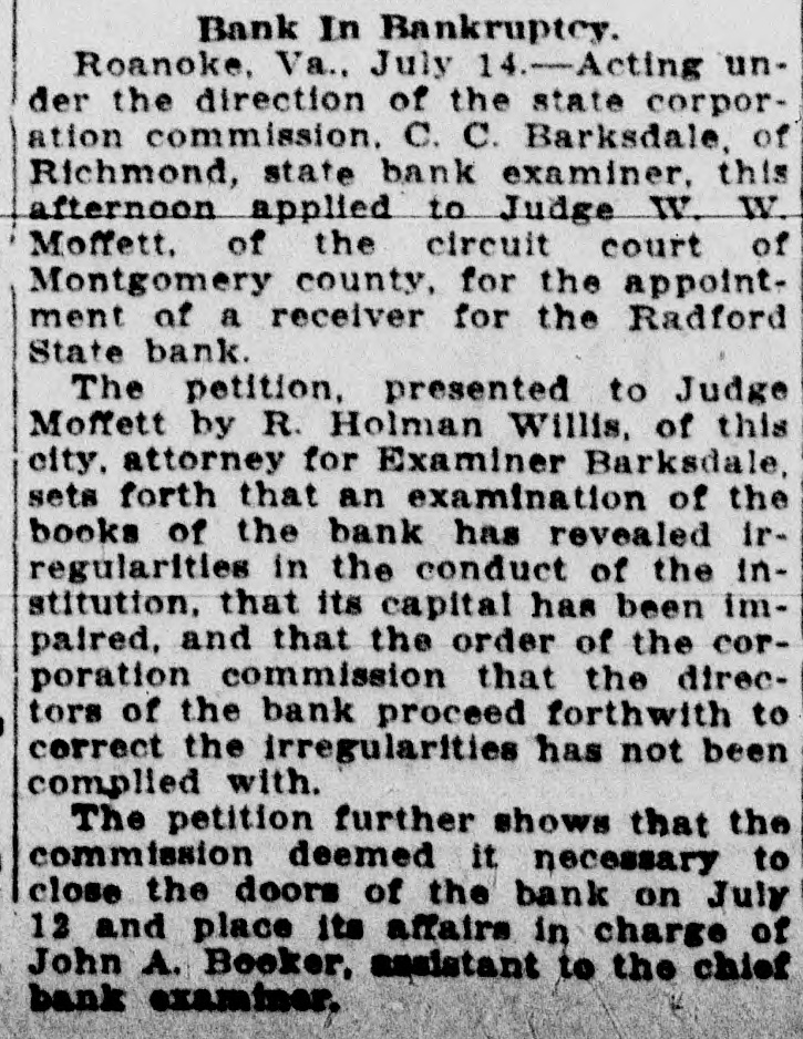 Bank In Bankruptcy. Roanoke, Va., July 14.-Acting under the direction of the state corporation commission. C. C. Barksdale, of Richmond, state bank examiner, this afternoon applied to Judge W. W. Moffett. of the circuit court of Montgomery county, for the appointment of a receiver for the Radford State bank. The petition, presented to Judge Moffett by R. Holman Willis, of this city. attorney for Examiner Barksdale, sets forth that an examination of the books of the bank has revealed irregularities in the conduct of the institution, that its capital has been impaired, and that the order of the corporation commission that the directors of the bank proceed forthwith to correct the irregularities has not been complied with. The petition further shows that the commission deemed it necessary to close the doors of the bank on July 12 and place its affairs in charge of John A. Beeker, assistant to the chief bank examiner.