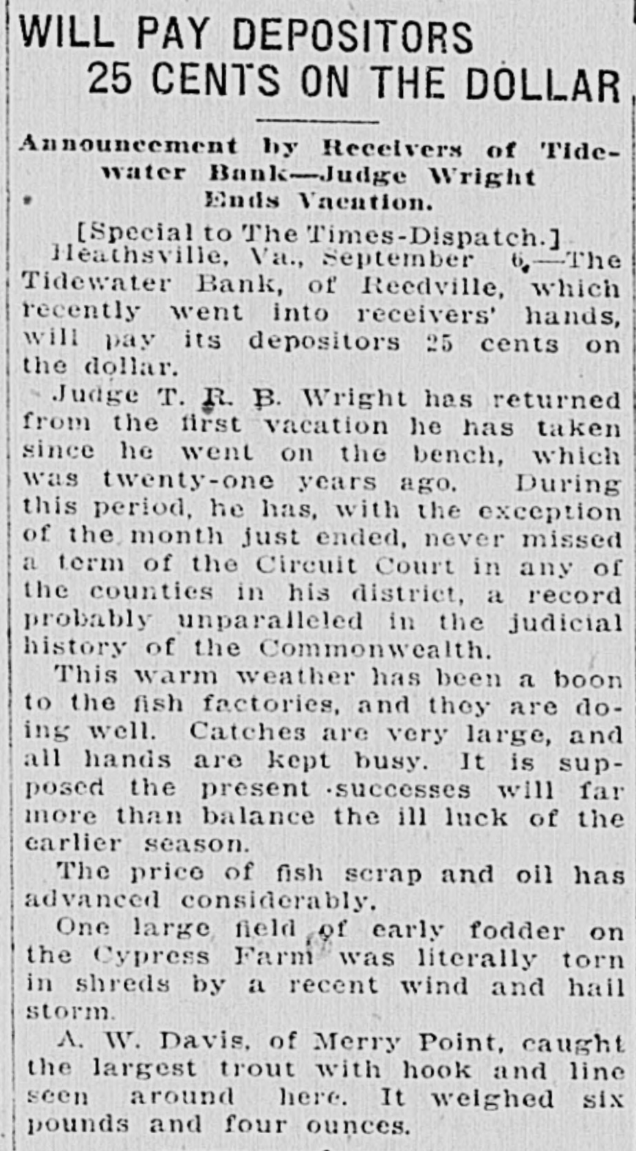 WILL PAY DEPOSITORS 25 CENTS ON THE DOLLAR Announcement by Receivers of Tidewater Bank-Judge Wright Ends Vacation. [Special to The Times-Dispatch.] Heathsville, Va., September 6,-The Tidewater Bank, of Reedville, which recently went into receivers' hands, will pay its depositors 25 cents on the dollar. Judge T. R. B. Wright has returned from the first vacation he has taken since he went on the bench, which was twenty-one years ago, During this period, he has, with the exception of the month just ended, never missed a term of the Circuit Court in any of the counties in his district, a record probably unparalleled in the judicial history of the Commonwealth. This warm weather has been a boon to the fish factories, and they are doing well. Catches are very large, and all hands are kept busy. It is supposed the present successes will far more than balance the ill luck of the earlier season. The price of fish scrap and oil has advanced considerably. One large field of early fodder on the Cypress Farm was literally torn in shreds by a recent wind and hail storm. A. W. Davis, of Merry Point, caught the largest trout with hook and line seen around here. It weighed six pounds and four ounces.