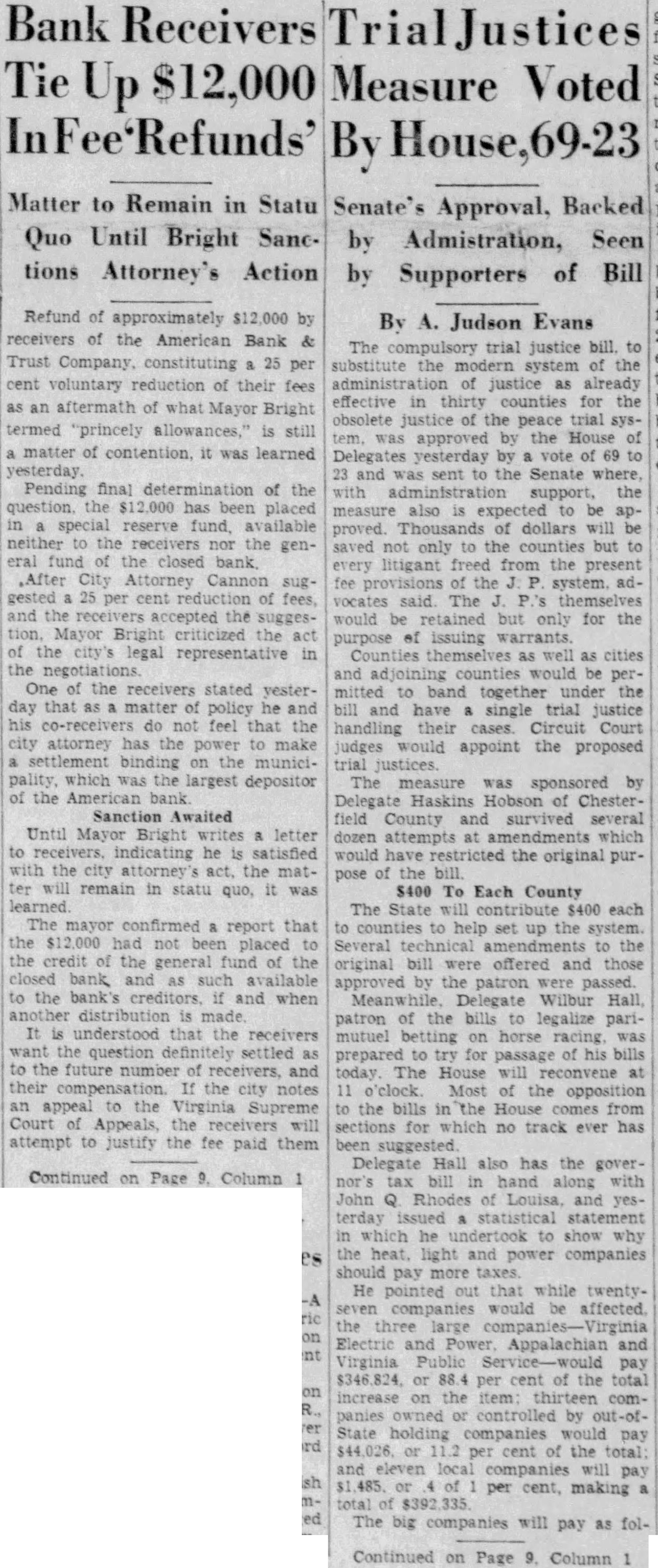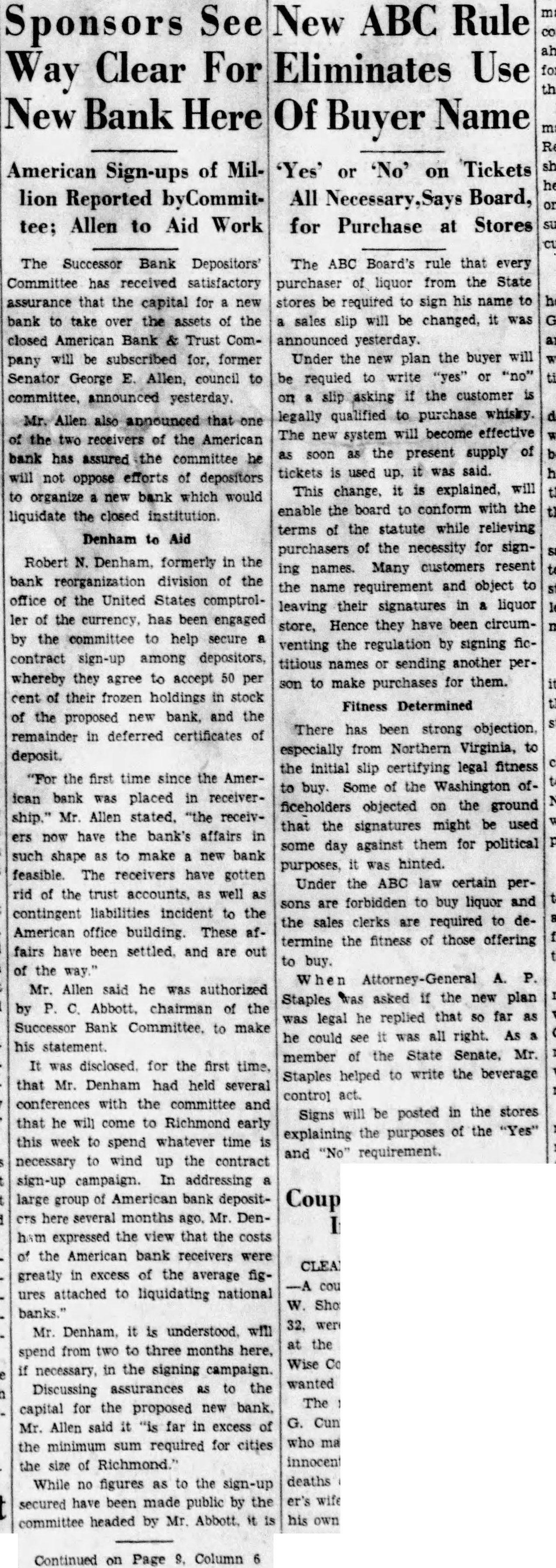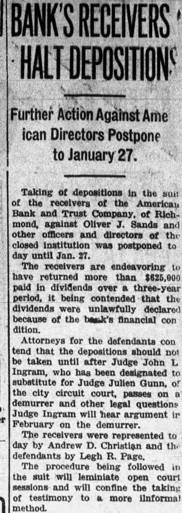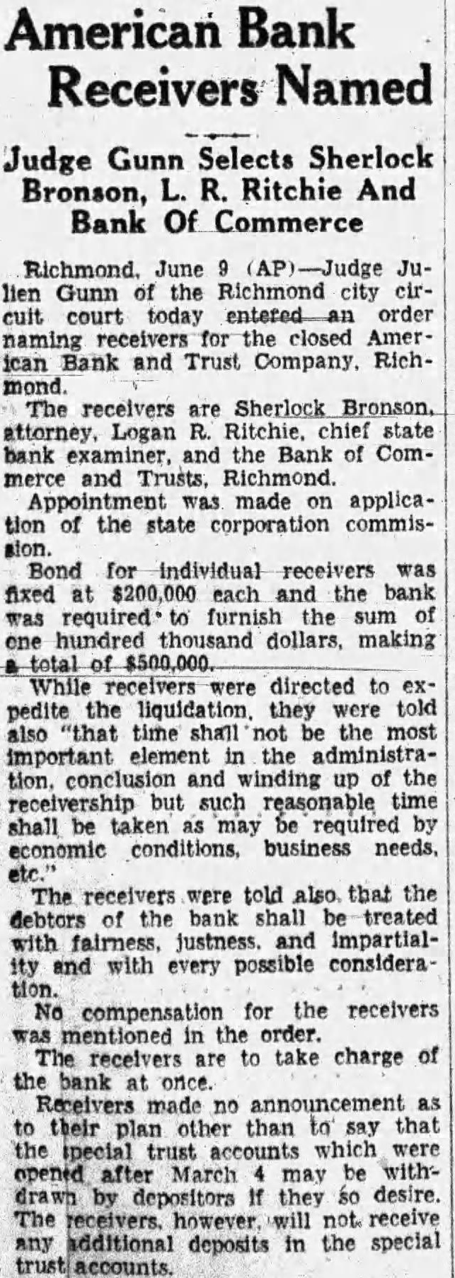 News of whatever decison was reached last night between City Attorney James Cannon and receivers for the American Bank Trust Company the of the offer cash settlment by two of the bank's former directors suits against them are dropped, have to given out by Judge Julien Gunn the report submitted to him 10 o'clock this morning. Pressed for statement at of the conference last night, Mr. Cannon sad that he did not privileged to give out the formation had been transmitted Judge Gunn. Neither Sherlock Bronson nor Justin Moore, two the bank's who sat in on the conference, could be reached at their The purpose the meeting was determine receivers jeopardize their rights bring suit against other directors and officers the closed institution they should accept settlements totaling by Luther Jenkins and Walter Sams some weeks the provision that suits pending against them. jointly former directors, would The have previously that court the City asked for time which to study the matter the gality remaining suits before final decision should made. The offers, which were made during the latter July. would have placed total new assets the hands of the receivers almost pay while offered pay which be and eight notes $2,500 each. paid over four year period interest cent In Mr. Sams offered to claims deposits members and associates amounting