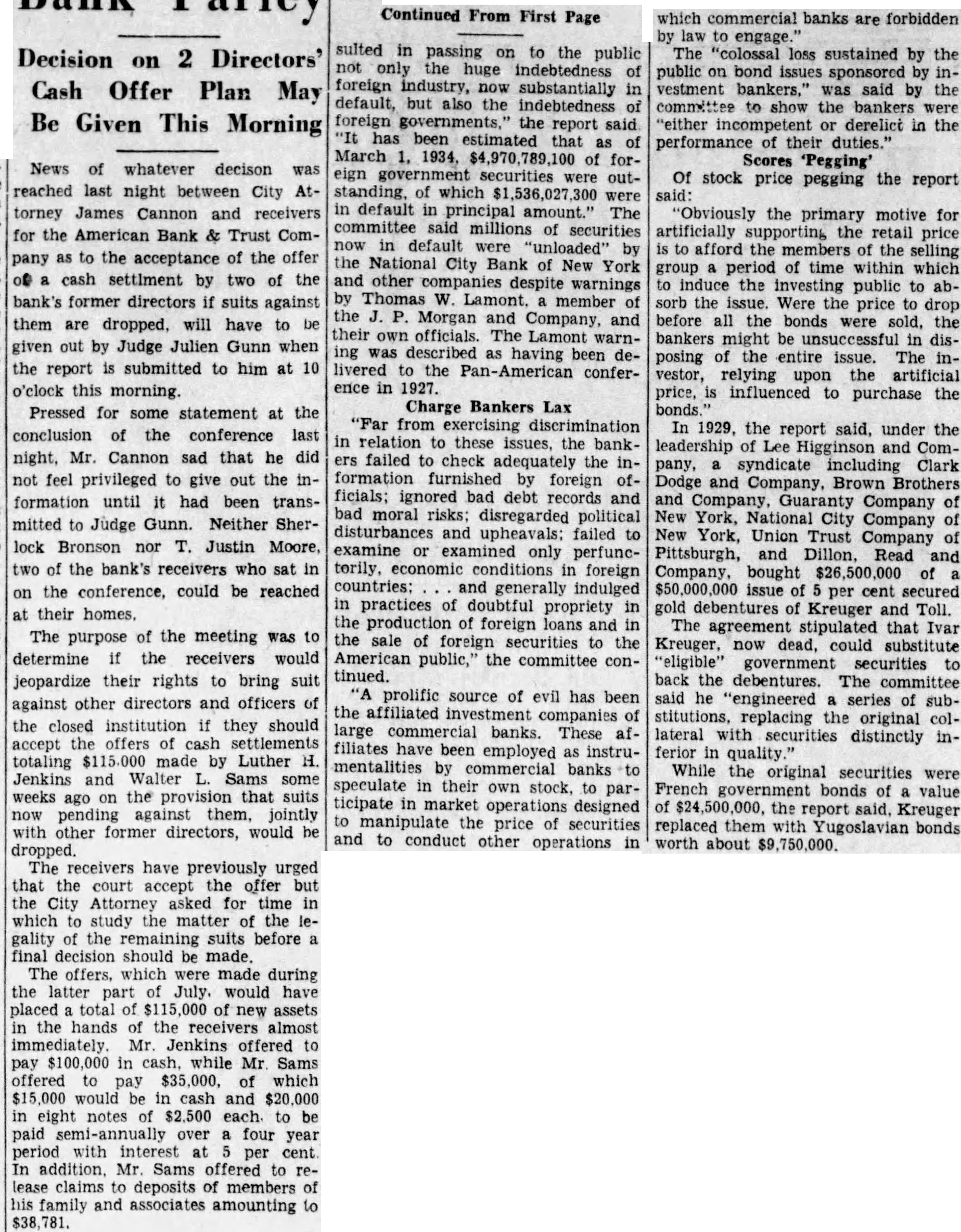 Continued From First Page sulted in passing on to the public not the huge indebtedness foreign industry, now substantially default, but the indebtedness foreign the report said that March 1934, forsecurities outstanding. which default principal committee millions securities now in default were "unloaded" the National Bank of New York and despite warnings Thomas member the and their officials. The the conference in Charge Bankers Lax "Far in relation these issues, the bankfailed check adequately the by foreign ficials; records and bad moral disregarded political upheavals: failed examine only perfuneforeign countries: and generally indulged practices propriety production foreign and the foreign the American public," the committee continued. prolific source of evil has been the large banks. These mentalities commercial banks speculate own stock ticipate designed manipulate price securities and to conduct other operations which commercial banks are forbidden engage." "colossal loss sustained by the public on bond issues sponsored by vestment bankers." was said by the committee the bankers were "either incompetent derelict in the performance 'Pegging' Of stock price pegging the report
