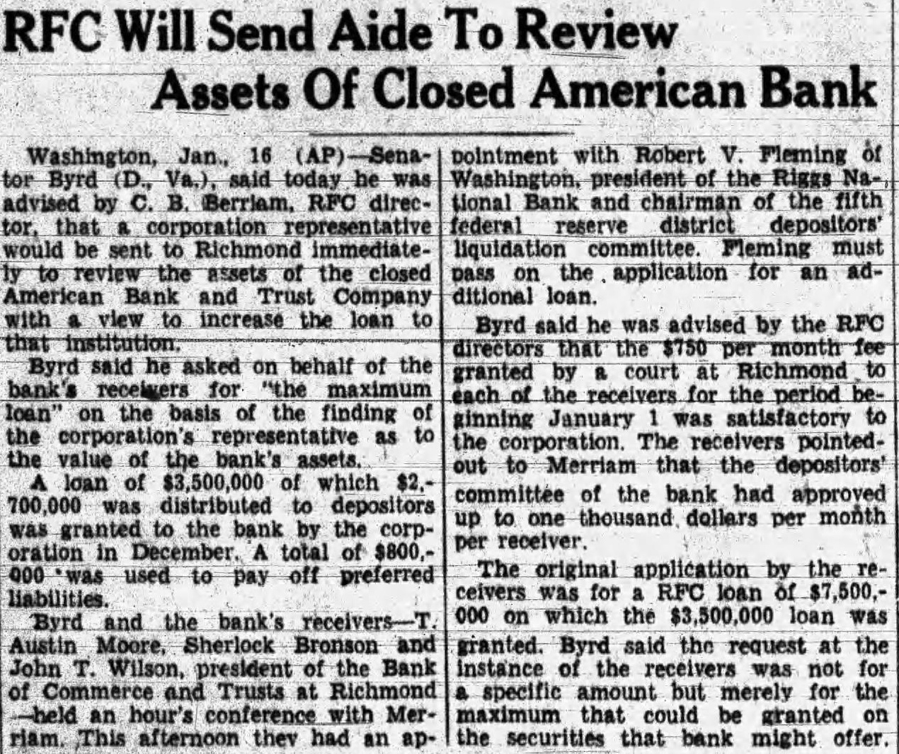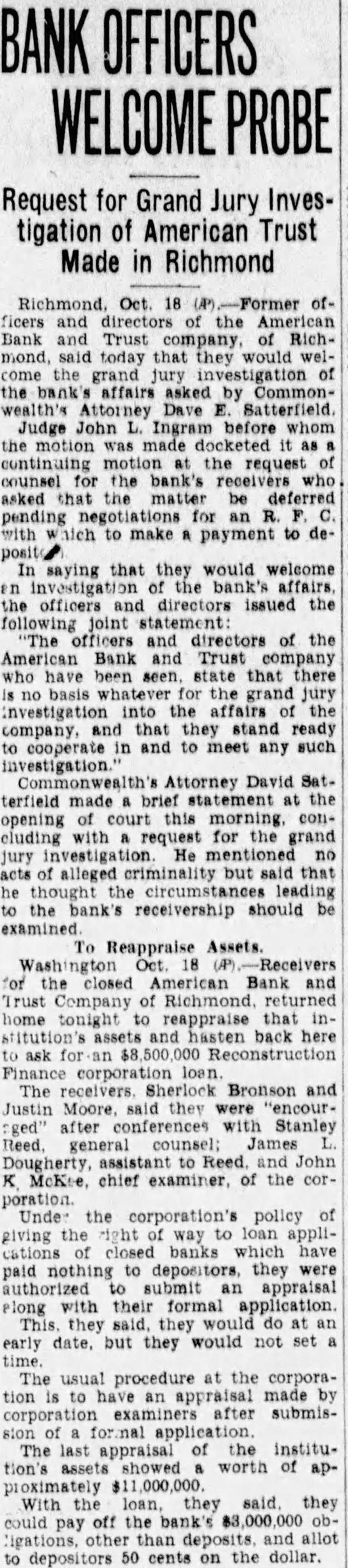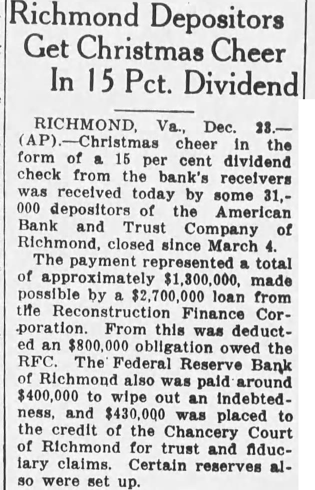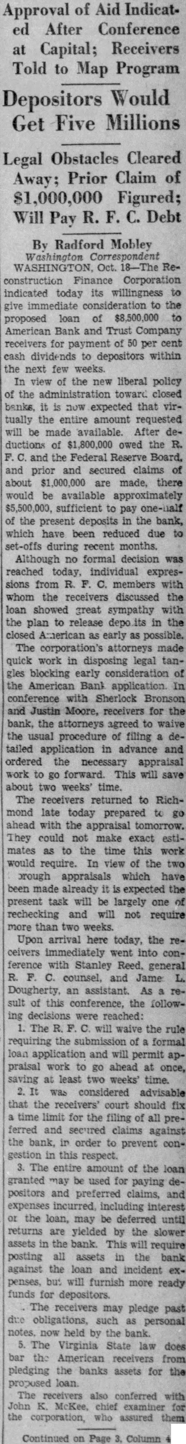 Receiver and Judge in Bank Situation of its claim against the bank amount$127,824.35. MISCELLANEOUS LIABILITIES the following: Deposits matured principal (Sched40) $27,482.68 Deposits to cover matured bond (Schedules and 25,064.00 Accounts payable, mortgage department (Schedule 24,522.98 accounts (Schedule 43) 49,425.88 principal and escrow items (Schedule 19) 19,081.54 payable (Schedule 45) 37,788.19 Total $269,934.65 None of these liabilities warrant special in this reThe statement of the condition of the bank shown the does (Exhibit page 40) tingent except by way comments and notes. Numerous claims of this character have been presented and receivers intimations the filing claims. suggested that perhaps the holders of $500,000 par value the can Office will provision the building the and that the holders the first certain the properties the building aggregating will assert claims based The capital, surplus and undivided composing liability $4,239,550.25 liabilities only qualified sense to the stockholders the cannot assert in proall paid full. As the and of creditors, full, further this except in connection with EARNINGS OF THE BANK As earnings indicative of the the assets producing earnings, your feel report would not be the records of the bank, for this 1928 and they length time, and In the general plan of banking, all profits through operations find reflection an acdesignated This account be considered be surplus addition the account specifically designated the surplus account the bank. The profits the (based upon the book the assets and the assets and liabilities 1928, The increase year, payment dividends, was but was the surplus $277,817.15 divided profits the trust department. believe that would generally that the year 1928 was from earnings standpoint in commerce and this the ings for this of any year under conprofits reduced 1929 from $594,reflecting loss operations and dividend payments of $108.282.07, although during this period income was credited the value of stock,' which was not During 1930, the undivided profits loss operations (and amounting to During the undivided profits reflecting loss from operations dividend $160,162.33. in spite the fact that the was credited contingency of whereas exdebited from transfer reserve for contingencies of only Undivided profits increased in 1932 from the addition being by credited "transfer profits from $300,000,' transfer surplus $500,000. transfer whereas reserve for contingencies of $613,The undivided profits of June 1933, were which is prac- ing of the usual demands for payment reinforcement security upon indebted the bank. would also appear difficult for place, respect action with respect might have led relationship between the bank the majority directors officers. Clause 48 Section 4149 does have applicable the facts set Clause Section being any stock the lending this owing to the bank corporation known Bankshare audit which has been filed with this report. of approximately per of the mon the tion which the officers and directors bank, for money by Corporation the all which will fully appear from the This corporation was chartered and the the was in of and shares as December 1929 the loans this corporation aggregated January the was increased and in to which was owing the bank June 1933. When loan was increased December and sum the credit the board of directors, and the loan was and inability of the institution offset this decline by reduction in In this connection quote from the M. Pullen Comcontained in the report the follows: "There well over million dollars in the bank's not paying having the the note In the bank was Vacar Corporation of $1,135,bank examiners of the State Virginia of the bank February 1932, and the shown to doubtful assets In stating the undivided profits account year quesshown that the extent $162,000, charged off in The feel that should this their condition the from examinaits records. manifest that acts omission on the part coupled the under which acts could and did for long period the causes for the colof the that the profrom 1929 furnished factors the following Officers and directors' loans. The majority the the board directors and all the executive officers (or corporations which such officers directors substantially interested) and the advisory the be the in large the ber of these in the and fall of 1929, but in number they largely increased after. These loans, generally ing, years are secured by marketable security values pay the loans, the able apeither pay substanNot only condition directors and but extended the junior officers The loans the indi(not porations) remaining unpaid gregate These figures include much larger sum due corporations which the are substantially by nor does their nor of their but later by it to its cusExcluding one who now ings deposit, the remaining and executive officers had net balances March savings accounts of officers or directors had list the loans to diset and It of the and officers may ated deterrent the application to proper credit standards conthe applications by others, and the mak- the individual guarantees of thirteen the and one stockholder not director, the as follows: the American Trust Richmond, the one year the date any any and sums which the said Bankshare Corporation owe the said American Trust Company Richmond, provided the liability the undersigned limited the amount opposite his hereunder year date by giving three to One hundred and thousand dollars these were by persons then and now debted the bank, and now unable, in the opinion the obligations this the not be paid the the sufficient and the loan could only be paid Bankshare Corporation long dividends received by on the stock of the would that possibly the needs had influence in the dividend 1929 rom $190,000 and the continuation of and 1931 for this amount, and the payment of in Clause Section 4149 permits banks lend money on real security and sell real feel that the tual influence and the the only did
