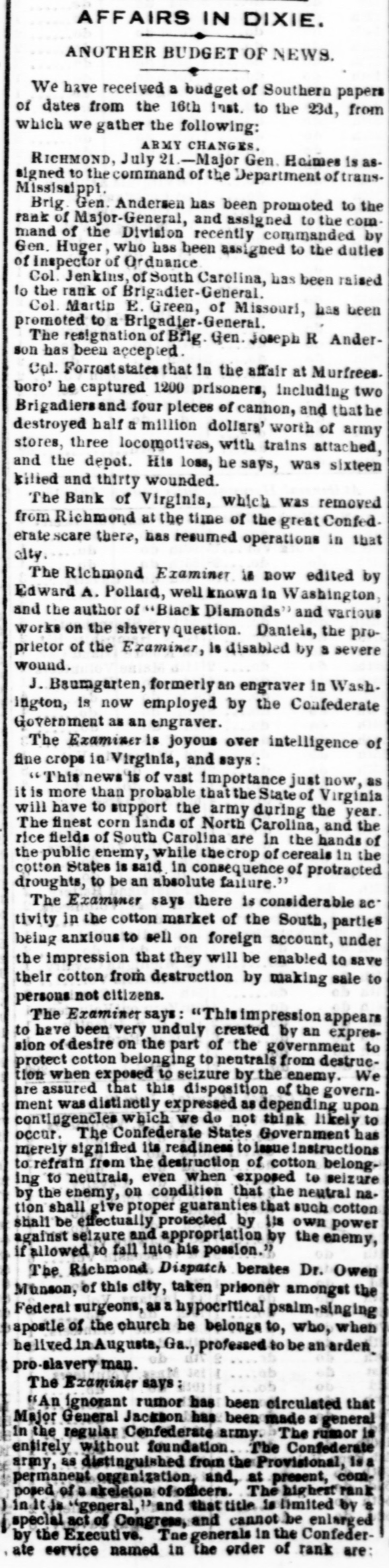 AFFAIRS IN DIXIE. ANOTHER BUDGET OF NEWS. We have received a budget of Southern papers of dates from the 16th inst. to the 23d, from which we gather the following: ARMY CHANGES. RICHMOND, July 21.-Major Gen. Holmes is assigned to the command of the Department of transMississippi. Brig Gen. Andersen has been promoted to the rank of Major-General, and assigned to the com mand of the Division recently commanded by Gen. Huger, who has been assigned to the duties of Inspector of Ordnance Col. Jenkins, of South Carolina, has been raised to the rank of Brigadier-General. Col. Martin E. Green, of Missouri, has been promoted to a Brigadier-General. The resignation of Brig. Gen. Joseph R Anderson has been accepted Cal. Forrest states that in the affair at Murfrees. boro' he captured 1200 prisoners, including two Brigadiers and four pieces of cannon, and that he destroyed half a million dollars' worth of army stores, three locomotives, with trains attached, and the depot. His loss, he says, was sixteen killed and thirty wounded. The Bank of Virginia, which was removed from Richmond at the time of the great Confed. erate scare there, has resumed operations in that city. The Richmond Examiner is now edited by Edward A. Pollard, well known in Washington, and the author of "Black Diamonds and various Works on the slavery question. Daniels, the proprietor of the Examiner, is disabled by a severe wound. J. Baumgarten, formerly an engraver in Wash. ington, is now employed by the Confederate Government as an engraver. The Examiner is joyous over intelligence of fine crops in Virginia, and says: This news is of vast importance just now, as it is more than probable that the State of Virginia will have to support the army during the year. The finest corn lands of North Carolina, and the rice fields of South Carolina are in the hands of the public enemy, while the crop of cereals in the cotten States is said in consequence of protracted droughts, to be an absolute failure." The Exammer says there is considerable ac tivity in the cotton market of the South, parties being anxious to sell on foreign account, under the impression that they will be enabled to save their cotton from destruction by making sale to persons not citizens. The Examiner says: "Thisimpression appears to have been very unduly created by an expression of desire on the part of the government to protect cotton belonging to neutrals from destruetion when exposed to seizure by the enemy. We are assured that this disposition of the government was distinctly expressed as depending upon contingencies which we do not think likely to occur. The Confederate States Government has merely signified its readiness to issue instructions to: refrain from the destruction of cotton belonging to neutrais, even when exposed to seizure by the enemy, on condition that the neutral nation shall give proper guaranties that such cotton shall be effectually protected by its own power against seizure and appropriation by the enemy, if allowed to fall into his possion." The Richmond Dispatch berates Dr. Owen Munson, of this city, taken prisoner amongst the Federal surgeons, as a hypocritical psalm-singing apostle of the church be belongs to, who, when belived in Augusta, Ga., professed to be an arden pro-slavery man. The Examiner says: "An ignorant rumor has been circulated that Major General Jackson has been made a general in the regular Confederate army. The rumor is entirely without foundation. The Confederate army, as distinguished from the Provisional, Isa permanent organization, and, at present, composed of a skeleton of officers. The highest rank in It and that act special is "general, of Congress, " and title cannot is limited be enlarged by a by the Executive. The generals in the Confederate service named in the order of rank are: