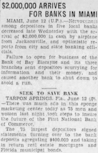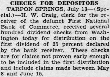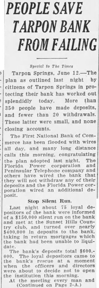 PEOPLE SAVE TARPON BANK FAILING Special The Times Tarpon Springs, June plan as outlined last night by citizens of Tarpon Springs in protecting their bank has worked out splendidly today. More than 350 people have made deposits, and fewer than 20 withdrawals. These latter were small, and none closing accounts. The First National Bank of Commerce has been flooded with wires all day. many long distance calls this morning, congratulating the plan adopted last night. Florida Power corporation Peninsular others wired the bank that they deposits poration wired an additional deposit. Stop Silent Run. Last night about 75 loyal debank were informed silent the bank and met the Sunset Hills Counclub. and turned over nearly $400,000 in the bank. taking which the bank had unable to liqui- The bank's deposits total 000. The loyal came the rescue moment when officers and directors about not open At meeting every and