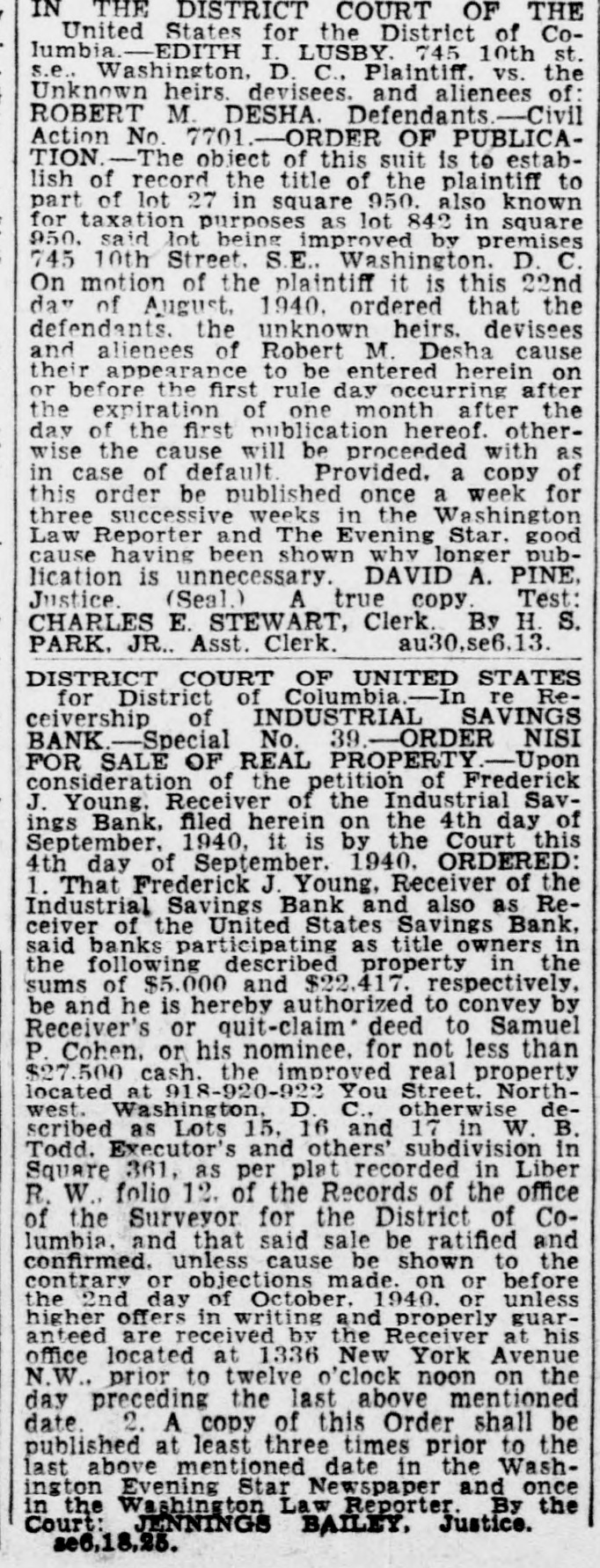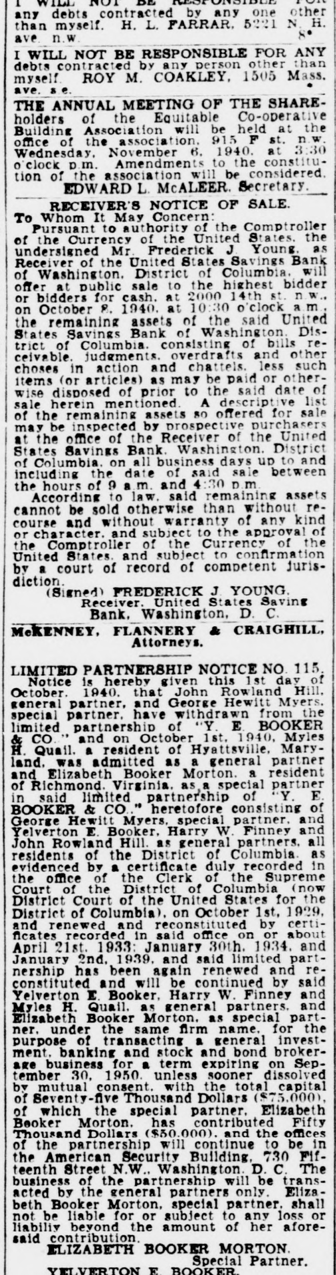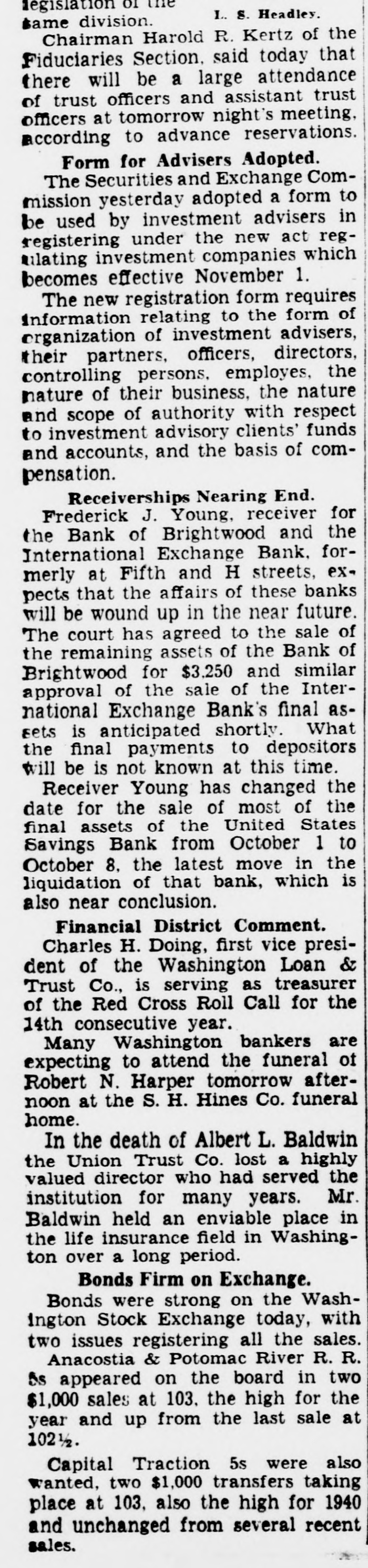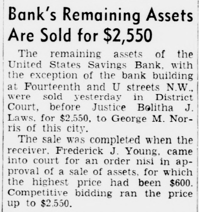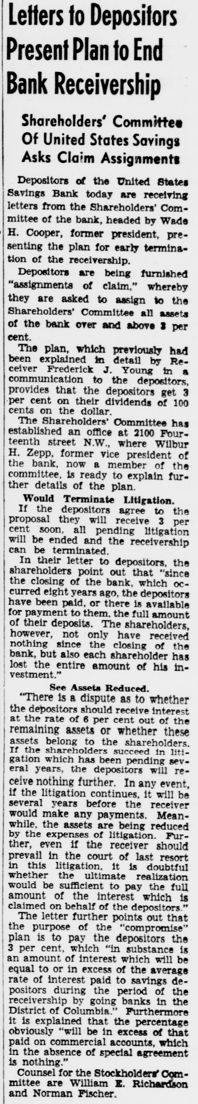 Letters to Depositors Present Plan to End Bank Receivership Shareholders' Committee Of United States Savings Asks Claim Assignments Depositors of the United States Savings Bank today are receiving letters from the Shareholders' Committee of the bank, headed by Wade H. Cooper, former president, presenting the plan for early termination of the receivership. Depositors are being furnished "assignments of claim," whereby they are asked to assign to the Shareholders' Committee all assets of the bank over and above 3 per cent. The plan, which previously had been explained in detail by in Re- a Frederick J. Young communication ceiver to the depositors, 3 provides that the depositors get 100 per cent on their dividends of cents on the dollar. The Shareholders' Committee has established an office at 2100 Fourteenth street N.W., where Wilbur of former vice president the H. now a member the is ready to ther details of the committee, Zepp, bank, plan. Litigation. explain of furWould Terminate depositors agree to the they will receive all pending cent ended and the will proposal If be the soon, receivership litigation 3 per can be terminated. their letter to depositors, "since the shareholders In point out that occlosing of the bank, which the eight years ago, the depositors available curred been paid, or there is amount have payment to them. the full for their deposits. The shareholders, received of not only have of the however, since the closing has nothing but also each shareholder his inbank, lost the entire amount of vestment." See Assets Reduced. "There is a dispute as to whether interest depositors should receive of the the rate of 6 per cent out at assets or belong to the in assets shareholders succeed If the which has been will remaining the whether shareholders. pending these sev- liti- regation the depositors further. In any will litigation continues, if years before the ceive several eral the years, nothing it receiver Mean- event, be make any payments. reduced the assets are being Furexpenses of the if the receiver ther, by while, would even litigation. of last doubtful should resort prevail in litigation. the court it is in whether the sufficient to pay the would of the interest this be ultimate depositors." realization which full is amount on behalf of the out that further points The of the the claimed purpose letter depositors "compromise" is the is to pay the substance plan cent, which "in which will be 3 per of interest the an in excess of equal to interest or paid to of rate amount of period savings average de- the the positors during by going the banks in of the "will explained that of it District receivership obviously is Columbia." be in accounts, excess Furthermore percentage which that paid on absence of special for the is in nothing." the commercial Stockholders' Richardson agreement ComCounsel are William E. mittee and Norman Fischer.