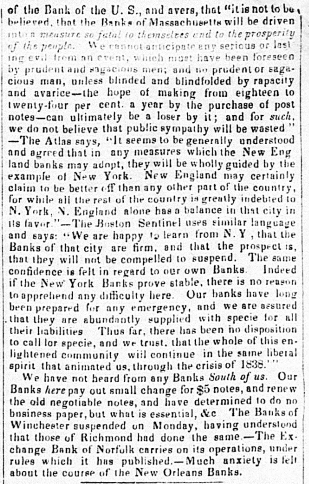 THE SUSPENSION. From the Richmond Compiler, October 15. SUSPENSION OF SPECIE PAYMENTS. was received in this city yesterday of suspensions by the and Baltimore, and morning adelphia News Banks by the in U. Phil- S. Bank in New York, whereupon meetings of the Directors of ourdifferent Banks were convened and they resolved to suspend specie payments for the present. This course by our Banks, was one unavoidable; and adopted in justice to the Banks themselves, to the trade and interests of Richmond, and to the State: which is a large stockholder in them all. For some time our Banks have had to supply heavy demands upon them from the North for specie; and there were in this city, yesterday, several Northern brokers awaiting the hour of9 o'clock, to make large drafts upon them. But the Directors wisely closed the vaults against them, for it would have been suicidal to pay out when there are no longer means of replenishing, left them. The alternative was presented of suspending immediately, or of submitting to a drain through the brokers, which would in a few weeks either compel them to stop business or suspend specie payments. In the former case our trade would have stopped, and our merchants would have been ruined-in the latter the Banks would have weakened themselves in a manner that would have made resumption still the more difficult with them when the time might arrive. Our Banks did not hesitate, and they ought not to have hesitated. They are justified by our citizens.- the annunciation of their determination all was calm, and there was a general indication of satisfaction at the event. The people in the country may rest assured that our Banks have taken their course under circumstances and in a condition which should impart the most perfect confidence in them. They will be ready to resume the moment the course of the Northern Banks render that expedient and proper. The country has fallen into its present miserable condition, through a series of measures which have been levelled at the banking institutions of the State, and have involved the People and the Union in a common catastrophe. The National Bank was destroyed to strengthen the States; and to give them a better currency in the bills of their local institutions. Now the State banks must be destroyed, to strengthen the Federal Government; and to substitute the paper of the Treasury for the paper of the States. The whole process has carried through from the beginning, the whole war has been waged against the National Bank and the State Banks, to realise the original plan of Gen. Jackson for the organization of an Executive Bank, "with the necessary officersas branch of the Treasury department,"-with Mr. Woodbury for the President, Custom House Collectors as deputy presidents of the branches, and your whole Post Office department an association of financial agents and brokers. To this complexion comes the policy of the administration, painted though it may be an inch thick. Are the American people prepared to sacrifice the banking system of the States, to consummate this dangerous union of political and-monied power hands of the Federal Administration.-New York Courier. The Richmond Whig appropriately brings to mind the remark of T.H. BENTON, in ter, that "ANOTHER SUSPENSION BY THE BANKS MAY BE NECESSARY TO CARRY THROUGH THIS GREAT MEASURE"-meaning the sub-Treasury. This has been the whole and sole desire of the Government. "Give us a suspension," say "and can carry the sub-Treasury.' They have succeeded in their effortsperhaps will succeed in obtaining their darling measure. We shall at any rate see how far they can succeed in repairing the mischief all they have accomplished. The people of parties will lock anxiously for the result.BALT. PAT. "Shall ours be a Government of the Banks, or a Government of the People ?" asks a Van Buren paper. Since the expiration of the charter of the U. States Bank, the Jackson and Van Buren Legislatures of the several States seem to have vied with each other in the manufacture of Banks.-They have increased in the Van Buren States as fast as newspapers; and at the present moment, Van Buren men are giving notice throughout Maryland, of their determination to apply to the Legislature for Bank charters. Let the Van Buren people, then, answer the question. "Shall we have (continues the Van Buren paper) a constitutional treasury, or an unconstitutional treasury ?" We do not see that it is likely to make much difference what the treasury is, inasmuch as the public money is carried off the new kind of public treasurers as rapidly almost as it is collected. Nothing of this kind took place when the public funds were kept by the United States Bank.--Balt. Chron. The gratification of the office-holders at the suspension of specie payments may be traced to the fact that now, asduring the late suspension, they can make a "handsome penny" by selling the specie checks they receive for their salaries. Specie will perhaps be worth 5, 10, or 15 per cent., and the officers of the government being paid in specie can readily make the evchange for bank notes, much to their pecuniary advantage. "One currency for the government and another for the people, is their delight, and so long as they can preserve this state of things they will doubtless doit.-Balt. Chron. PUT UP THE FENCE! The opinion prevails extensively-it spreading widely, and the conviction of its correctness the with all resources, in United cannot States, grows get along stronger smoothly, her and mighty stronger-that her business affairs, without the aid of protecting tar-