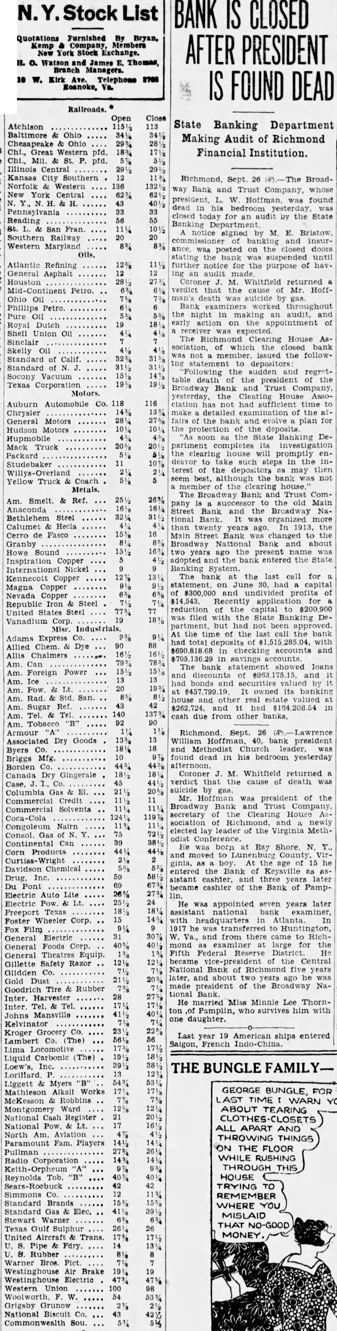 Stock List Quotations Furnished Bryan, Kemp Company, Members New York Stock Exchange. H. Watson and James Thomas, Branch 10 W. Kirk Va. Railroads. Open Close Atchison State Banking Department Baltimore Ohio Making Audit of Richmond Chesapeake Ohio Great Western pfd. Financial Institution. Chi., Mil. pfd. Illinois Central Kansas City Southern Richmond, Sept. 26 BroadNorfolk Western 136 way Bank and Trust Company, whose New York Central 62% president, was found H. in his Pennsylvania closed today for an audit by the State Reading Banking San Fran. notice signed by M. E. Bristow Southern Railway 20 banking and insurWestern Maryland 8% 8% was posted on the closed doors stating the bank suspended until Atlantic Refining 12% further notice for the purpose of havGeneral Asphalt 12 Houston 27% M. Whitfield returned Petro. 6% verdict that the cause Mr. HoffOhio Oil was suicide by Bank throughout Phillips the night in making audit, and Pure 5% 5% 19 early action on the appointment of Royal Dutch receiver was Shell Union Oil Clearing House AsSinclair sociation, which the bank Skelly Oil was not member. issued the followStandard of Calif. 32% to depositors Standard of Following the sudden regretSocony Vacuum death the Texas Corporation 19% 19½ Broadway Bank Trust Company, Motors. the Clearing House AssoAuburn Automobile Co. 118 116 clation has not sufficient time to Chrysler make detailed examination of the General Motors fairs of the and evolve plan for Hudson Motors the protection of the deposits Banking DeHupmobile Mack Truck 20% its investigation Packard the will promptly deavor to such steps in the Studebaker terest of the depositors may then best, although the bank was not Yellow Truck Coach member of the clearing Metals. The Broadway Bank and Trust ComSmelt. & Ref. 26% Am. pany to the old Main Anaconda Street Bank and the Broadway NaBethlehem Steel tional Calumet Hecla than twenty years ago In the Cerro de Fasco 15% Main Street Bank changed to the Granby 8% Broadway National Bank about Howe Sound 15½ 16% two ago present name years Inspiration Copper adopted and bank entered the State International Nickel Banking System. 12% The bank the last call for Kennecott Copper 30, capital Magna Copper 6% 6% $300,000 profits of Nevada Copper $14,543. for Republic Iron Steel reduction of the capital $200,900 United States Steel 77% filed with the State Banking DeVanadium Corp. partment but had not been approved Misc. At the time of the last call the bank Adams Express had total deposits with Allied Dye 90 in checking accounts and Allis Chalmers in savings accounts. Am. The bank loans Am. Foreign Power and and Am. Ice bonds and securities Fow. 19% Am. owned its banking Rad. Std. San. 8% 8½ Am. house other real estate valued 42 Am. Sugar Ref. and had in Am. Tel. 140 137% cash due from other banks, Tobacco 92 90 Am. Armour 1½ Richmond, Sept. 26 Associated Dry Goods 13% 40, bank president Byers and Methodist Briggs Mfg. 9% dead in his bedroom yesterday Borden Co. 44% afternoon. Dry Gingerale 18½ Coroner M. Whitfield returned Canada Co. verdict that the cause of death was Case, Columbia Gas E1. 20% suicide by Mr. Hoffman was president of the Commercial Credit 11½ 11 Broadway and Trust Company, Commercial Solvents secretary of the Clearing House AsCoca-Cola 119% sociation newly Congoleum Nairn elected lay leader of the Virginia MethConsol. Gas odist Continental Can Fe was born at Bay N. Corn Products and moved County, Vir2½ ginia, boy. At the age 15 he Davidson Chemical 5% entered the Bank of Keysville as asDrug. sistant cashier, and years became cashier of the Bank of PampElectric Auto Lite 26% 27% Electric Pow. Lt. 24 He was appointed seven years later Freeport Texas 18½ assistant national bank examiner, Foster Wheeler Corp. 15 14% with headquarters Atlanta. In Fox Film 1917 he was transferred Huntington, General Electric 30% Va., and from there came to RichGeneral Foods Corp. 40% mond examiner large for the Fifth Federal Reserve District He General Theatres Equip. became of the Central Gillette Safety Razor National Bank of years Glidden Co. 20% later, about ago he was Gold Dust made president of the Broadway NaGoodrich Tire & Rubber tional Inter. Harvester 28 27% He married Miss Minnie Lee ThornInter. ton Pamplin, who survives him with Johns Mansville one daughter. Kelvinator Kroger Co. 22% Last year 19 American ships entered Lambert Co. (The) 56 Saigon, French Indo-China. Lima Locomotive 17½ Liquid Carbonic (The) Loew's, Inc. THE BUNGLE Liggett & Myers 54% Mathieson Works 17½ GEORGE BUNGLE FOR THE McKesson Robbins LAST TIME WARN YOU Montgomery Ward 12% ABOUT TEARING National Cash Register National Pow. Lt. ALL APART AND North Am. Aviation THROWING THINGS Paramount Fam. Players ON THE FLOOR Pullman WHILE RUSHING Radio Corporation "A" THIS Reynolds Tob. "B" 40% HOUSE 42 42 TRYING Simmons 11% REMEMBER Standard Brands 15% WHERE YOU Standard Gas Elec. MISLAID Stewart Warner 6% THAT NO-GOOD Texas Sulphur 26 MONEY United Aircraft Trans. 17% Pipe Fdry. 14 Rubber Warner Bros. Pict Westinghouse Air Brake 19 Westinghouse Electric 47% Western Union 100 98 W. 54 53% Grigsby Grunow 2% National Biscuit Co. Commonwealth Sou. 5%