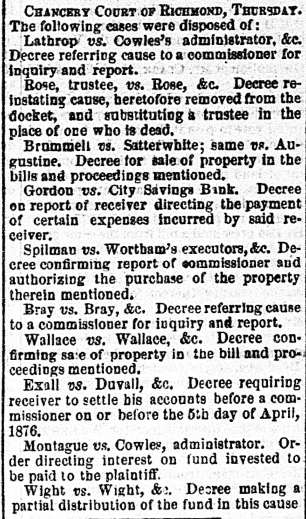 CHANCERY COURT OF RICHMOND, THURSDAY. The following cases were disposed of: Lathrop vs. Cowles's administrator, &c. Decree referring cause to a commissioner for inquiry and report. Rose, trustee, vs. Rose, &c. Decree reinstating cause, beretofore removed from the docket, and substituting a trustee in the place of one who is dead. Brommelt vs. Satterwhite; same vs. Augustine. Decree for sale of property in the bills and proceedings mentioned. Gordon vs. City Savings Bink. Decree on report of receiver directing the payment of certain expenses incurred by said receiver. Spilman vs. Wortbam's executors, &c. Decree confirming report of commissioner and authorizing the purchase of the property therein mentioned. Bray vs. Bray, &c. Decree referring cause to a commissioner for inquiry and report. Wallace vs. Wallace, &c. Decree confirming sale of property in the bill and proceedings mentioned. Exall vs. Duvall, &c. Decree requiring receiver to settle bis accounts before a commissioner on or before the 5th day of April, 1876. Montague US. Cowles, administrator. Order directing interest on fund invested to be paid to the plaintiff. Wight vs. Wight, & Decree making a partial distribution of the fund in this cause