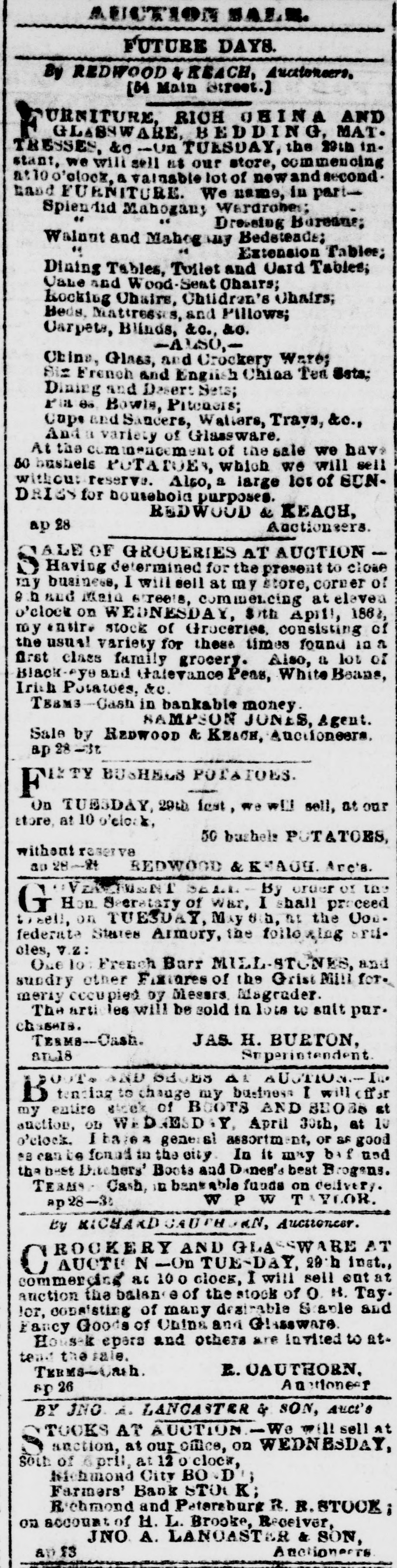 FURNITURE, RICH CHINA AND GLASSWARE, BEDDING, MATTRESSES, &c - Un TUESDAY, the 29th instant, we will sell at our store, commencing at 10 o'clock, a valuable lot of new and second-hand FURNITURE. We name, in part-
