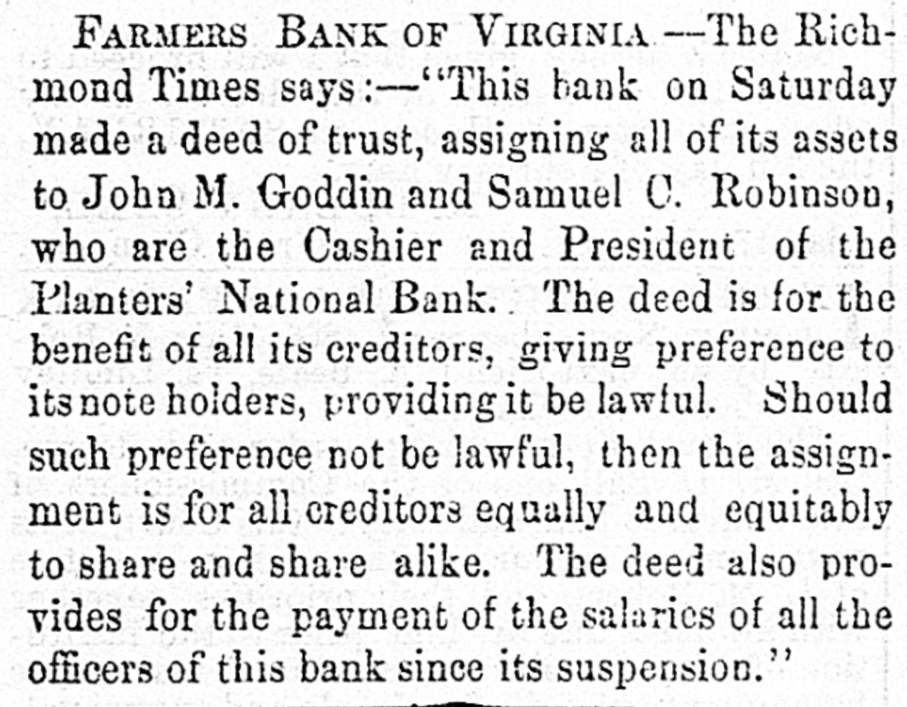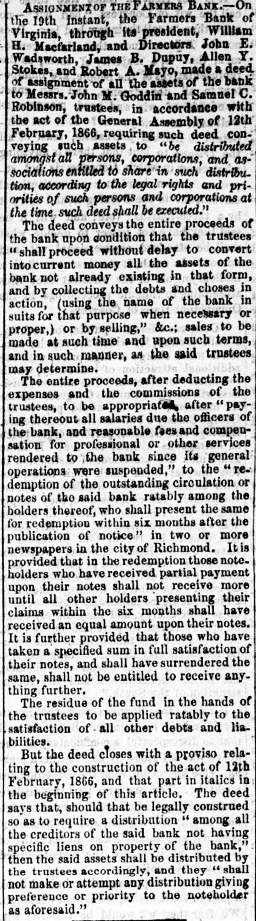 ASSIGNMENT OF THE FARMERS BANK.-On the 19th instant, the Farmers Bank of Virginia, through its president, William H. Macfarland, and Directors John E. Wadsworth, James B. Dupuy, Allen Y. Stokes, and Robert A. Mayo, made a deed of assignment of all the assets of the bank to Messrs. John M. Goddin and Samuel C. Robinson, trustees, in accordance with the act of the General Assembly of 12th February, 1866, requiring such deed conveying such assets to be distributed amongst all persons, corporations, and associations entitled to share in such distribution, according to the legal rights and priorities of such persons and corporations at the time such deed shall be executed." The deed conveys the entire proceeds of the bank upon condition that the trustees "shall proceed without delay to convert into current money all the assets of the existing in that form, and the debts the name action, bank by not collecting (using already of and the choses bank in in suits for that purpose when necessary or proper,) or by selling," &c.; sales to be made at such time and upon such terms, and in such manner, as the said trustees may determine. The entire proceeds, after deducting the expenses and the commissions of the trustees, to be appropriated after " paying thereout all salaries due the officers of the bank, and reasonable faes and compensation for professional or other services rendered to the bank since its general operations were suspended," to the redemption of the outstanding circulation or notes of the said bank ratably among the holders thereof, who shall present the same for redemption within six months after the publication of notice" in two or more newspapers in the city of Richmond. It is provided that in the redemption those note. holders who have received partial payment upon their notes shall not receive more until all other holders presenting their claims within the six months shall have received an equal amount upon their notes. It is further provided that those who have taken a specified sum in full satisfaction of their notes, and shall have surrendered the same, shall not be entitled to receive anything further. The residue of the fund in the hands of the trustees to be applied ratably to the satisfaction of all other debts and liabilities. But the deed closes with a proviso relating to the construction of the act of 12th February, 1866, and that part in italics in the beginning of this article. The deed says that, should that be legally construed SO as to require a distribution " among all the creditors of the said bank not having specific liens on property of the bank," then the said assets shall be distributed by the trustees accordingly, and they " shall not make or attempt any distribution giving preference or priority to the noteholder as aforesaid."