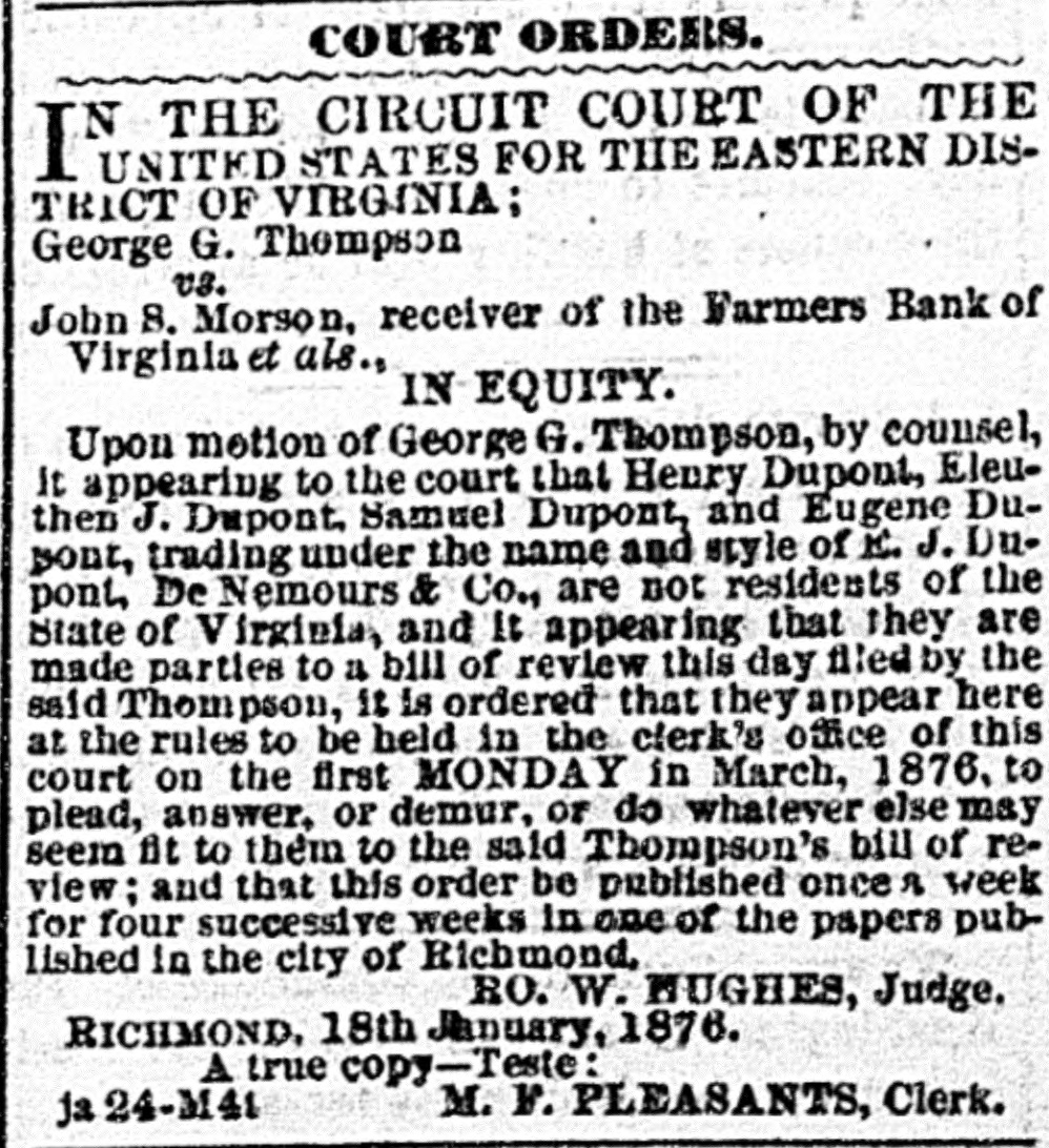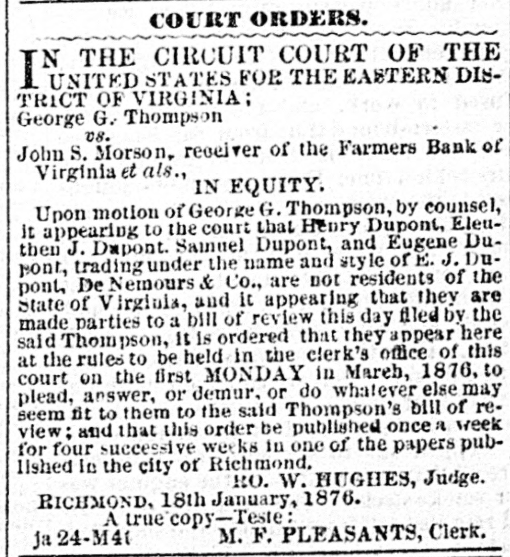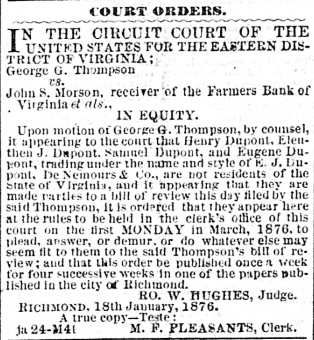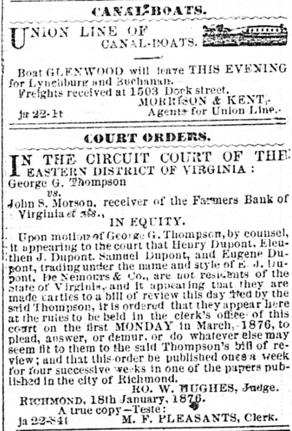 CANALBOATS. CANAL-DOATS. UNION LINE OF Boat GL ENWOOD will leave THIS EVENING for Lynehburg and Buchanan. Freights received at 1503 Dock street. MORRISON & KENT, Agents for Union Line. ju 22.1t COURT ORDERS. CIRCUIT COURT OF THE DISTRICT OF VIRGINIA: George G. Thompson John S. vs. Morson. receiver of the Farmers Bank of Virginia et 368., IN EQUITY. Upon motiou of George G. Thompson, by counsel, it appearing to the court that Henry Dupont, Eleuthen J. Dupont. Samuel Dupont, and Eugene Dupont, trading under the name and style of E. J. Dupont, De Nemours & Co., are not residents of the state of V irginia, and it appearing that they are made carties to a bill of review this day thed by the said Thompson, it is ordered that they appear here at the rules to be held in the clerk's office of this court on the first MONDAY in March, 1876, to plead, answer, or demur. or do whatever else may seem fit to them to the sald Thompson's bill of review; and that this order be published ones's week for four successive weeks in one of the papers published in the city of Richmond. RO. W. HUGHES, Judge. RICHMOND, 18th January, 1876. A true copy-Teste: M. F. PLEASANTS, Clerk. ja 22-S41