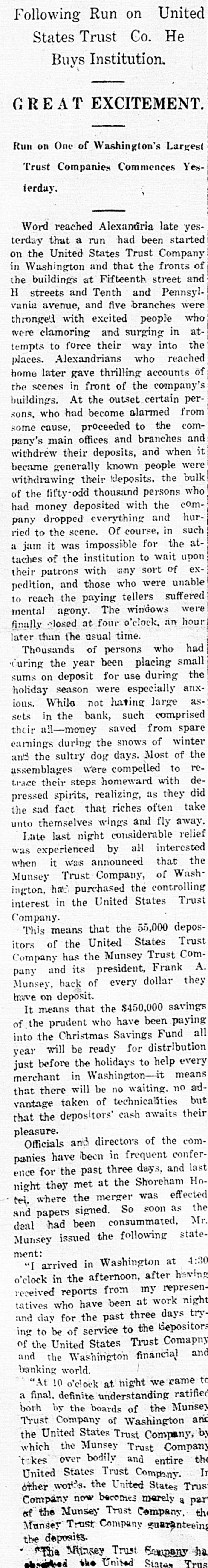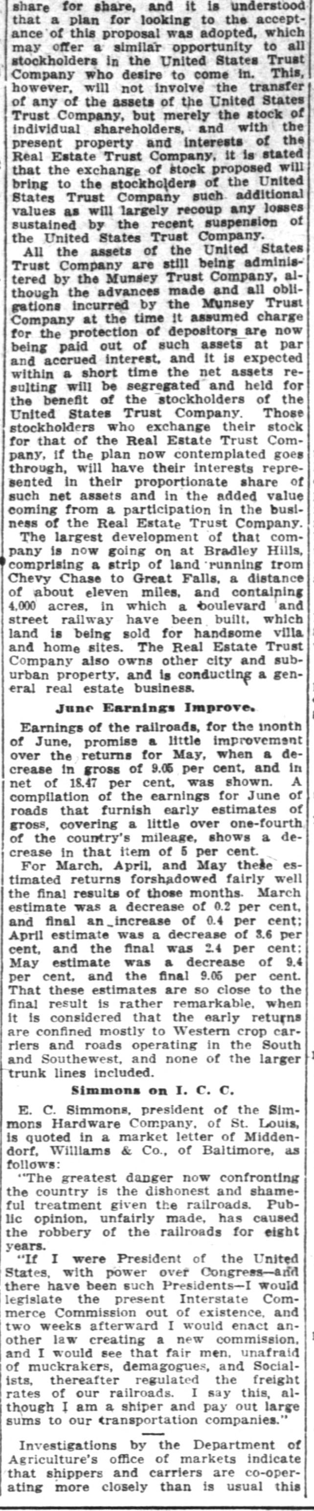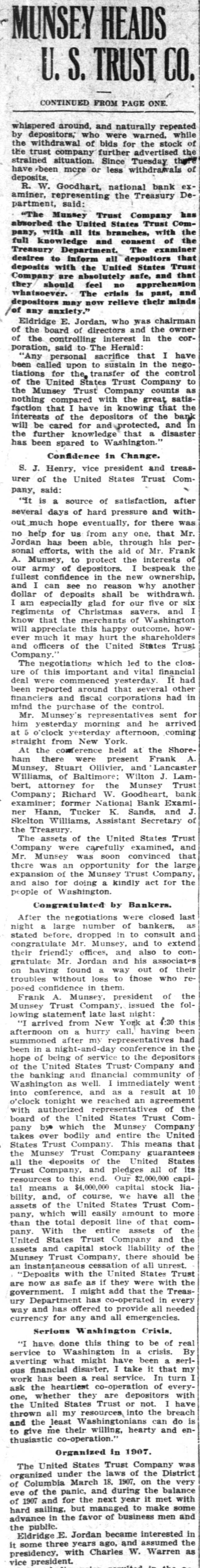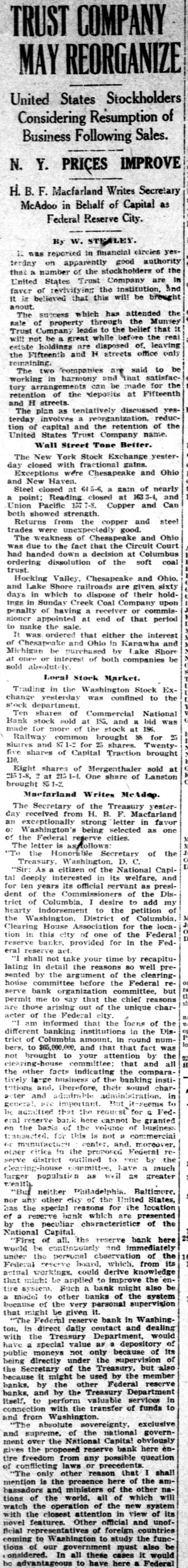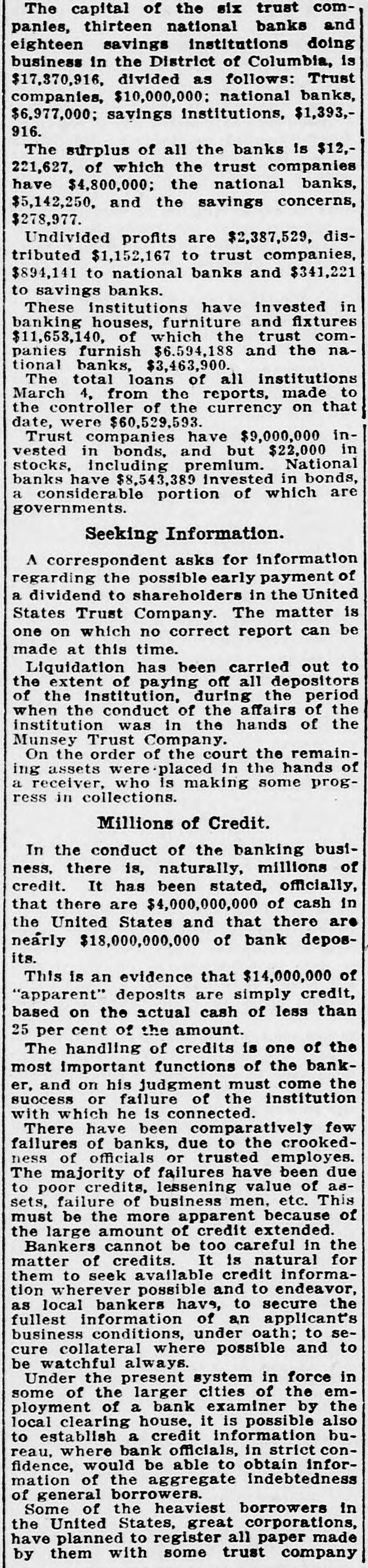 The capital of the six trust com panies, thirteen national banks and eighteen savings institutions doing business in the District of Columbia, is $17,370,916, divided as follows: Trust companies, $10,000,000; national banks, $6,977,000; savings institutions, $1,393,916. The surplus of all the banks is $12,221,627, of which the trust companies have $4,800,000; the national banks, $5,142,250. and the savings concerns, $278,977. Undivided profits are $2,387,529, distributed $1,152,167 to trust companies, $894,141 to national banks and $341,221 to savings banks. These institutions have invested in banking houses, furniture and fixtures $11,653,140, of which the trust companies furnish $6.594,188 and the national banks, $3,463,900. The total loans of all institutions March 4. from the reports, made to the controller of the currency on that date, were $60,529,593. Trust companies have $9,000,000 invested in bonds, and but $22,000 in stocks, including premium. National banks have $8,543,389 Invested in bonds, a considerable portion of which are governments. Seeking Information. A correspondent asks for information regarding the possible early payment of a dividend to shareholders in the United States Trust Company. The matter is one on which no correct report can be made at this time. Liquidation has been carried out to the extent of paying off all depositors of the Institution, during the period when the conduct of the affairs of the institution was in the hands of the Munsey Trust Company. On the order of the court the remaining assets were-placed in the hands of a receiver, who is making some progress in collections. Millions of Credit. In the conduct of the banking business, there is, naturally, millions of credit. It has been stated, officially, that there are $4,000,000,000 of cash in the United States and that there are nearly $18,000,000,000 of bank deposits. This is an evidence that $14,000,000 of "apparent" deposits are simply credit, based on the actual cash of less than 25 per cent of the amount. The handling of credits is one of the most important functions of the banker, and on his judgment must come the success or failure of the institution with which he is connected. There have been comparatively few failures of banks, due to the crookedness of officials or trusted employes. The majority of failures have been due to poor credits, lessening value of assets, failure of business men, etc. This must be the more apparent because of the large amount of credit extended. Bankers cannot be too careful in the matter of credits. It is natural for them to seek available credit information wherever possible and to endeavor, as local bankers have, to secure the fullest information of an applicant's business conditions, under oath: to secure collateral where possible and to be watchful always. Under the present system in force in some of the larger cities of the employment of a bank examiner by the local clearing house, it is possible also to establish a credit information bureau, where bank officials, in strict confidence, would be able to obtain information of the aggregate indebtedness of general borrowers. Some of the heaviest borrowers in the United States, great corporations, have planned to register all paper made by them with some trust company