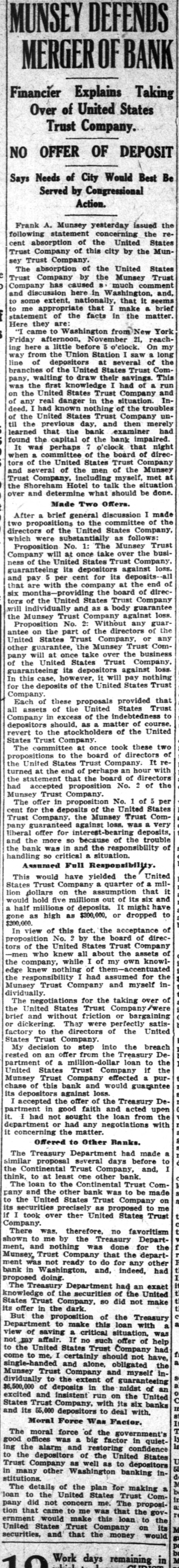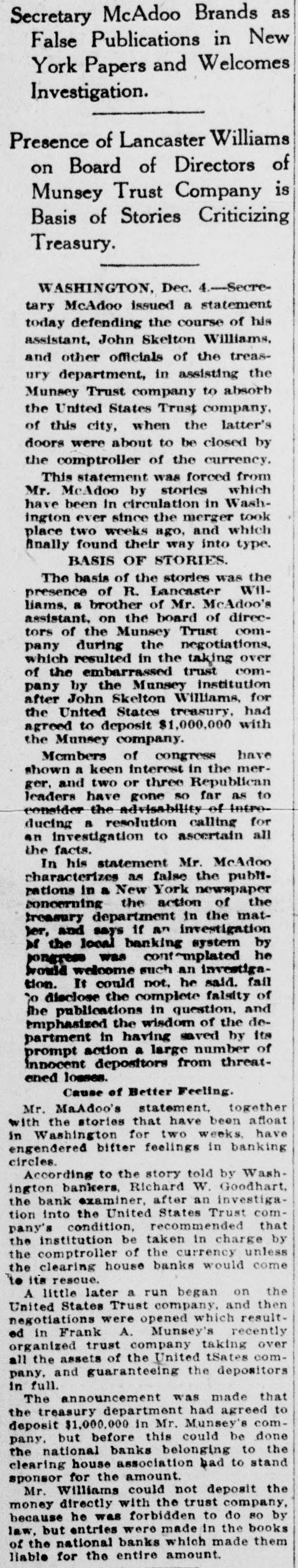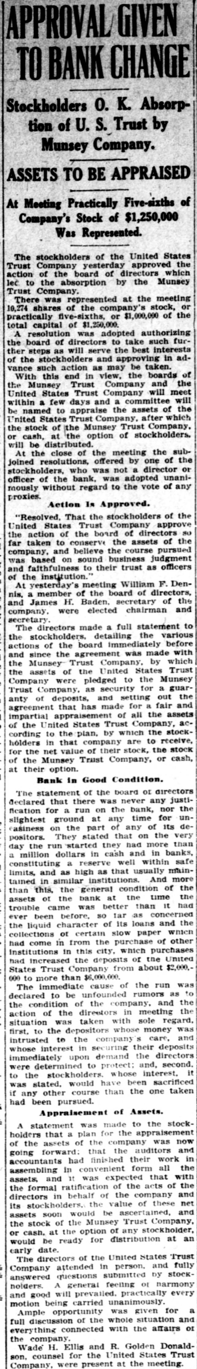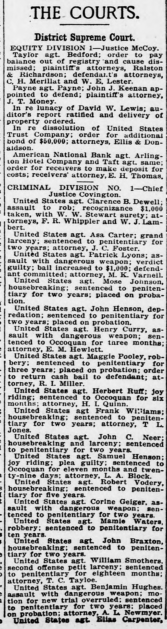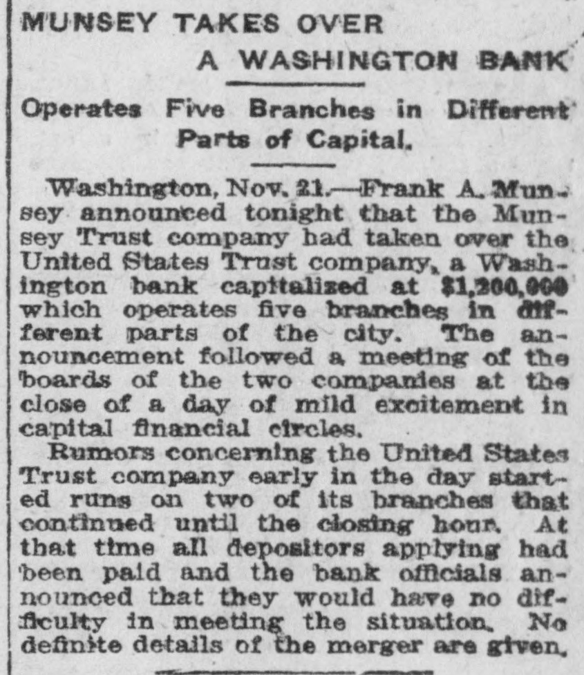 The capital of the six trust com panies, thirteen national banks and eighteen savings institutions doing business in the District of Columbia, is $17,370,916, divided as follows: Trust companies, $10,000,000; national banks, $6,977,000; savings institutions, $1,393,916. The surplus of all the banks is $12,221,627, of which the trust companies have $4,800,000; the national banks, $5,142,250. and the savings concerns, $278,977. Undivided profits are $2,387,529, distributed $1,152,167 to trust companies, $894,141 to national banks and $341,221 to savings banks. These institutions have invested in banking houses, furniture and fixtures $11,653,140, of which the trust companies furnish $6.594,188 and the national banks, $3,463,900. The total loans of all institutions March 4. from the reports, made to the controller of the currency on that date, were $60,529,593. Trust companies have $9,000,000 invested in bonds, and but $22,000 in stocks, including premium. National banks have $8,543,389 Invested in bonds, a considerable portion of which are governments. Seeking Information. A correspondent asks for information regarding the possible early payment of a dividend to shareholders in the United States Trust Company. The matter is one on which no correct report can be made at this time. Liquidation has been carried out to the extent of paying off all depositors of the Institution, during the period when the conduct of the affairs of the institution was in the hands of the Munsey Trust Company. On the order of the court the remaining assets were-placed in the hands of a receiver, who is making some progress in collections. Millions of Credit. In the conduct of the banking business, there is, naturally, millions of credit. It has been stated, officially, that there are $4,000,000,000 of cash in the United States and that there are nearly $18,000,000,000 of bank deposits. This is an evidence that $14,000,000 of "apparent" deposits are simply credit, based on the actual cash of less than 25 per cent of the amount. The handling of credits is one of the most important functions of the banker, and on his judgment must come the success or failure of the institution with which he is connected. There have been comparatively few failures of banks, due to the crookedness of officials or trusted employes. The majority of failures have been due to poor credits, lessening value of assets, failure of business men, etc. This must be the more apparent because of the large amount of credit extended. Bankers cannot be too careful in the matter of credits. It is natural for them to seek available credit information wherever possible and to endeavor, as local bankers have, to secure the fullest information of an applicant's business conditions, under oath: to secure collateral where possible and to be watchful always. Under the present system in force in some of the larger cities of the employment of a bank examiner by the local clearing house, it is possible also to establish a credit information bureau, where bank officials, in strict confidence, would be able to obtain information of the aggregate indebtedness of general borrowers. Some of the heaviest borrowers in the United States, great corporations, have planned to register all paper made by them with some trust company