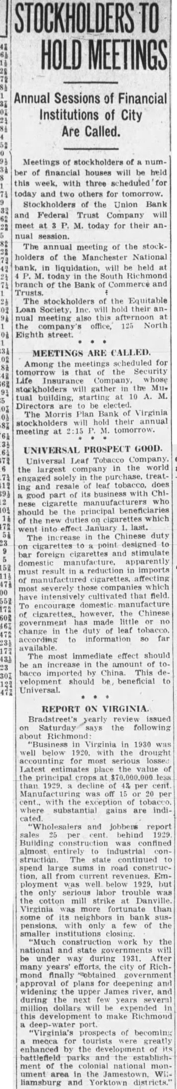 STOCKHOLDERS TO HOLD MEETINGS Annual Sessions of Financial Institutions of City Are Called. Meetings of stockholders of number of financial houses will be held this week. with three scheduled for today others for tomorrow. Stockholders of the Union Bank and Federal Trust Company will meet at M. today for their ansession. The annual meeting of the stockholders of the Manchester National bank, in liquidation, will held at the South Richmond branch of the Bank of Commerce and Trusts. The stockholders of the Equitable Society, will their meeting this at the company's office, 125 North Eighth street. MEETINGS ARE CALLED. Among the meetings for tomorrow that the Security Life Insurance Company, stockholders will gather the Mu. building, starting 10 A. M. The Morris Plan Bank Virginia hold their annual meeting at tomorrow. UNIVERSAL PROSPECT GOOD. Universal Leaf Tobacco Company, the largest in the world solely in the treatresale of leaf does ing and good part its business with Chiwho nese cigarette should be the principal beneficiaries the new duties cigarettes which went into effect the Chinese duty designed to bar foreign and stimulate manufacture. apparently must result reduction in imports severely which most have intensively cultivated that field. encourage domestic manufacture To cigarettes, however, the Chinese government made little change the leaf according information far available The immediate effect should an increase in the of toimported China. This development should beneficial Universal. REPORT ON VIRGINIA. Bradstreet's yearly review issued Saturday says the following "Business in Virginia in 1930 was well below 1920. with the drought for Latest place the at less 43 per cent. was off 15 20 per the where substantial gains are indi"Wholesalers and jobbers report sales 25 per behind 1929 Building almost entirely to industrial The state continued spend large sums in road all from current Employment was well below 1929. but the labor was the cotton strike Danville. Virginia than some in bank suspensions, with only few of the closing "Much construction work by the national and state will under during 1931. After many years' the city of Richmond finally approval plans and widening James and during the few years million dollars will expended this development to make "Virginia's prospects of becoming mecca for tourists greatly enhanced by the battlefield and the ment the national liamsburg and Yorktown districts.
