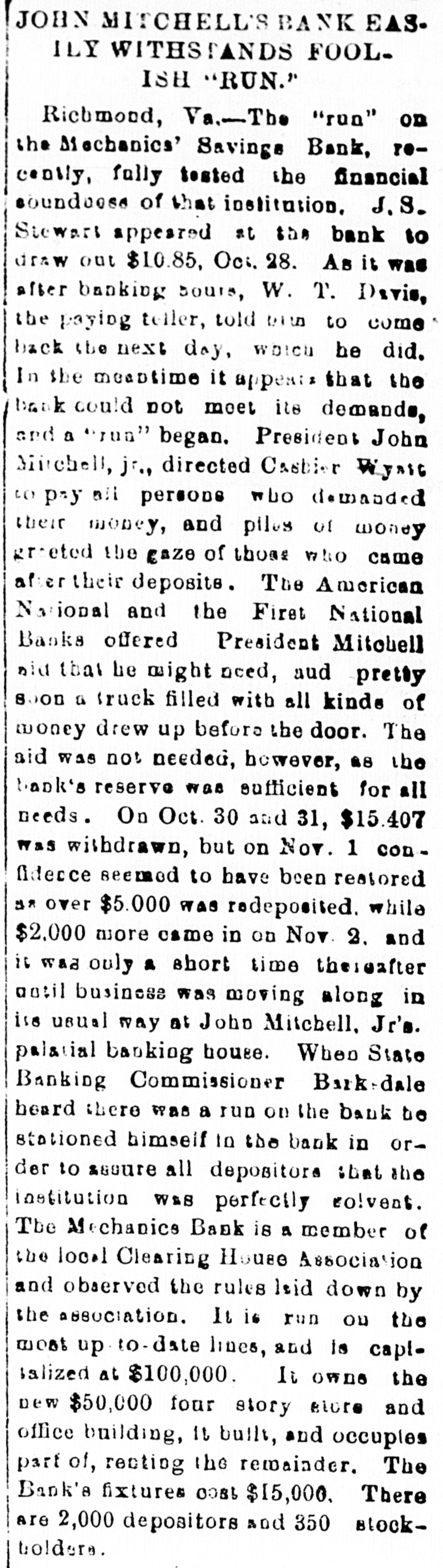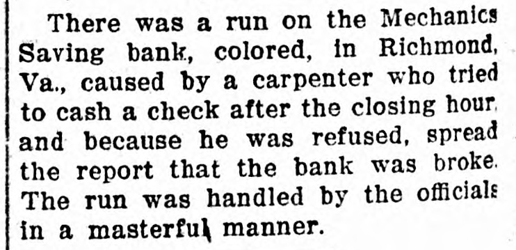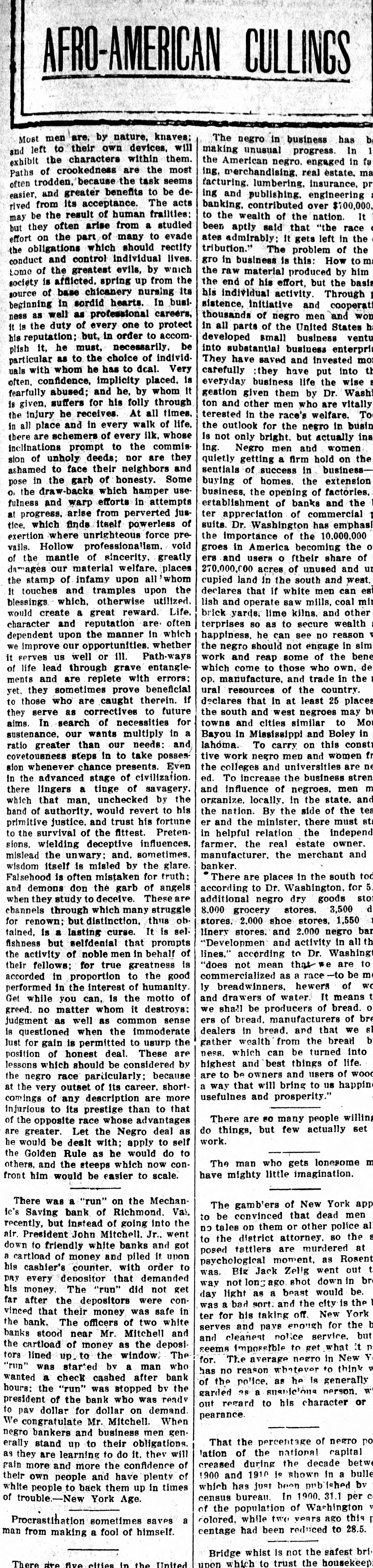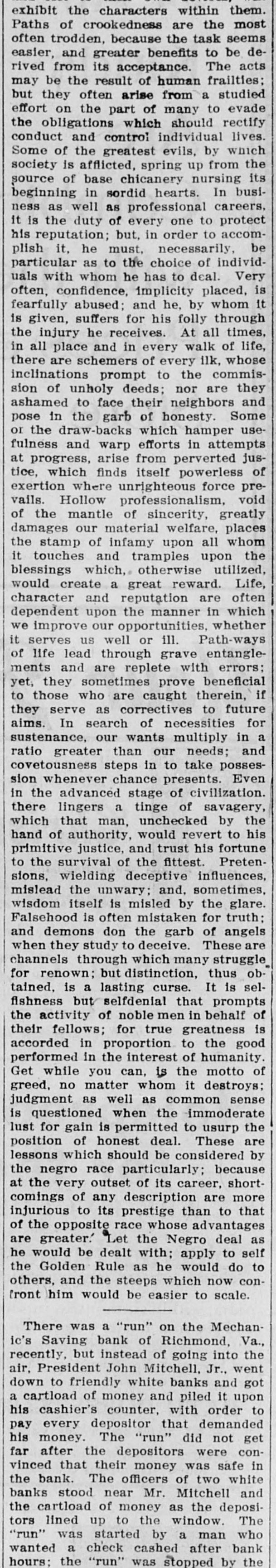 them. exhibit the crookedness characters are within task the seems most often Paths trodden, of greater because benefits the to The be acts deeasier, and acceptance. frailties: rived from its result of human from a studied be the evade may but they the often part arise of many should to rectify effort on which individual lives. the obligations and control evils. by which the conduct greatest from of Some afflicted, nursing society base In source of is the sordid chicanery spring hearts. up careers, busi- its beginning well in as professional one to protect ness as duty of every to accom- be his it is reputation; the but, in necessarily, order individplish it, he as to must, the choice to deal. of Very particular with whom he implicity has placed, is it often, uals fearfully confidence, abused: for and his he, folly by whom through times. given, suffers receives. At all of life, is injury he every walk whose in all place of every are prompt to are inclinations the there schemers and in nor the ilk, commis- they and unholy deeds; neighbors sion of to face their of honesty. Some useashamed pose the in draw-backs the garb efforts which hamper in attempts jusor and warp from perverted at progress, itself where fulness arise powerless pre- of which force exertion tice, Hollow finds unrighteous sincerity, void vails. of places of the mantle material welfare, all whom damages our infamy upon the the it touches stamp of and tramples otherwise upon utilized, Life, blessings which, a great reward. are often would create reputation in which upon the our dependent character and opportunities.th.ways manner ill. whether it we serves improve lead us through well or grave with entangle- errors: ments yet, of life they and who sometimes are are replete caught prove therein, to beneficial future if to those serve as correctives of necessities in for aims. they In search our wants multiply needs; and a sustenance. greater than our to take possession whenever stage of covetousness ratio steps chance in presents. civilization. Even sion advanced of savagery, in there the lingers man, a tinge unchecked revert by to the his which of that authority, would trust his fortune hand primitive justice, and the fittest. influences, Pretento the survival wielding of deceptive and, sometimes. sions, unwary; the glare. mislead wisdom the itself often is misled mistaken by for angels truth: demons don the deceive. These they many and Falsehood when study is to which garb of struggle are obchannels renown; through but distinction, curse. It thus is selfor lasting prompts fishness tained, is but a selfdenial noble men that in behalf of is of greatness their the activity fellows; proportion for true to humanity. the good performed accorded in in the interest is the of motto of while you can, it destroys; no as common judgment as when the greed, Get matter well whom immoderate sense the lust is questioned for gain is permitted deal. to These usurp are position of honest should be considered because by lessons which race particularly; career, shortat the comings the negro very of outset any description of its than are to more that injurious opposite to its race prestige whose Negro advantages deal as of the greater. Let the apply to self are he would be Rule dealt as with; he would now do con- to the Golden the steeps which scale. front others, him and would be easier to was a "run" on Richmond, the Mechan- Va., ic's There Saving but bank instead of of going Jr., into went the recently, President John Mitchell. banks and got air. friendly white it upon down to of money and piled order to a cashier's that demanded his cartload depositor counter, with not get pay every The "run" did were his money. depositors in after the was safe white confar that their money of two vinced The officers Mitchell and the bank. near Mr. deposibanks stood of money as window. the The the cartload lined up to the man who tors was started by a after bank wanted the a "run" was stopped by "run" check cashed the hours: