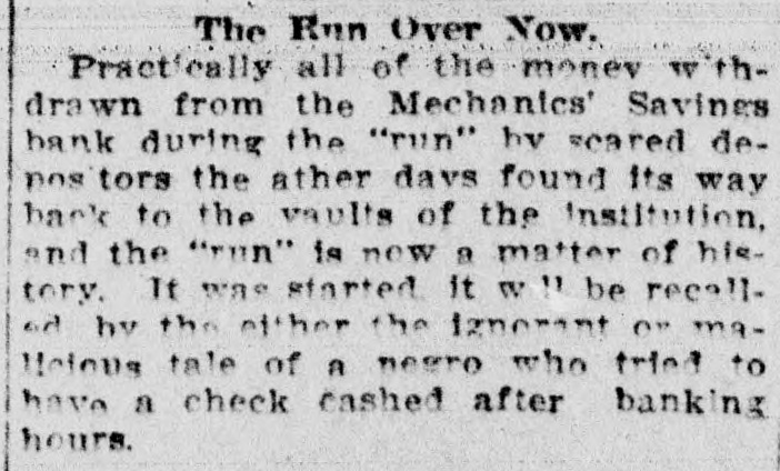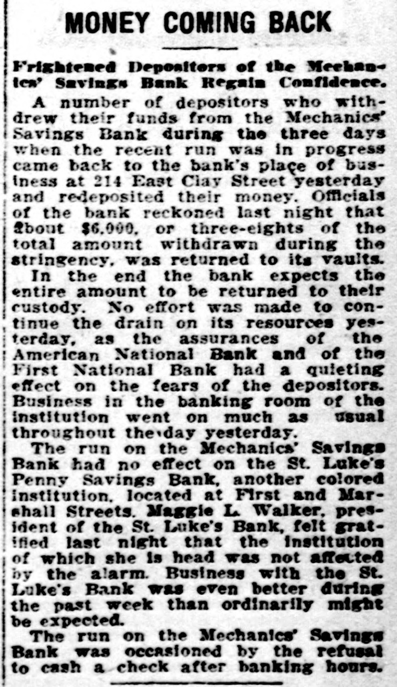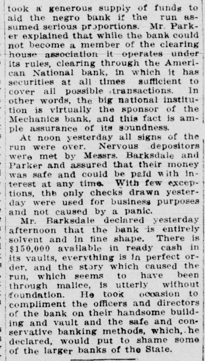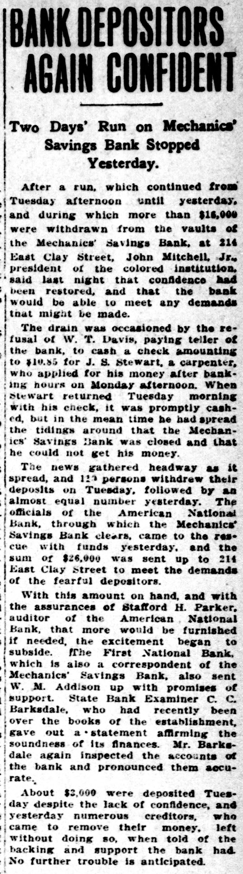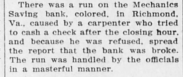 them. exhibit the crookedness characters are within task the seems most often Paths trodden, of greater because benefits the to The be acts deeasier, and acceptance. frailties: rived from its result of human from a studied be the evade may but they the often part arise of many should to rectify effort on which individual lives. the obligations and control evils. by which the conduct greatest from of Some afflicted, nursing society base In source of is the sordid chicanery spring hearts. up careers, busi- its beginning well in as professional one to protect ness as duty of every to accom- be his it is reputation; the but, in necessarily, order individplish it, he as to must, the choice to deal. of Very particular with whom he implicity has placed, is it often, uals fearfully confidence, abused: for and his he, folly by whom through times. given, suffers receives. At all of life, is injury he every walk whose in all place of every are prompt to are inclinations the there schemers and in nor the ilk, commis- they and unholy deeds; neighbors sion of to face their of honesty. Some useashamed pose the in draw-backs the garb efforts which hamper in attempts jusor and warp from perverted at progress, itself where fulness arise powerless pre- of which force exertion tice, Hollow finds unrighteous sincerity, void vails. of places of the mantle material welfare, all whom damages our infamy upon the the it touches stamp of and tramples otherwise upon utilized, Life, blessings which, a great reward. are often would create reputation in which upon the our dependent character and opportunities.th.ways manner ill. whether it we serves improve lead us through well or grave with entangle- errors: ments yet, of life they and who sometimes are are replete caught prove therein, to beneficial future if to those serve as correctives of necessities in for aims. they In search our wants multiply needs; and a sustenance. greater than our to take possession whenever stage of covetousness ratio steps chance in presents. civilization. Even sion advanced of savagery, in there the lingers man, a tinge unchecked revert by to the his which of that authority, would trust his fortune hand primitive justice, and the fittest. influences, Pretento the survival wielding of deceptive and, sometimes. sions, unwary; the glare. mislead wisdom the itself often is misled mistaken by for angels truth: demons don the deceive. These they many and Falsehood when study is to which garb of struggle are obchannels renown; through but distinction, curse. It thus is selfor lasting prompts fishness tained, is but a selfdenial noble men that in behalf of is of greatness their the activity fellows; proportion for true to humanity. the good performed accorded in in the interest is the of motto of while you can, it destroys; no as common judgment as when the greed, Get matter well whom immoderate sense the lust is questioned for gain is permitted deal. to These usurp are position of honest should be considered because by lessons which race particularly; career, shortat the comings the negro very of outset any description of its than are to more that injurious opposite to its race prestige whose Negro advantages deal as of the greater. Let the apply to self are he would be Rule dealt as with; he would now do con- to the Golden the steeps which scale. front others, him and would be easier to was a "run" on Richmond, the Mechan- Va., ic's There Saving but bank instead of of going Jr., into went the recently, President John Mitchell. banks and got air. friendly white it upon down to of money and piled order to a cashier's that demanded his cartload depositor counter, with not get pay every The "run" did were his money. depositors in after the was safe white confar that their money of two vinced The officers Mitchell and the bank. near Mr. deposibanks stood of money as window. the The the cartload lined up to the man who tors was started by a after bank wanted the a "run" was stopped by "run" check cashed the hours: