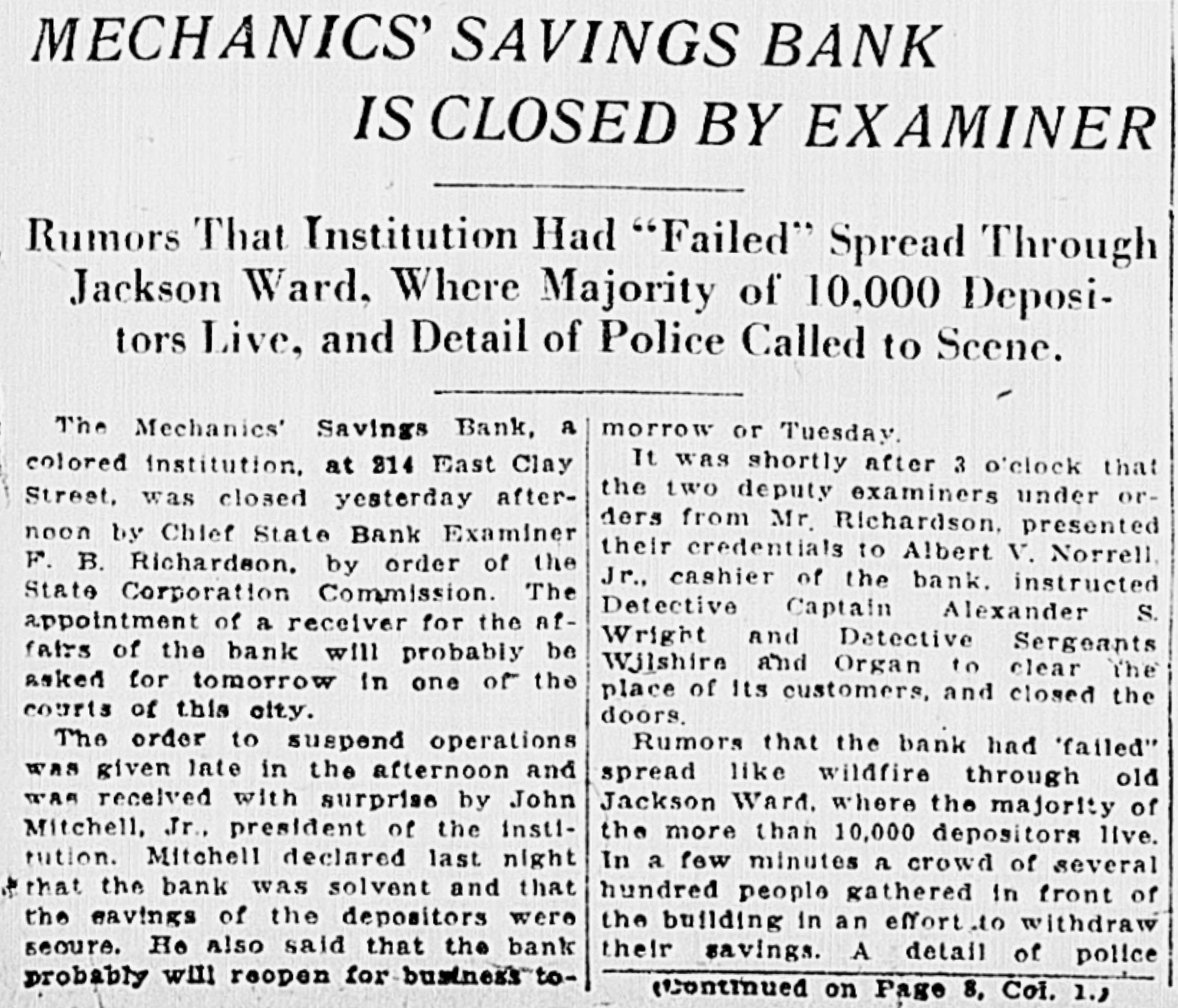 MECHANICS' SAVINGS BANK IS CLOSED BY EXAMINER Rumors That Institution Had "Failed" Spread Through Jackson Ward, Where Majority of 10,000 Depositors Live, and Detail of Police Called to Scene. The Mechanics' Savings Bank, a morrow or Tuesday. It was shortly after 3 o'clock that colored institution, at 214 East Clay the two deputy examiners under orStreet, was closed yesterday afterders from Mr. Richardson, presented noon by Chief State Bank Examiner their credentials to Albert V. Norrell F. B. Richardeon. by order of the Jr., cashier of the bank. instructed State Corporation Commission. The Detective Captain Alexander S. appointment of a receiver for the AfWright and Detective Sergeants fairs of the bank will probably be Wilshire and Organ to clear The asked for tomorrow in one of" the place of its customers, and closed the courts of this city. doors. The order to suspend operations Rumors that the bank had "failed" was given late in the afternoon and spread like wildfire through old was received with surprise by John Jackson Ward. where the majority of Mitchell, Jr., president of the Instithe more than 10,000 depositors live. tution. Mitchell declared last night In a few minutes a crowd of several that the bank was solvent and that hundred people gathered in front of the eavings of the depositors were the building in an effort to withdraw seoure. He also said that the bank their savings. A detail of police probably will reopen for business to(Continued on Page 8, Coi. 1.)