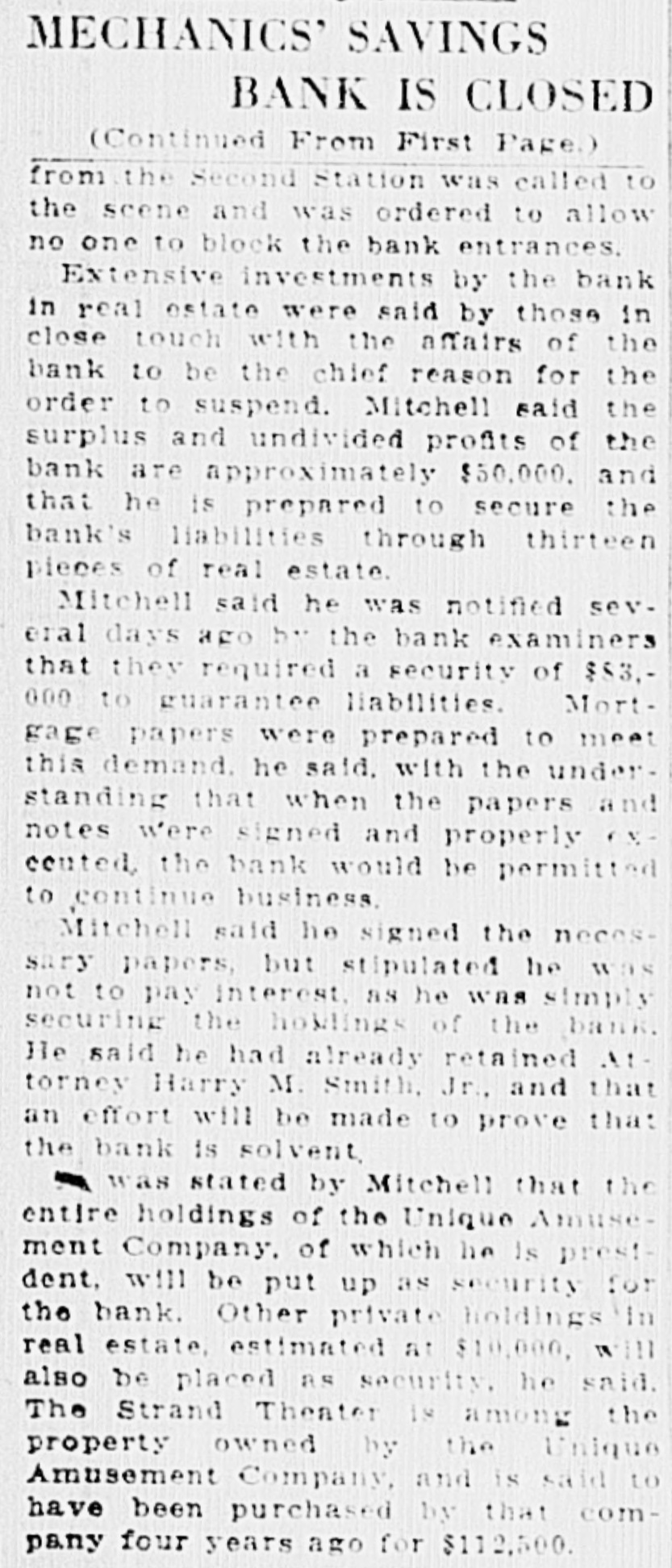MECHANICS' SAVINGS BANK IS CLOSED (Continued From First Page.) from the Second Station was called to the scene and was ordered to allow no one to block the bank entrances. Extensive investments by the bank in real estate were said by those in close touch with the affairs of the bank to be the chief reason for the order to suspend. Mitchell said the surplus and undivided profits of the bank are approximately $50,000. and that he is prepared to secure the bank's liabilities through thirteen pieces of real estate. Mitchell said he was notified several days ago by the bank examiners that they required a security of $83.000 to guarantee liabilities. Mortgage papers were prepared to meet this demand. he said, with the understanding that when the papers and notes were signed and properly ONcented, the bank would be permitted to continue business. Mitchell said he signed the necessury papers, but stipulated he was not to pay interest, as he was simply securing the howlings of the bank. He said he had already retained Attorney Harry M. Smith, Jr., and that an effort will be made to prove that the bank is solvent, was stated by Mitchell that the entire holdings of the Unique Amusement Company. of which he is prestdent, will be put up as security for the bank. Other private holdings in real estate, estimated at $10,000, will also be placed AS security, he said. The Strand Theater is among the property owned by the Unique Amusement Company, and is said to have been purchased by that company four years ago for $112,500.
