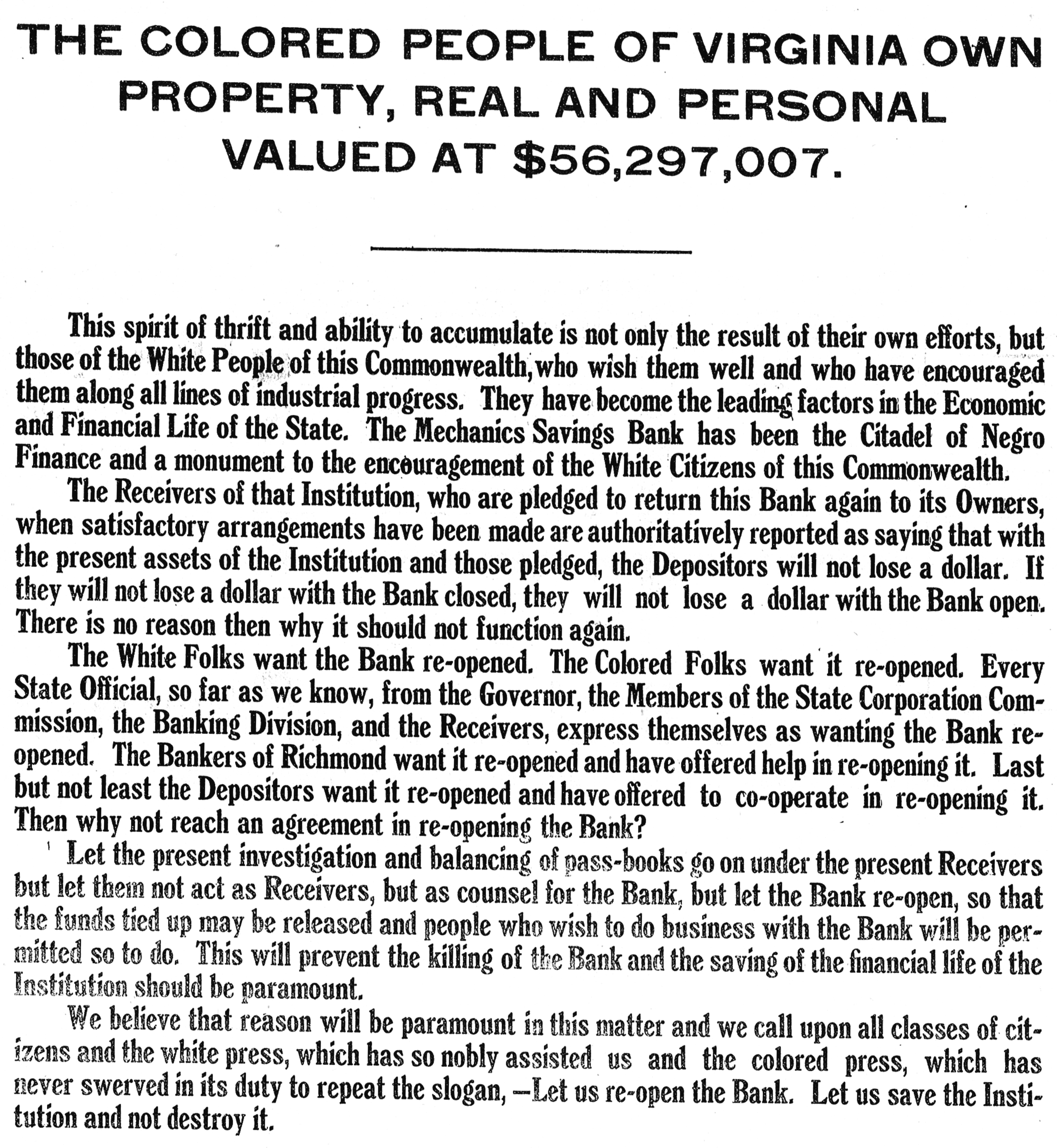 THE COLORED PEOPLE OF VIRGINIA OWN PROPERTY, REAL AND PERSONAL VALUED AT $56,297,007. This spirit of thrift and ability to accumulate is not only the result of their own efforts, but those of the White People of this Commonwealth, who wish them well and who have encouraged them along all lines of industrial progress. They have become the leading factors in the Economic and Financial Life of the State. The Mechanics Savings Bank has been the Citadel of Negro Finance and a monument to the encouragement of the White Citizens of this Commonwealth. The Receivers of that Institution, who are pledged to return this Bank again to its Owners, when satisfactory arrangements have been made are authoritatively reported as saying that with the present assets of the Institution and those pledged, the Depositors will not lose a dollar. If they will not lose a dollar with the Bank closed, they will not lose a dollar with the Bank open. There is no reason then why it should not function again. The White Folks want the Bank re-opened. The Colored Folks want it re-opened. Every State Official, SO far as we know, from the Governor, the Members of the State Corporation Commission, the Banking Division, and the Receivers, express themselves as wanting the Bank reopened. The Bankers of Richmond want it re-opened and have offered help in re-opening it. Last but not least the Depositors want it re-opened and have offered to co-operate in re-opening it. Then why not reach an agreement in re-opening the Bank? Let the present investigation and balancing of pass-books go on under the present Receivers but let them not act as Receivers, but as counsel for the Bank, but let the Bank re-open, SO that the funds tied up may be released and people who wish to do business with the Bank will be permitted SO to do. This will prevent the killing of the Bank and the saving of the financial life of the Institution should be paramount. We believe that reason will be paramount in this matter and we call upon all classes of citizens and the white press, which has SO nobly assisted us and the colored press, which has never swerved in its duty to repeat the slogan, -Let us re-open the Bank. Let us save the Institution and not destroy it.
