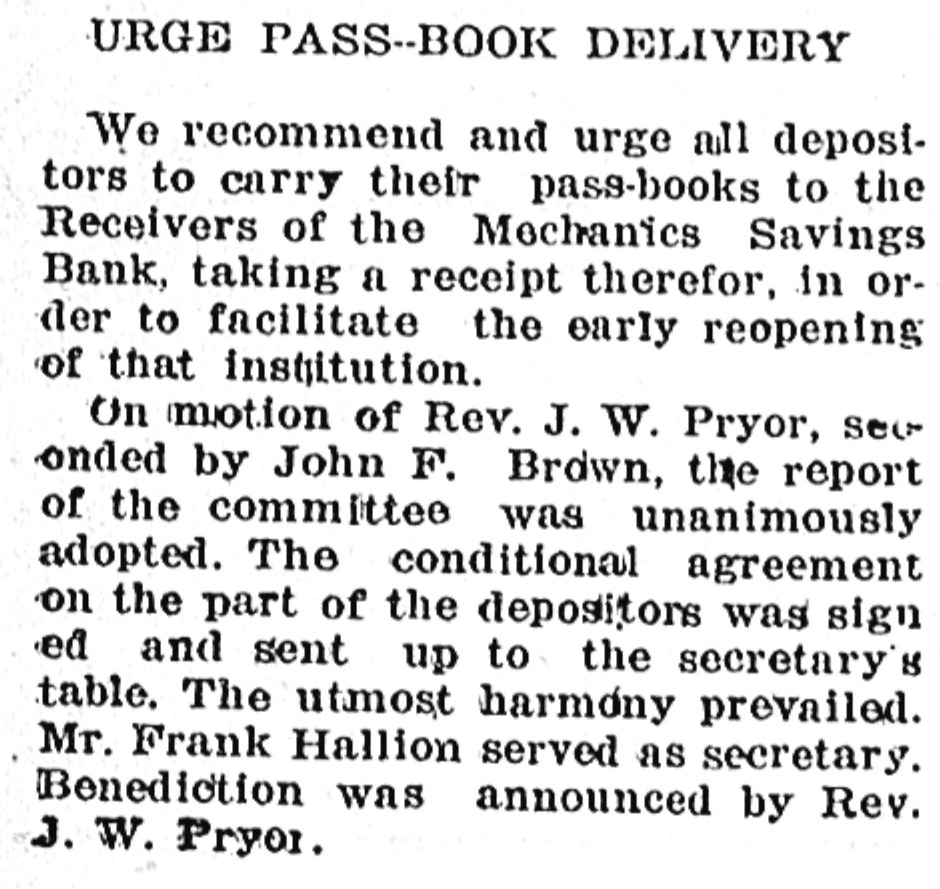 URGE PASS--BOOK DELIVERY We recommend and urge all depositors to carry their pass-books to the Receivers of the Mechanics Savings Bank, taking a receipt therefor, in order to facilitate the early reopening of that institution. On motion of Rev. J. W. Pryor, See onded by John F. Brown, the report of the committee was unanimously adopted. The conditional agreement on the part of the depositors was sign ed and sent up to the secretary's table. The utmost harmony prevailed. Mr. Frank Hallion served as secretary. Benediction was announced by Rev. J.W. Pryor.