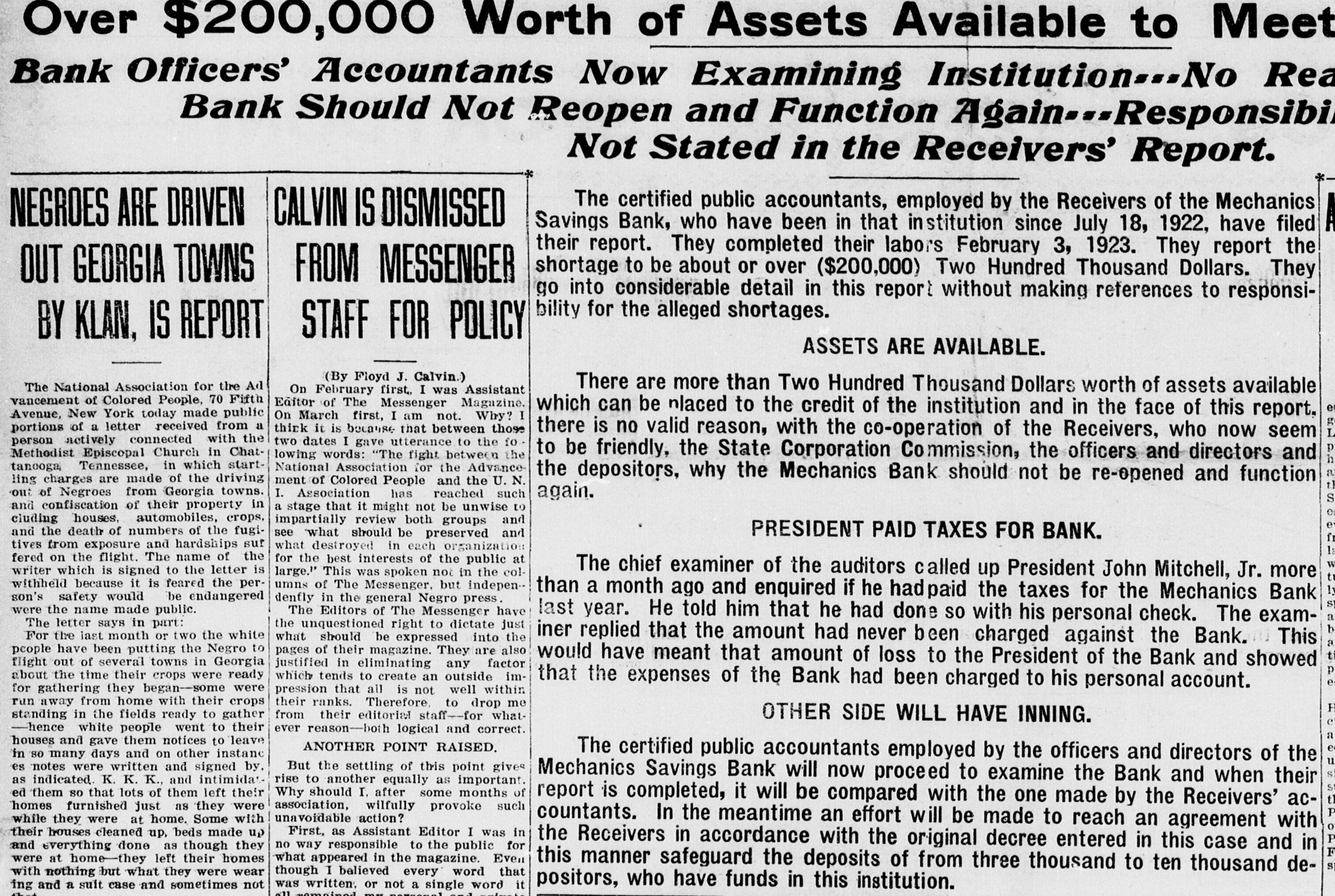 Over $200,000 Worth of Assets Available to Meet Bank Officers' Accountants Now Examining Institution No Rea Bank Should Not Reopen and Function Again..Responsibi Not Stated in the Receivers' Report. The certified public accountants, employed by the Receivers of the Mechanics CALVIN IS DISMISSED NEGROES ARE DRIVEN Savings Bank, who have been in that institution since July 18, 1922, have filed their report. They completed their labors February 3, 1923. They report the shortage to be about or over ($200,000) Two Hundred Thousand Dollars. They OUT GEORGIA TOWNS FROM MESSENGER go into considerable detail in this report without making references to responsibility for the alleged shortages. STAFF FOR POLICY BY KLAN, IS REPORT ASSETS ARE AVAILABLE. (By Floyd J. Calvin.) The National Association for the Ad There are more than Two Hundred Thousand Dollars worth of assets available On February first, I was Assistant vancement of Colored People, 70 Fifth Editor of The Messenger Magazine. which can be nlaced to the credit of the institution and in the face of this report. Avenue, New York today made public On March first, I am not. Why? I think it is because that between those portions of a letter received from a there is no valid reason, with the co-operation of the Receivers, who now seem person actively connected with the two dates I gave utterance to the fo Methodist Episcopal Church in Chatto be friendly, the State Corporation Commission, the officers and directors and lowing words: "The fight between the National Association for the Advancetanooga Tennessee, in which startthe depositors, why the Mechanics Bank should not be re-opened and function ling charges are made of the driving ment of Colored People and the U. N. I. Association has reached such out of Negroes from Georgia towns. again. and confiscation of their property in a stage that it might not be unwise to cluding houses, automobiles, crops, impartially review both groups and and the death of numbers of the fugiPRESIDENT PAID TAXES FOR BANK. see what should be preserved and tives from exposure and hardships suf what destroyed in each organization fered on the flight. The name of the for the best interests of the public at writer which is signed to the letter is large." This was spoken not in the colThe chief examiner of the auditors called up President John Mitchell, Jr. more withheld because it is feared the perumns of The Messenger, but indepenly than a month ago and enquired if he had paid the taxes for the Mechanics Bank son's safety would be endangered dently in the general Negro press. were the name made public. The Editors of The Messenger have last year. He told him that he had done so with his personal check. The examThe letter says in part: the unquestioned right to dictate just For the last month or two the white what should be expressed into the iner replied that the amount had never been charged against the Bank. This people have been putting the Negro to pages of their magazine. They are also would have meant that amount of loss to the President of the Bank and showed flight out of several towns in Georgia justified in eliminating any factor about the time their crops were ready which tends to create an outside imthat the expenses of the Bank had been charged to his personal account. for gathering they began-some were pression that all is not well within run away from home with their crops their ranks. Therefore, to drop me from their editorial staff--fot whatstanding in the fields ready to gather OTHER SIDE WILL HAVE INNING. -hence white people went to their ever reason-both logical and correct. houses and gave them notices to leave ANOTHER POINT RAISED. in so many days and on other instanc The certified public accountants employed by the officers and directors of the es notes were written and signed by, But the settling of this point gives Mechanics Savings Bank will now proceed to examine the Bank and when their as indicated. K. K. K., and intimida:rise to another equally as important. ed them SO that lots of them left their Why should I. after some months of report is completed, it will be compared with the one made by the Receivers' achomes furnished just as they were association, wilfully provoke such unavoidable action? while they were at home. Some with countants. In the meantime an effort will be made to reach an agreement with First, as Assistant Editor I was in their houses cleaned up, beds made up the Receivers in accordance with the original decree entered in this case and in no way responsible to the public for and everything done as though they F what appeared in the magazine. Even were at home-they left their homes s this manner safeguard the deposits of from three thousand to ten thousand dethough I believed every word that with nothing but what they were wear positors, who have funds in this institution. was written. or not a single word it ing and a suit case and sometimes not
