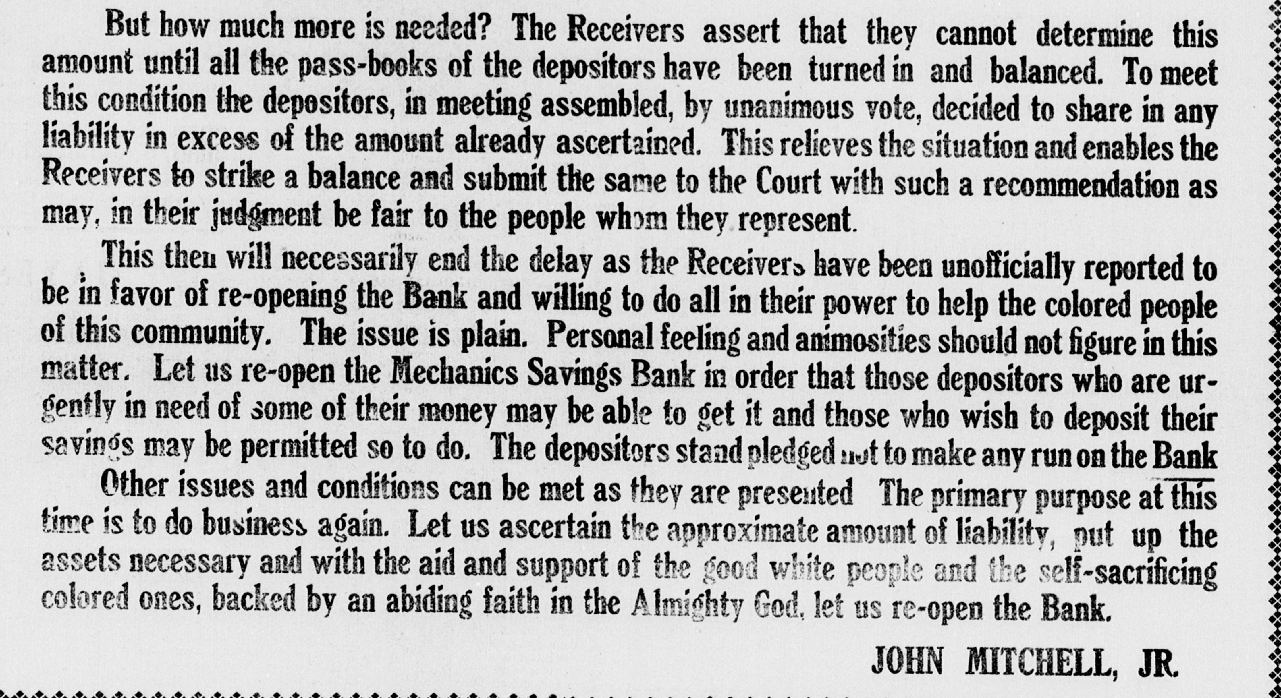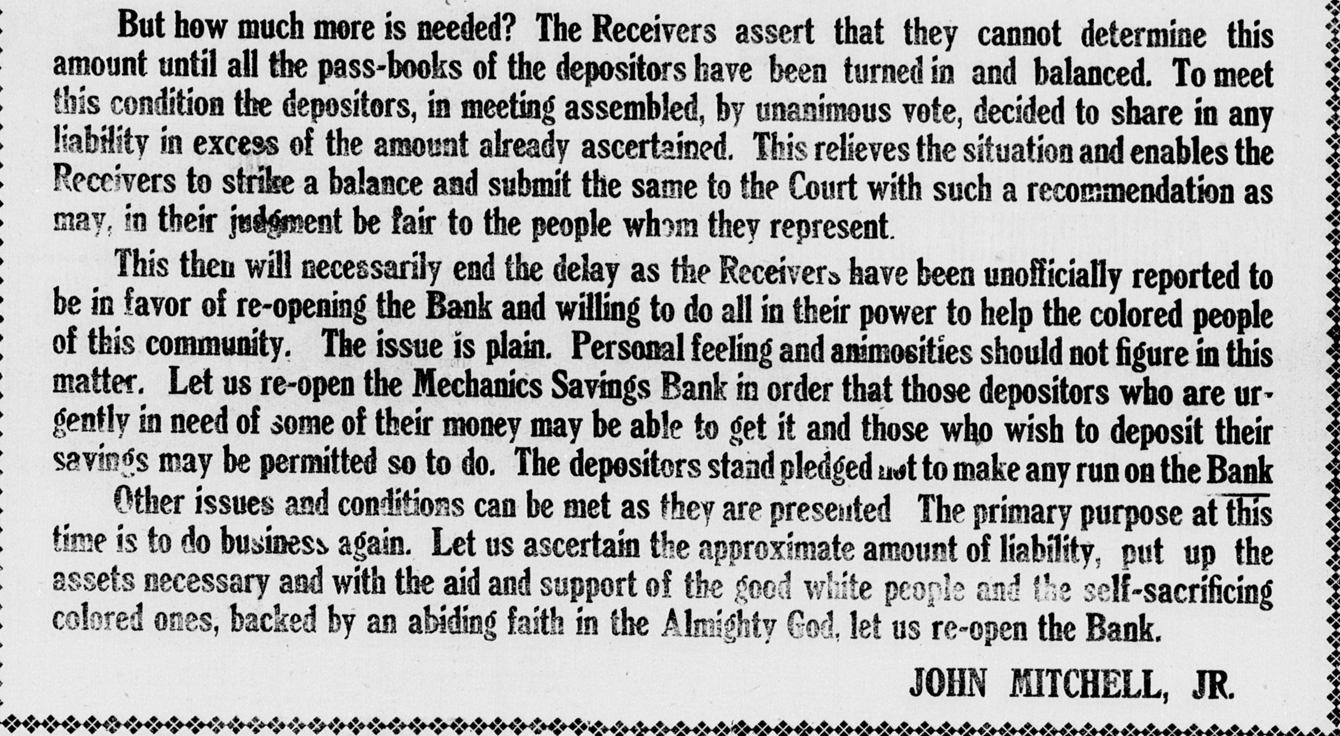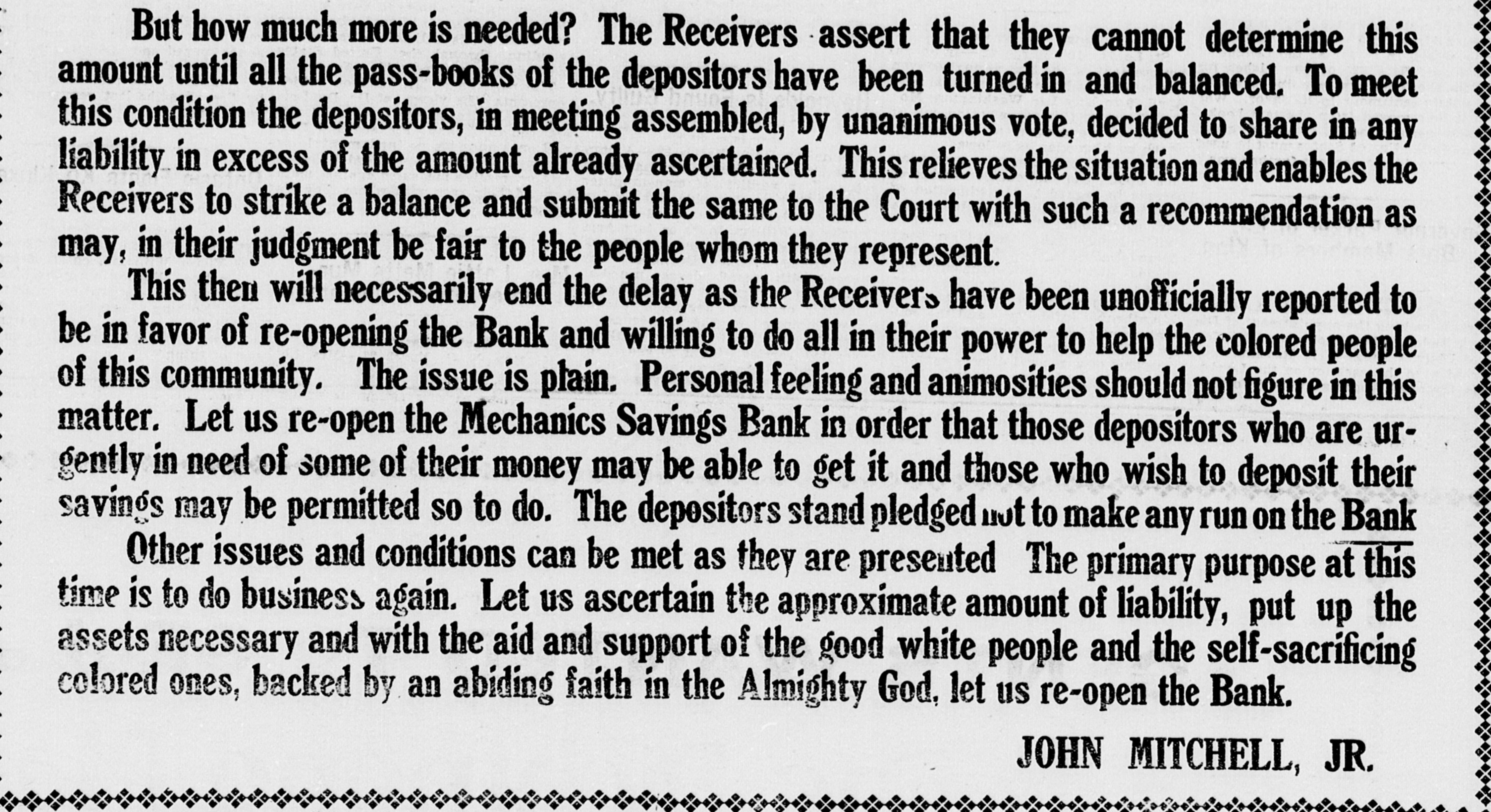 But how much more is needed? The Receivers assert that they cannot determine this amount until all the pass-books of the depositors have been turned in and balanced. To meet this condition the depositors, in meeting assembled, by unanimous vote, decided to share in any liability in excess of the amount already ascertained. This relieves the situation and enables the Receivers to strike a balance and submit the same to the Court with such a recommendation as may, in their judgment be fair to the people whom they represent. This then will necessarily end the delay as the Receivers have been unofficially reported to be in favor of re-opening the Bank and willing to do all in their power to help the colored people of this community. The issue is plain. Personal feeling and animosities should not figure in this matter. Let us re-open the Mechanics Savings Bank in order that those depositors who are urgently in need of some of their money may be able to get it and those who wish to deposit their savings may be permitted so to do. The depositors stand pledged not to make any run on the Bank Other issues and conditions can be met as they are presented The primary purpose at this time is to do business again. Let us ascertain the approximate amount of liability, put up the assets necessary and with the aid and support of the good white people and the self-sacrificing colored ones, backed by an abiding faith in the Almighty God, let us re-open the Bank. JOHN MITCHELL, JR.
