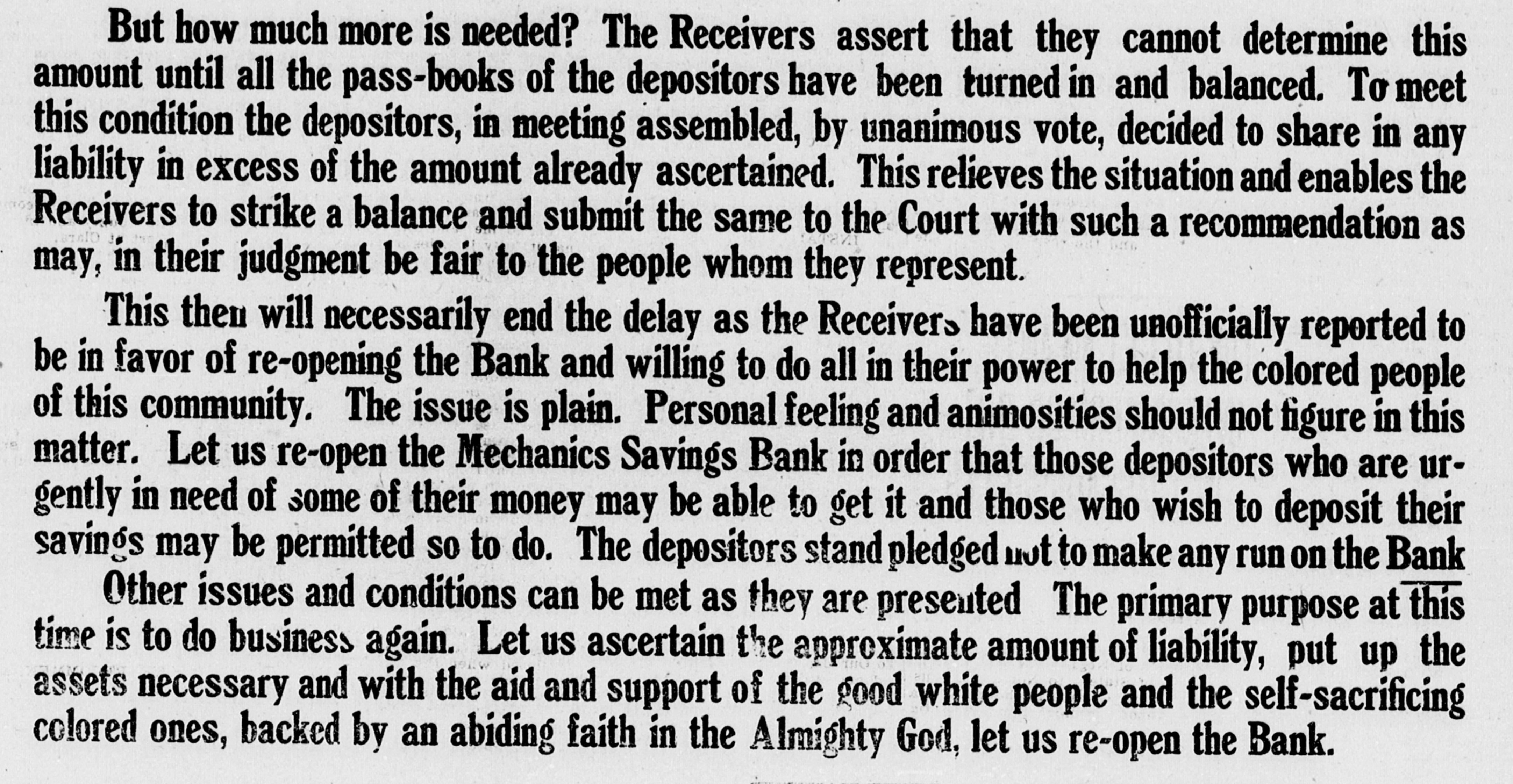 But how much more is needed? The Receivers assert that they cannot determine this amount until all the pass-books of the depositors have been turned in and balanced. To meet this condition the depositors, in meeting assembled, by unanimous vote, decided to share in any liability in excess of the amount already ascertained. This relieves the situation and enables the Receivers to strike a balance and submit the same to the Court with such a recommendation as may, in their judgment be fair to the people whom they represent. This then will necessarily end the delay as the Receivers have been unofficially reported to be in favor of re-opening the Bank and willing to do all in their power to help the colored people of this community. The issue is plain. Personal feeling and animosities should not figure in this matter. Let us re-open the Mechanics Savings Bank in order that those depositors who are urgently in need of some of their money may be able to get it and those who wish to deposit their savings may be permitted SO to do. The depositors stand pledged not to make any run on the Bank Other issues and conditions can be met as they are presented The primary purpose at this time is to do business again. Let us ascertain the approximate amount of liability, put up the assets necessary and with the aid and support of the good white people and the self-sacrificing colored ones, backed by an abiding faith in the Almighty God, let us re-open the Bank.