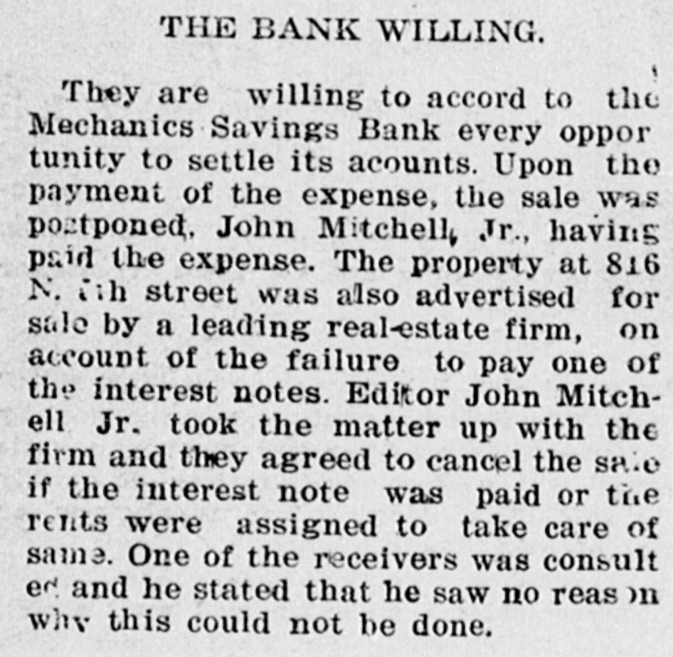 THE BANK WILLING. They are willing to accord to the Mechanics Savings Bank every oppor tunity to settle its acounts. Upon the payment of the expense, the sale was postponed, John Mitchell, Jr., having paid the expense. The property at 816 N. ih street was also advertised for sale by a leading real-estate firm, on account of the failure to pay one of the interest notes. Editor John Mitchell Jr. took the matter up with the firm and they agreed to cancel the sale if the interest note was paid or the rents were assigned to take care of same. One of the receivers was consult ed and he stated that he saw no reas on why this could not be done.
